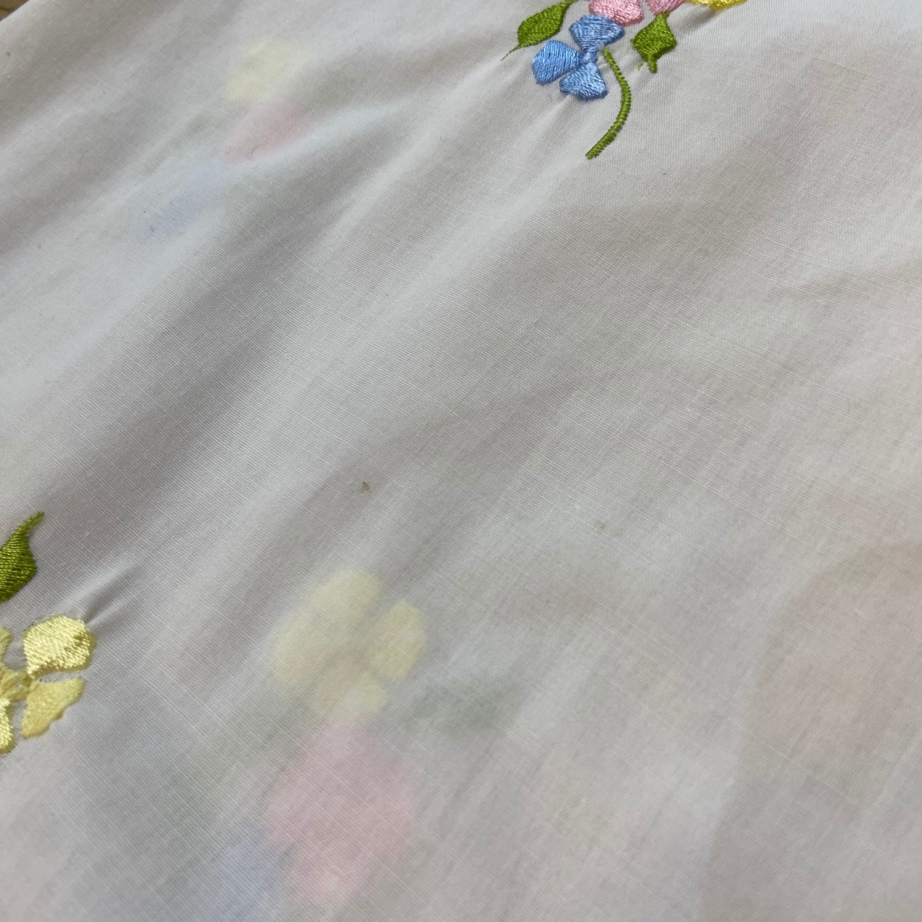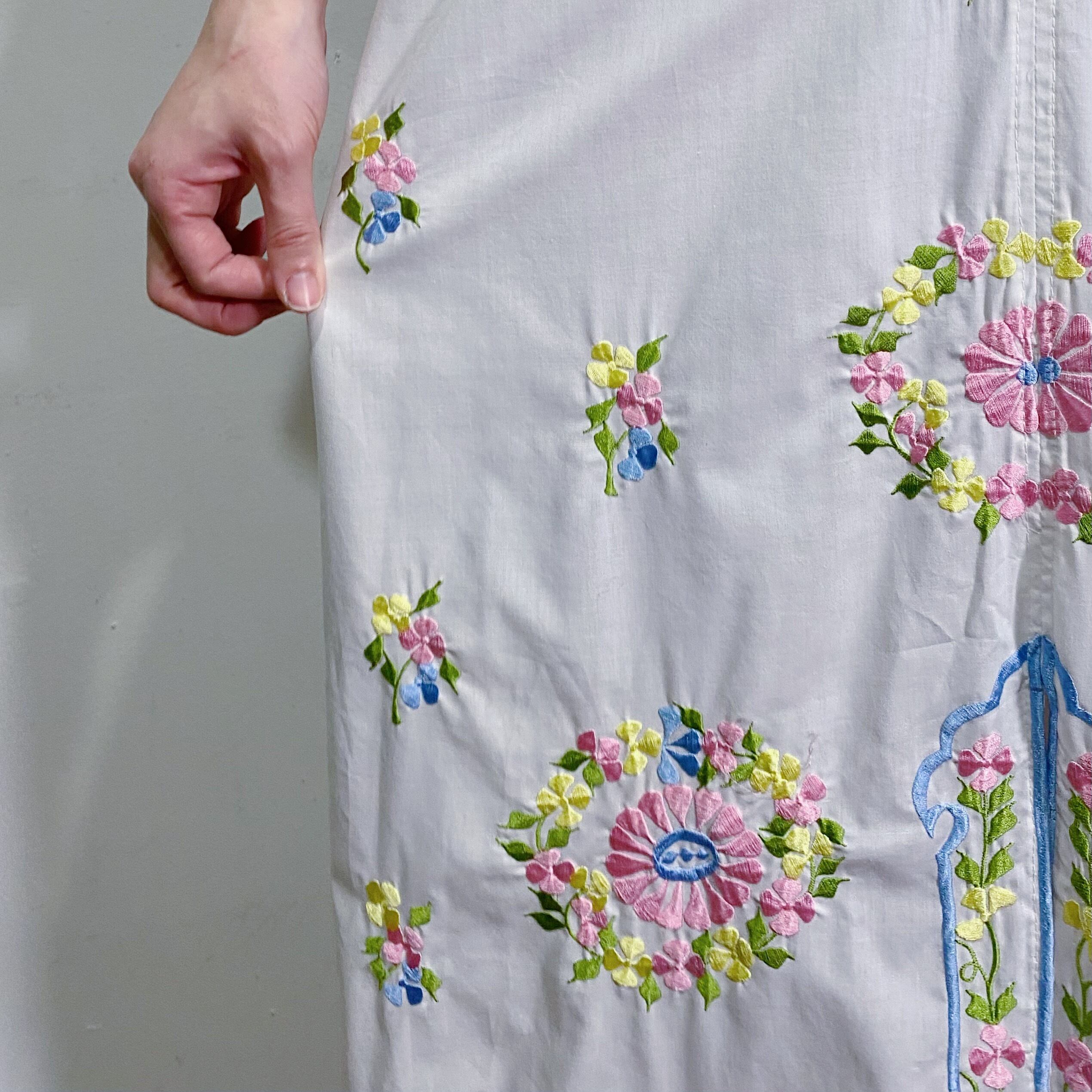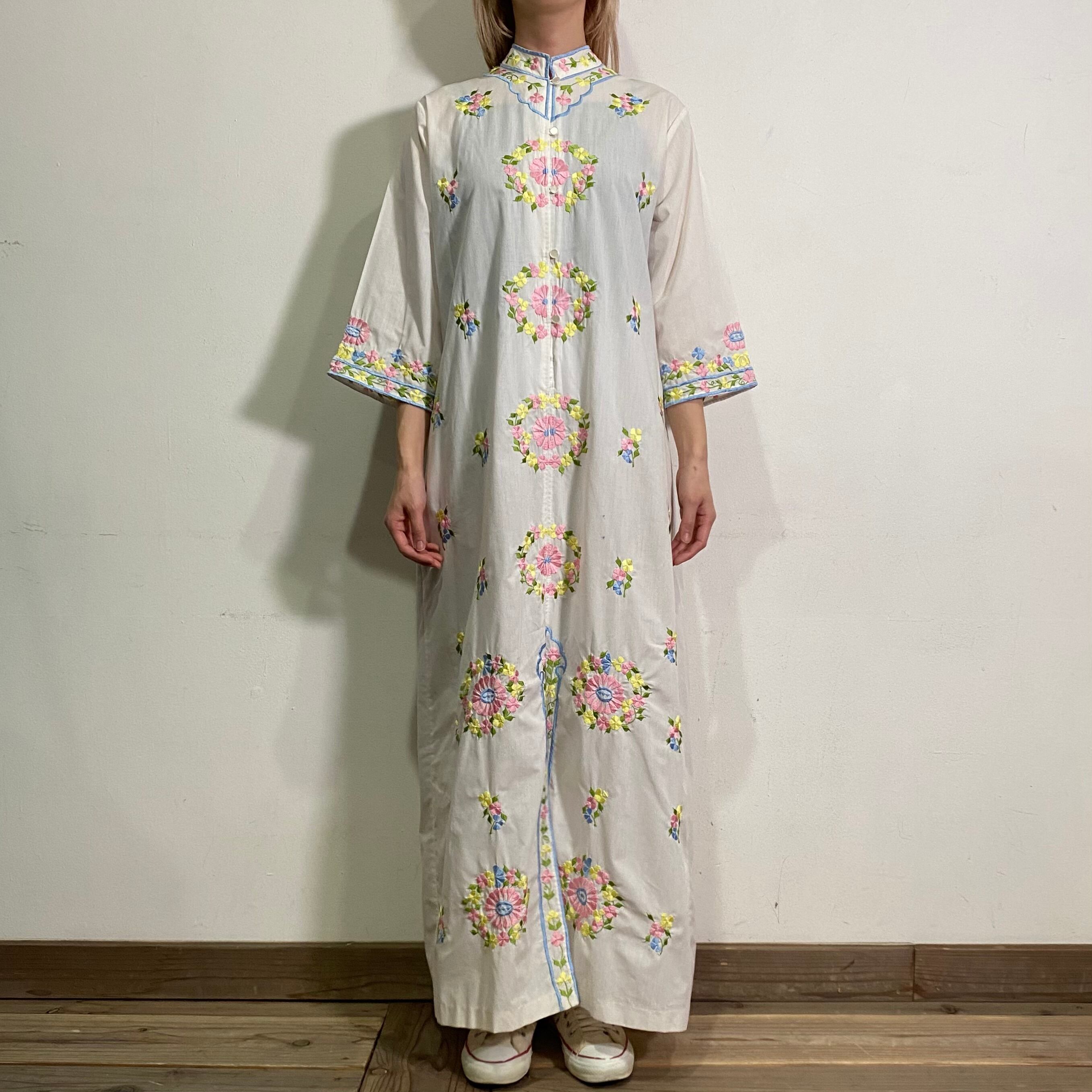 パステルカラーの華やかなお花のフィリピン刺繍がとっても可愛い、70年代のロングワンピースです。