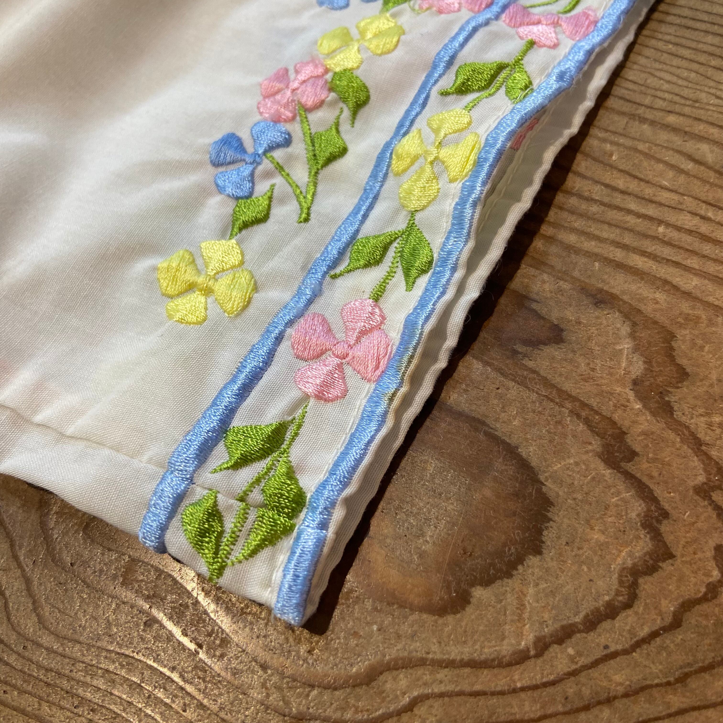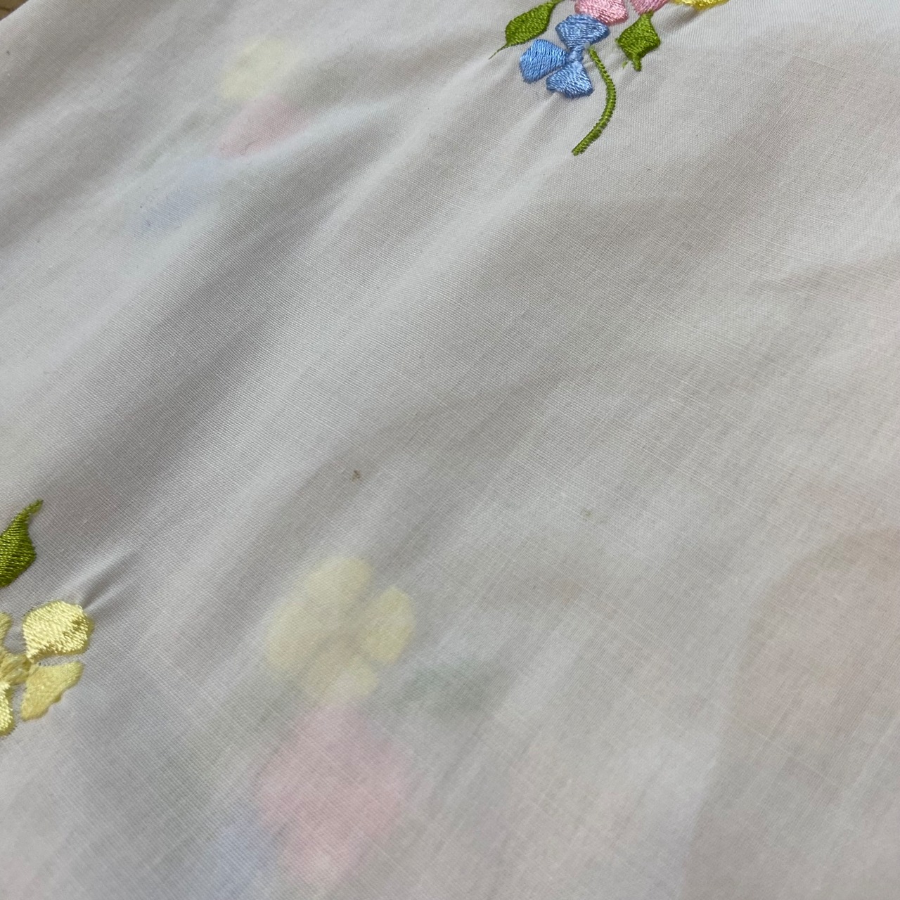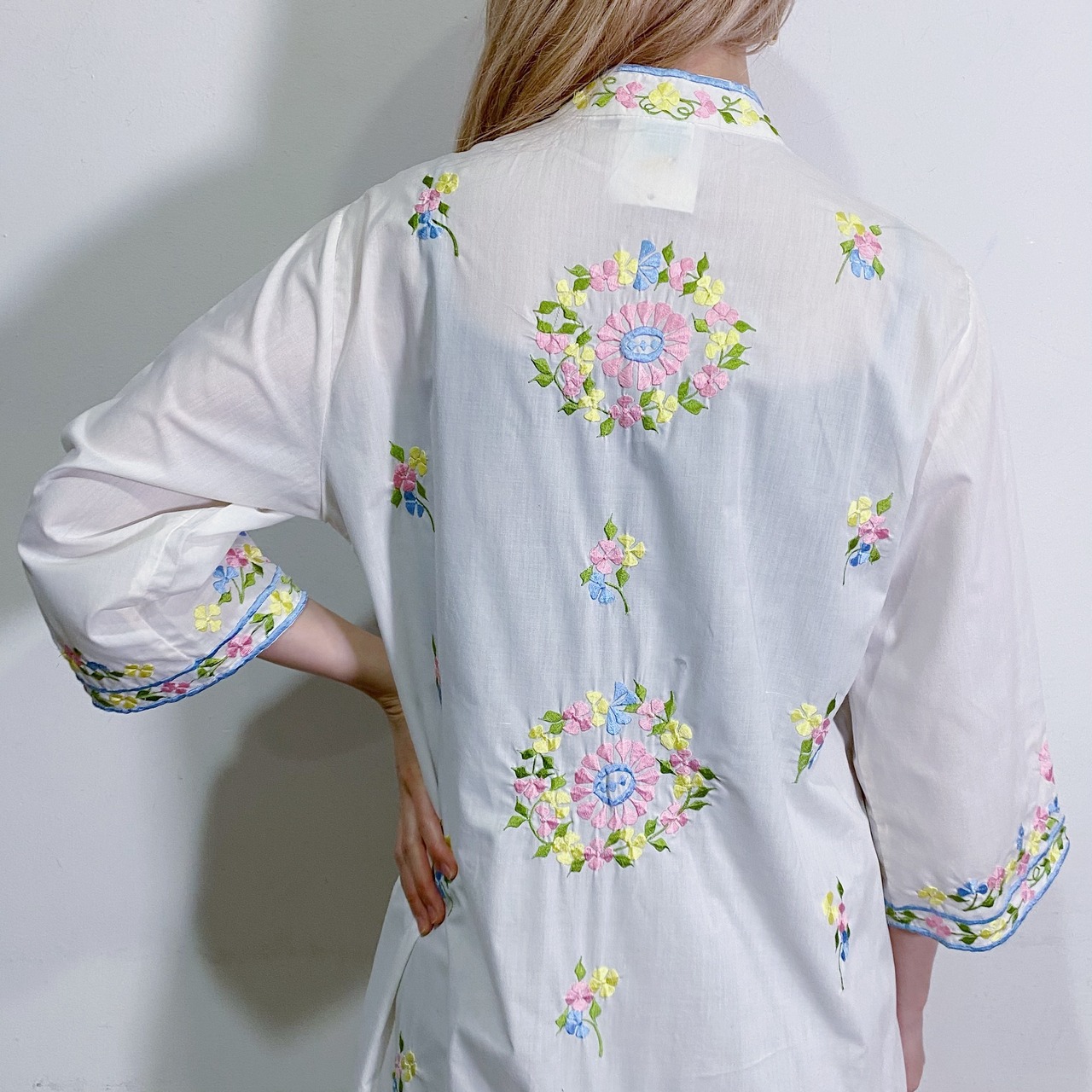 パステルカラーの華やかなお花のフィリピン刺繍がとっても可愛い、70年代のロングワンピースです。