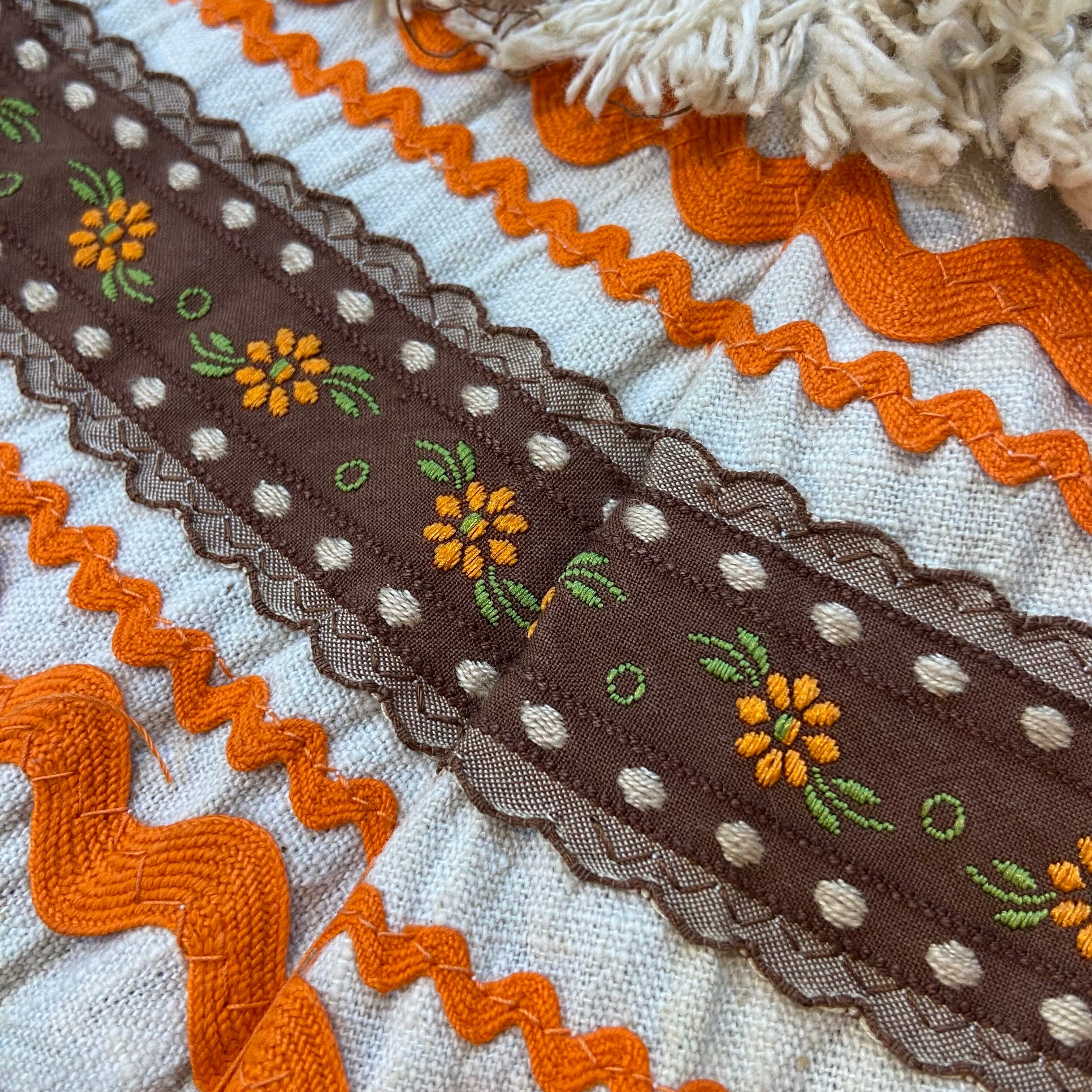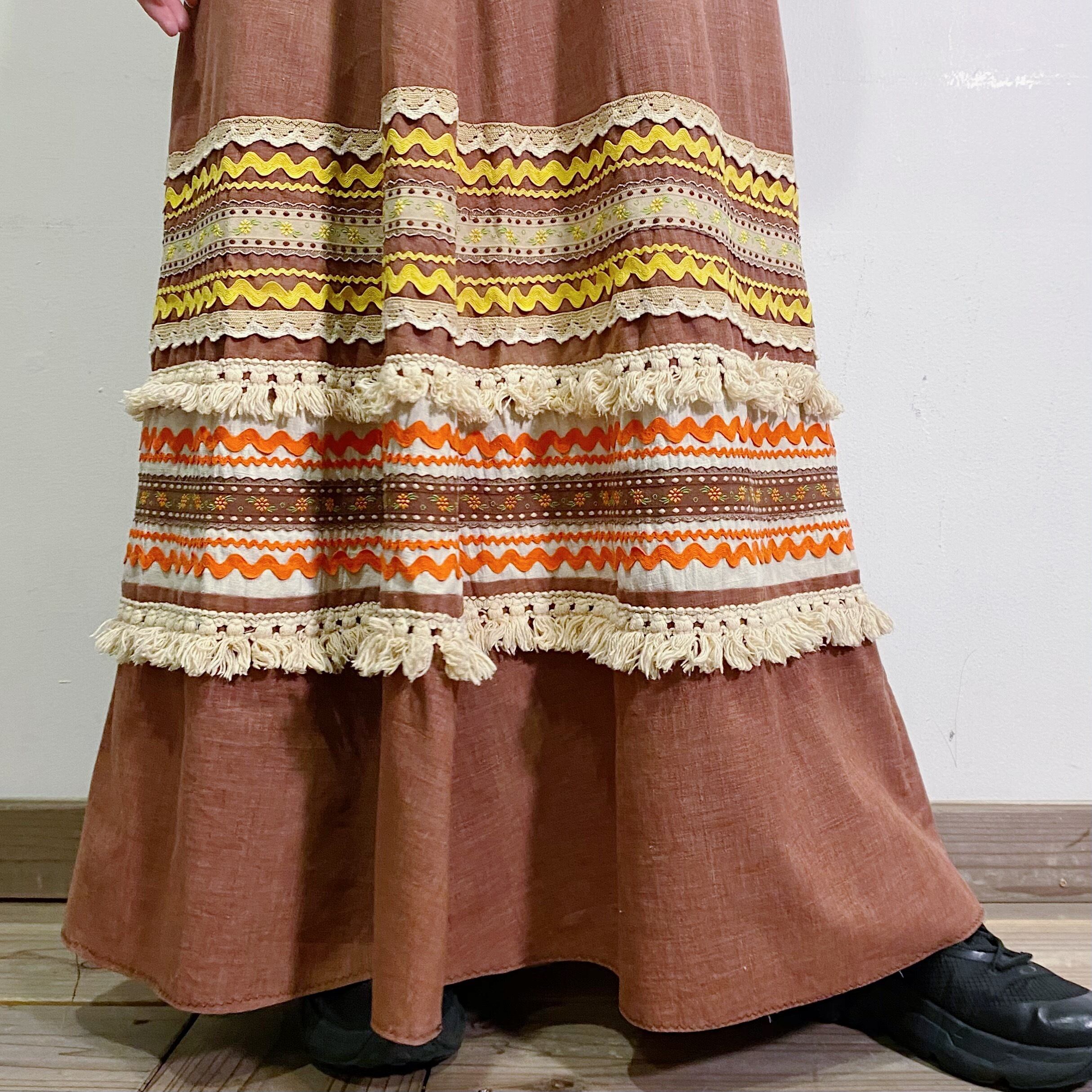 チロルテープや山道テープ・フリンジの装飾がとっても可愛い、70年代のロングスカートです。