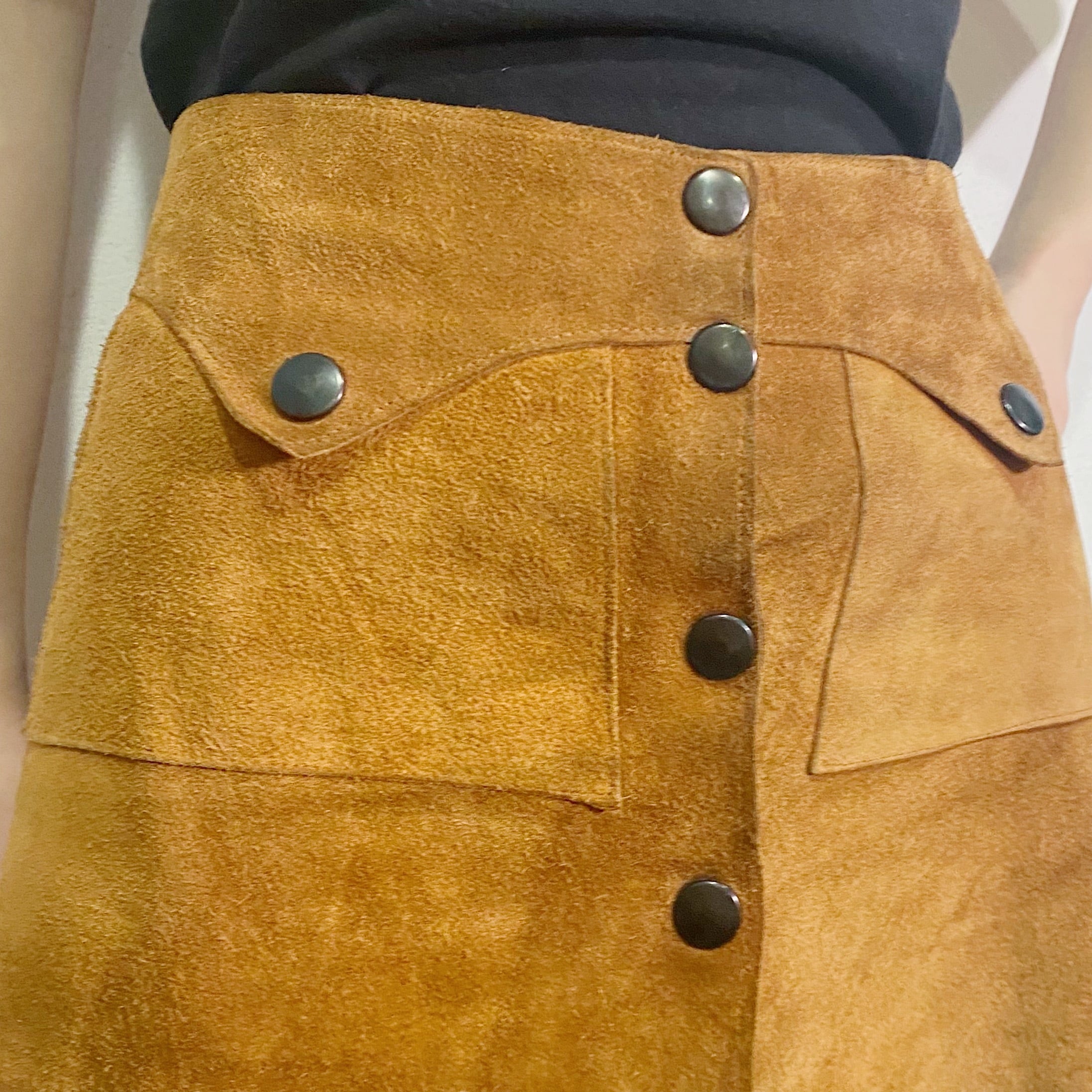 キャメルカラーで着こなしやすい、レザーのミニスカートです。