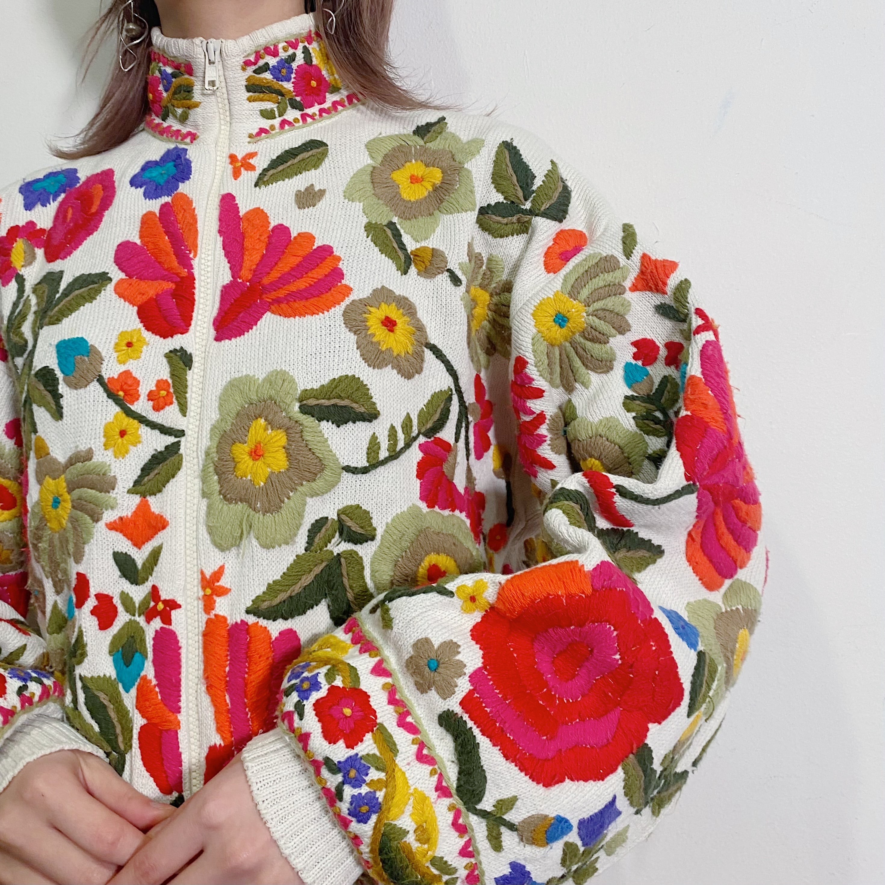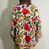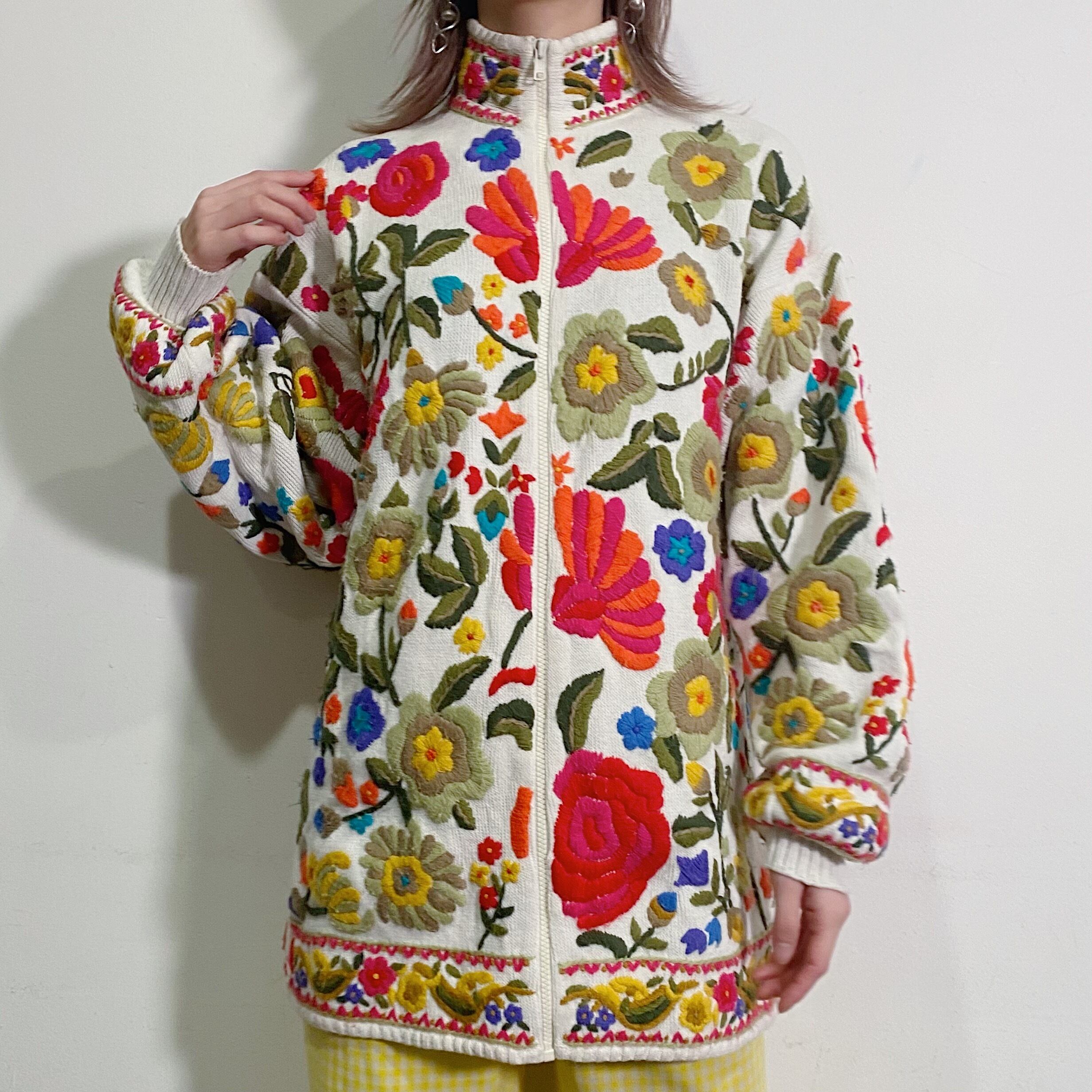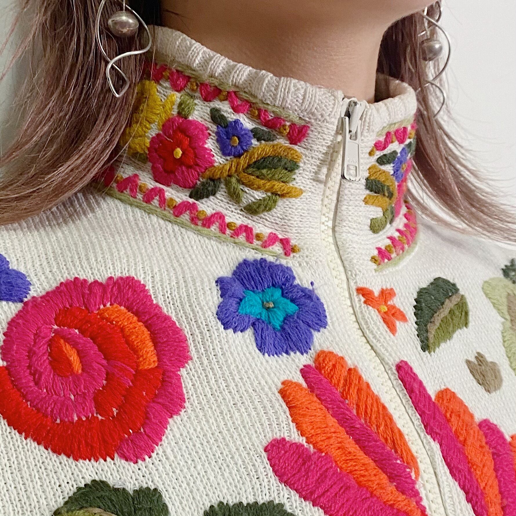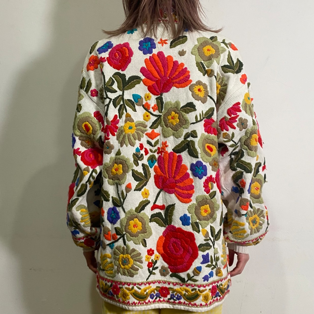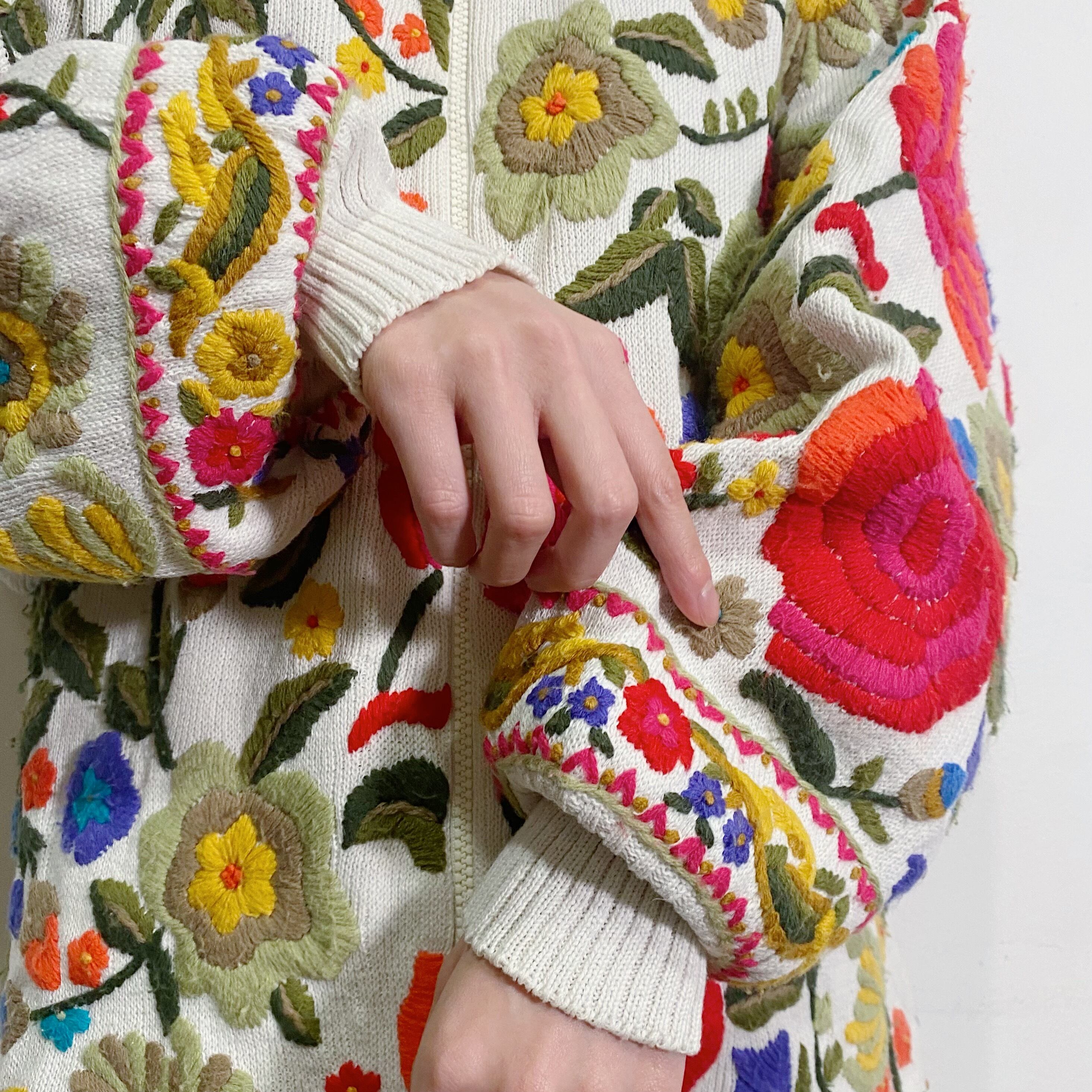 とてもカラフルで華やかな、まるで一枚の絵のようなデザインが魅力のニットジャケットです。
