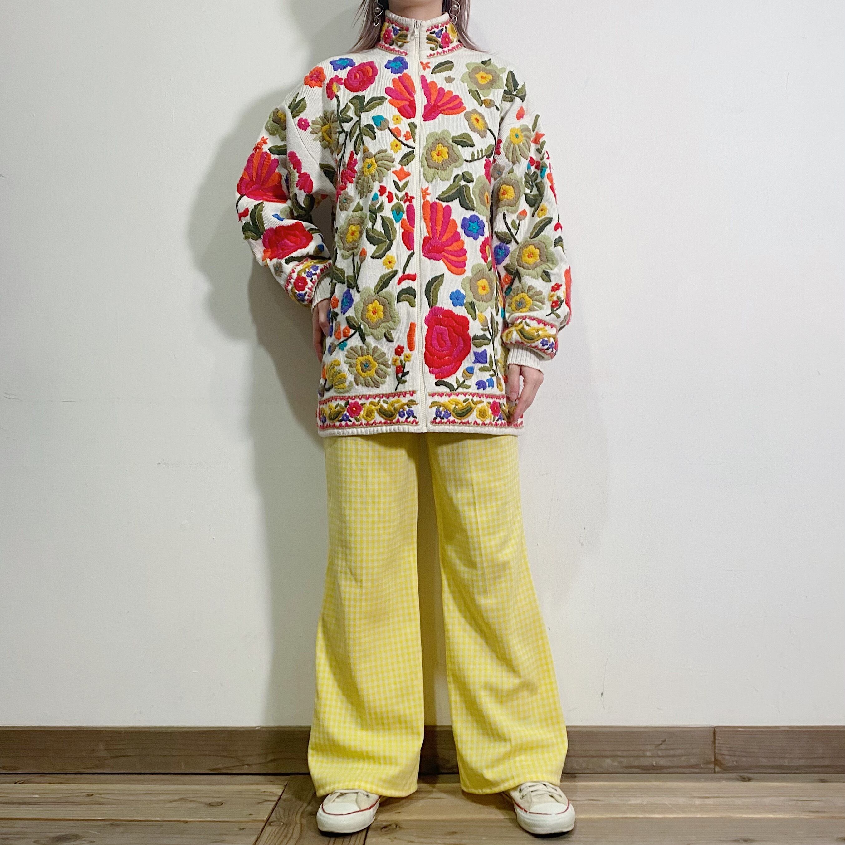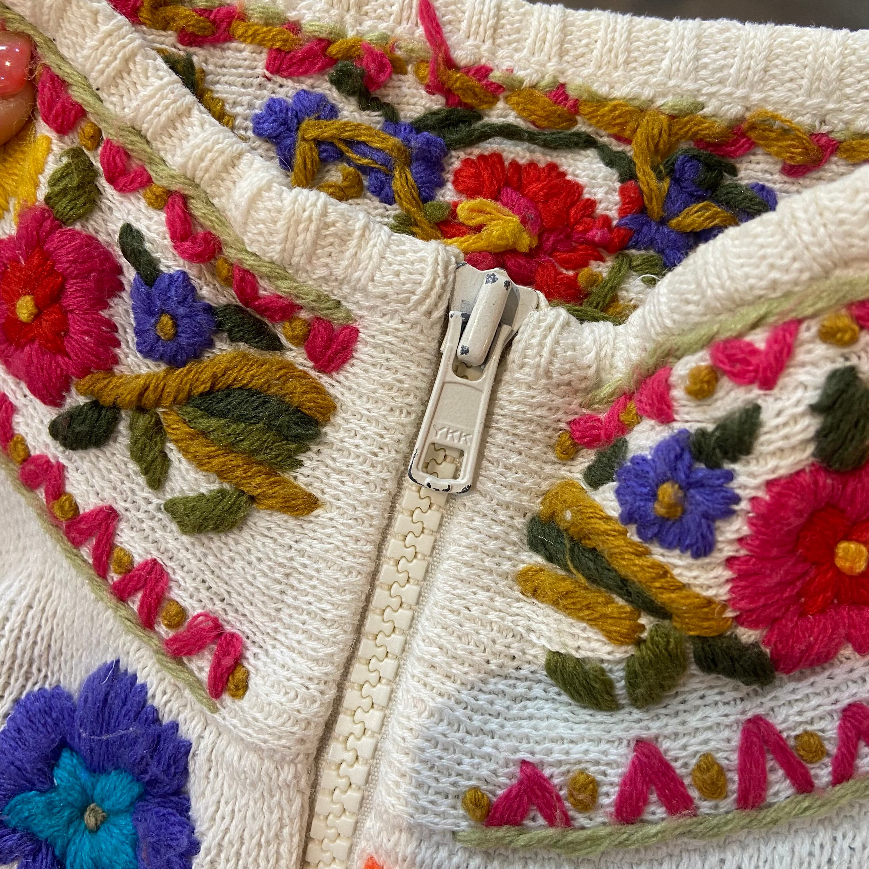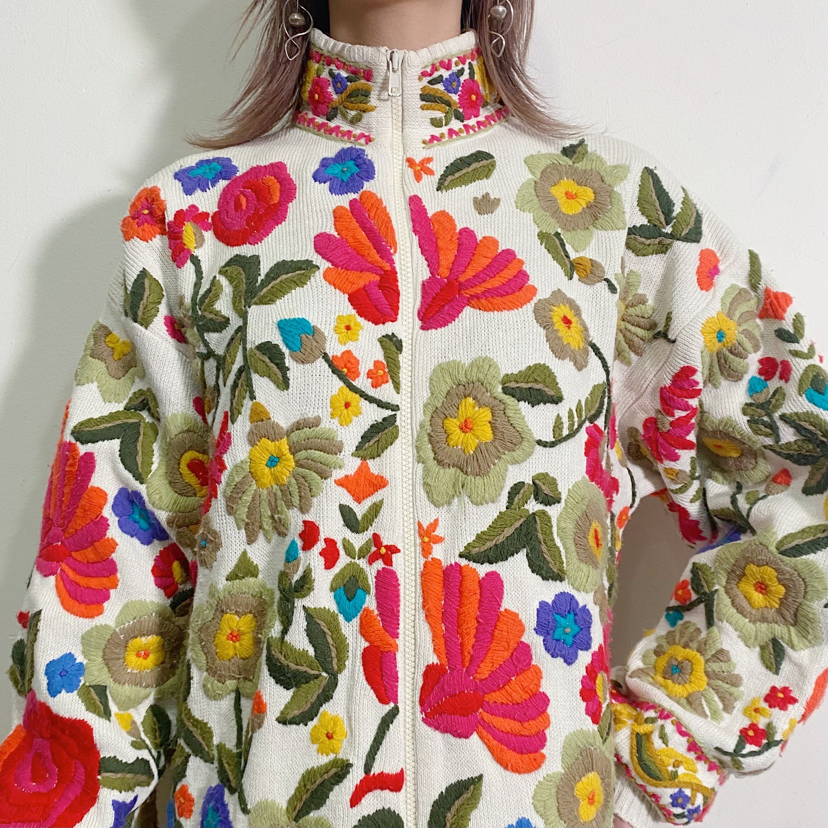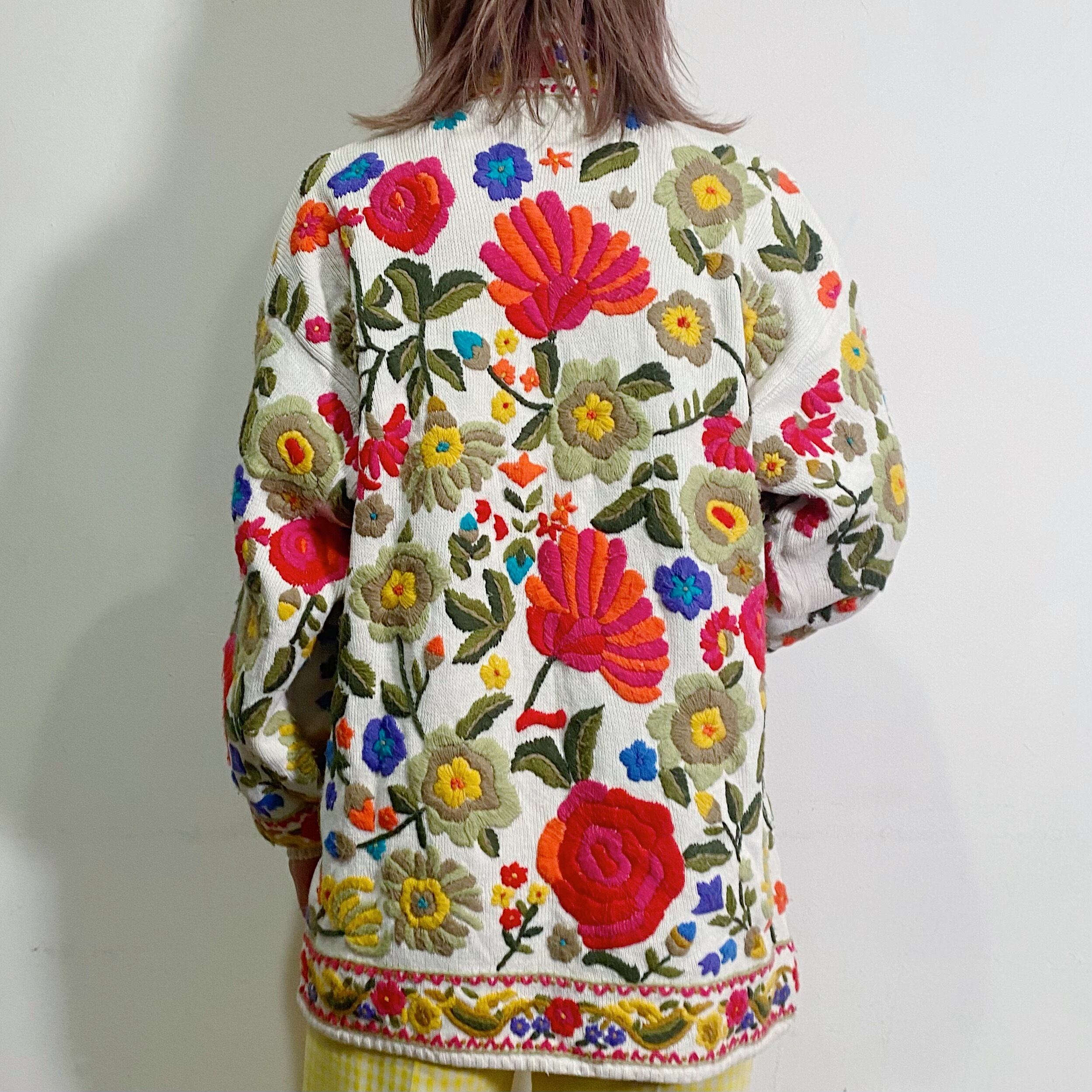 とてもカラフルで華やかな、まるで一枚の絵のようなデザインが魅力のニットジャケットです。