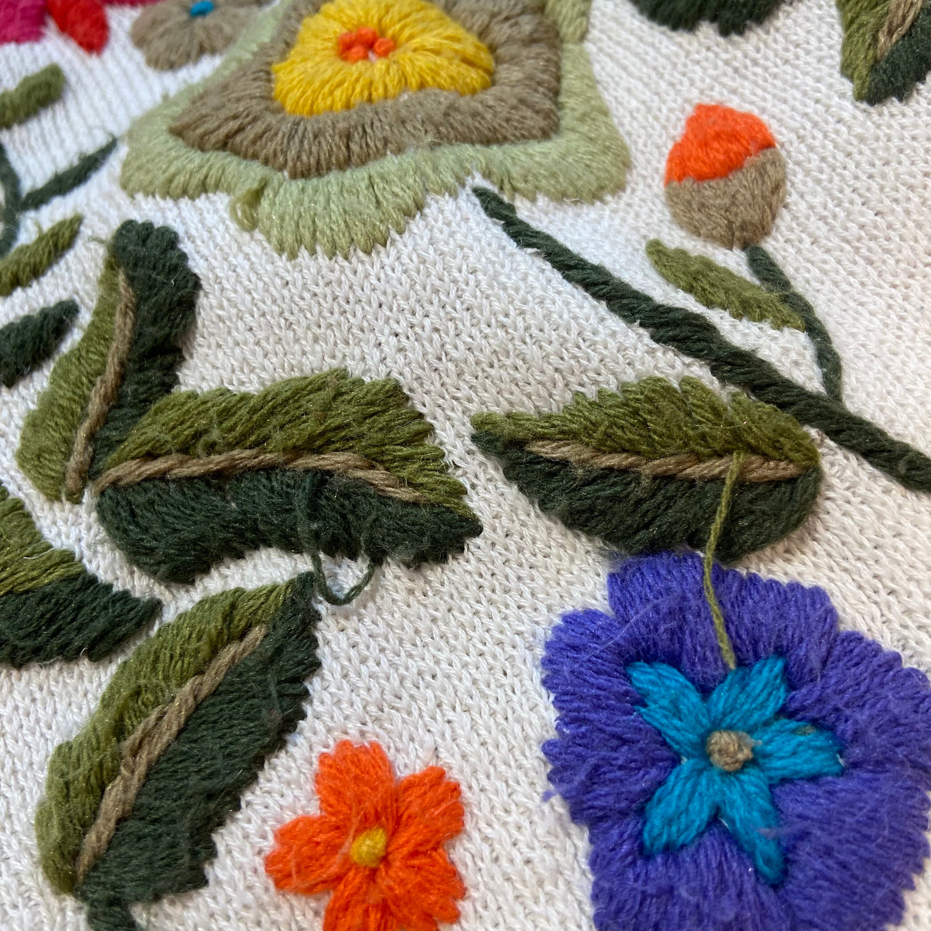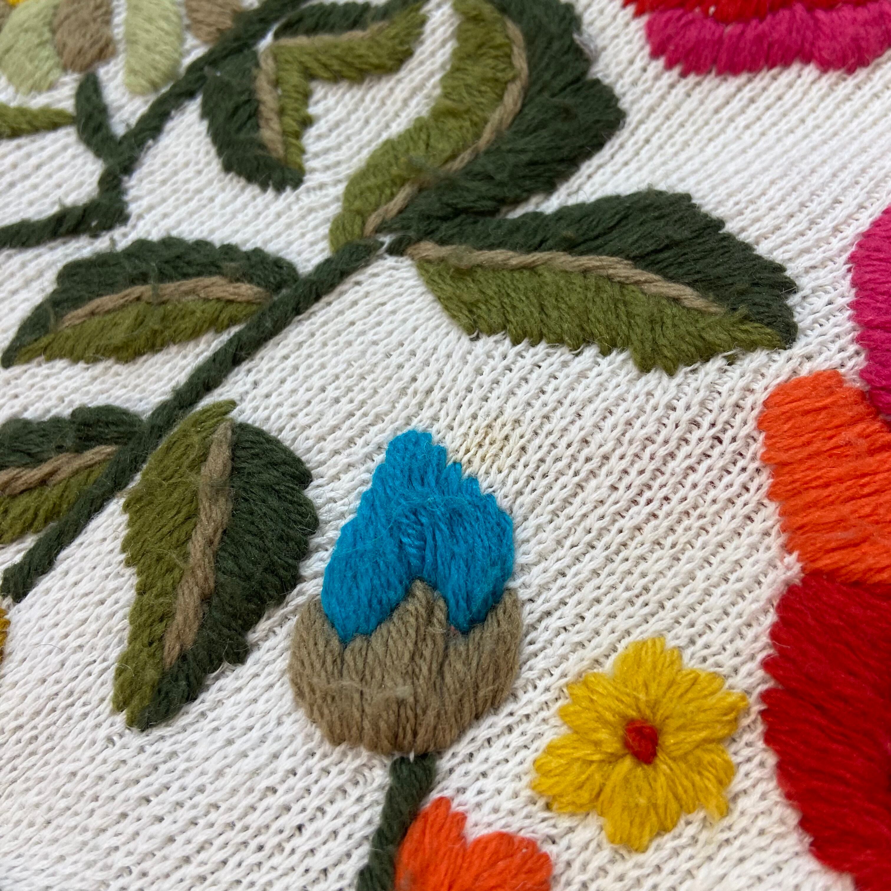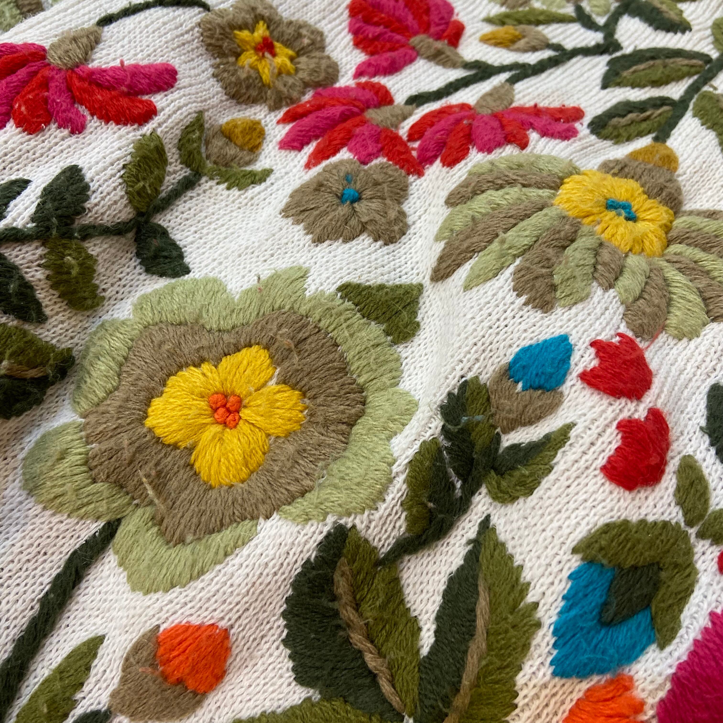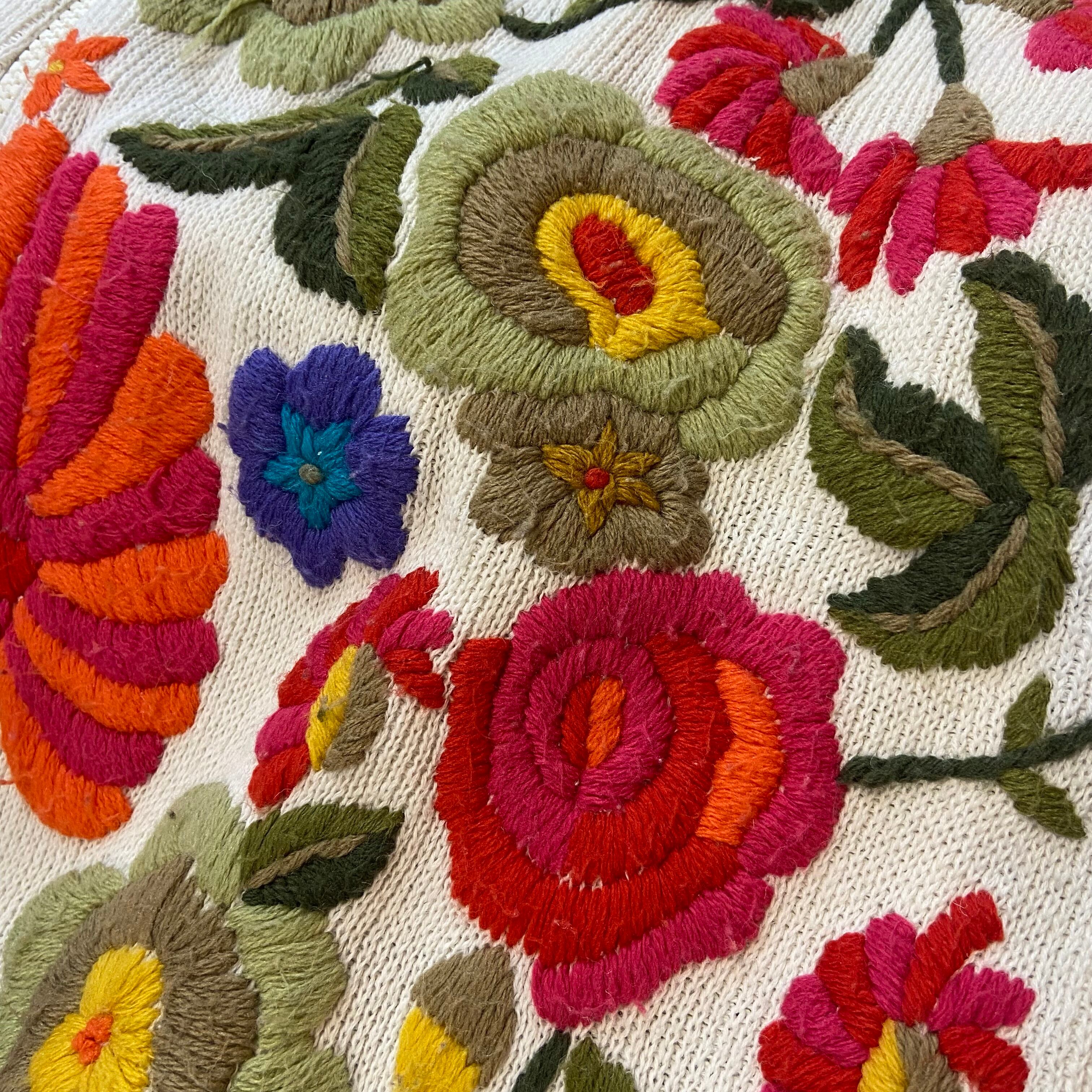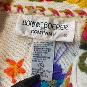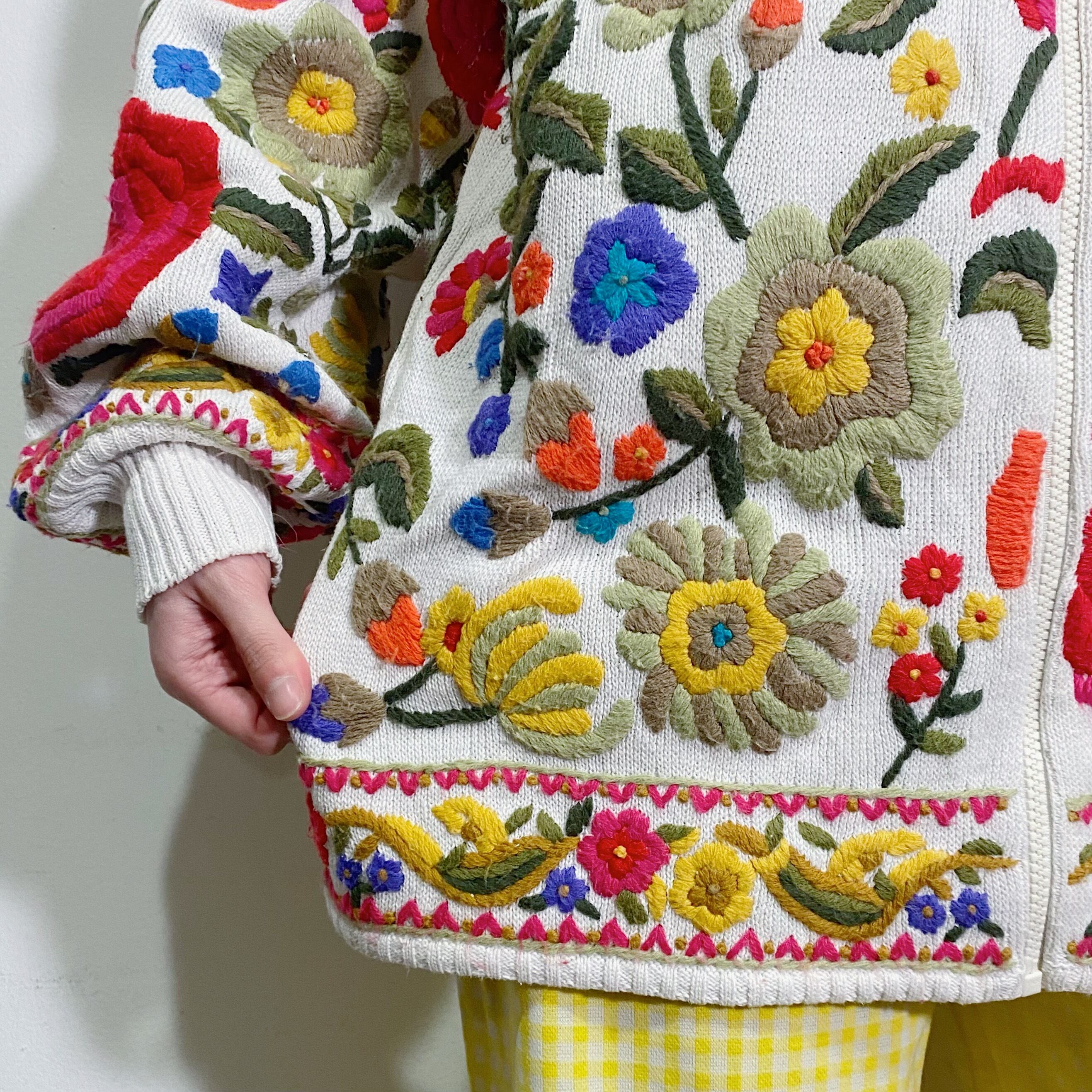 とてもカラフルで華やかな、まるで一枚の絵のようなデザインが魅力のニットジャケットです。