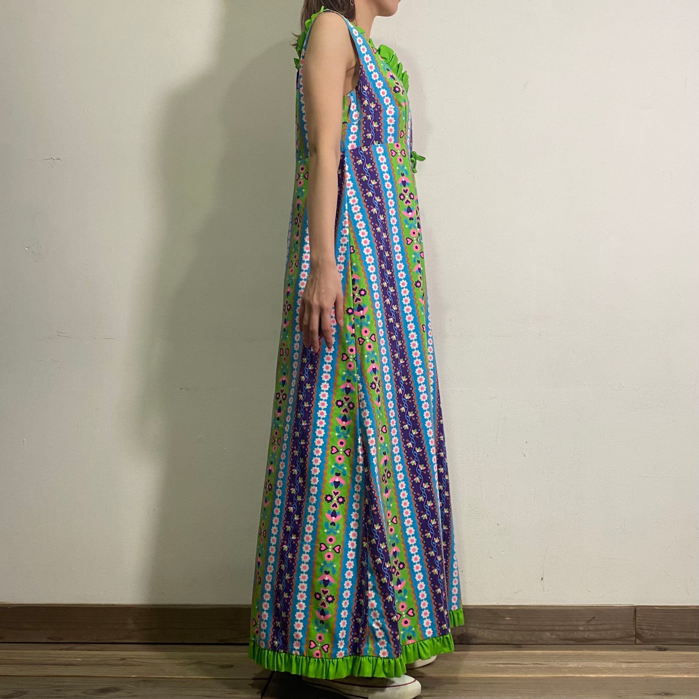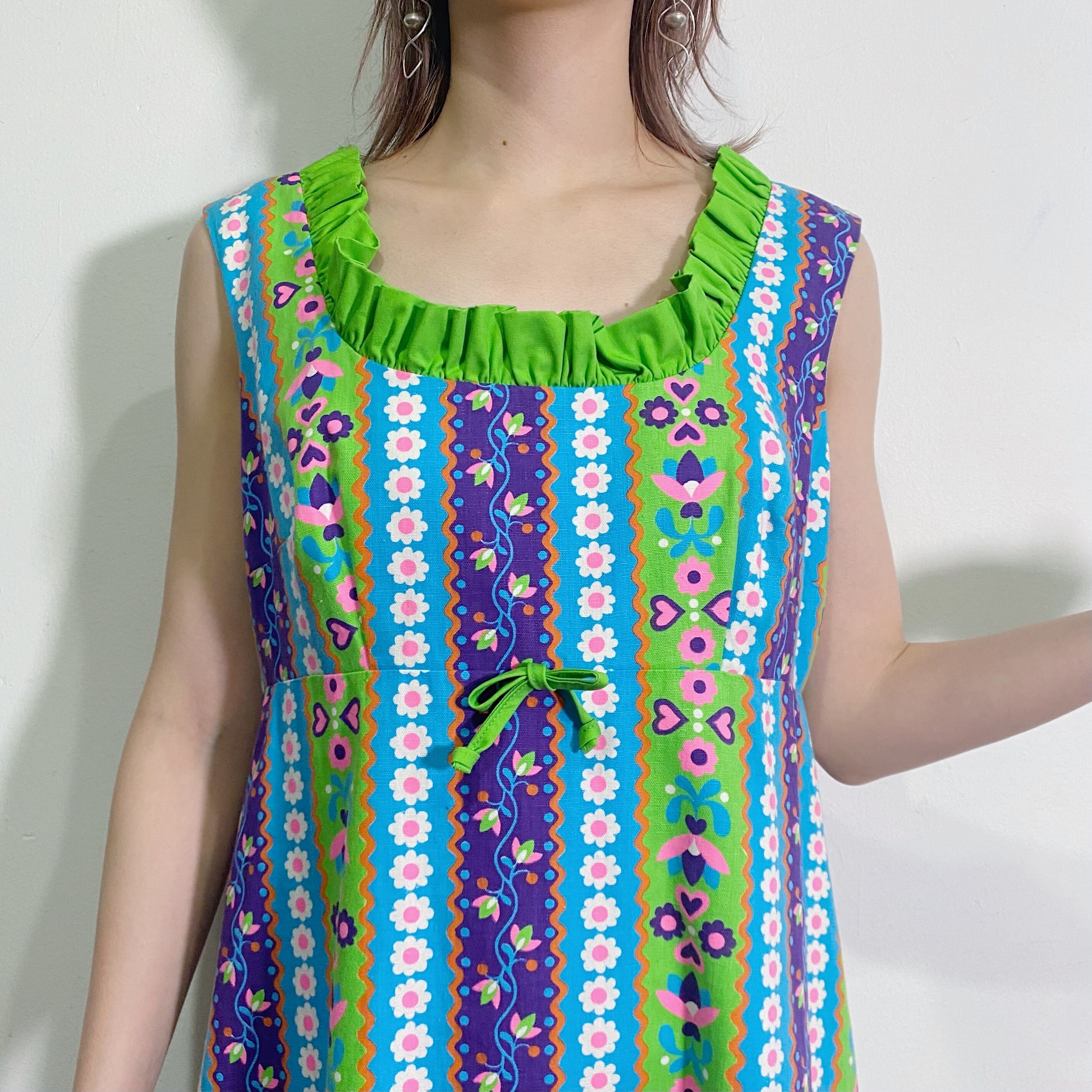 黄緑や紫、水色などの色の組み合わせが可愛い、70年代のワンピースです。