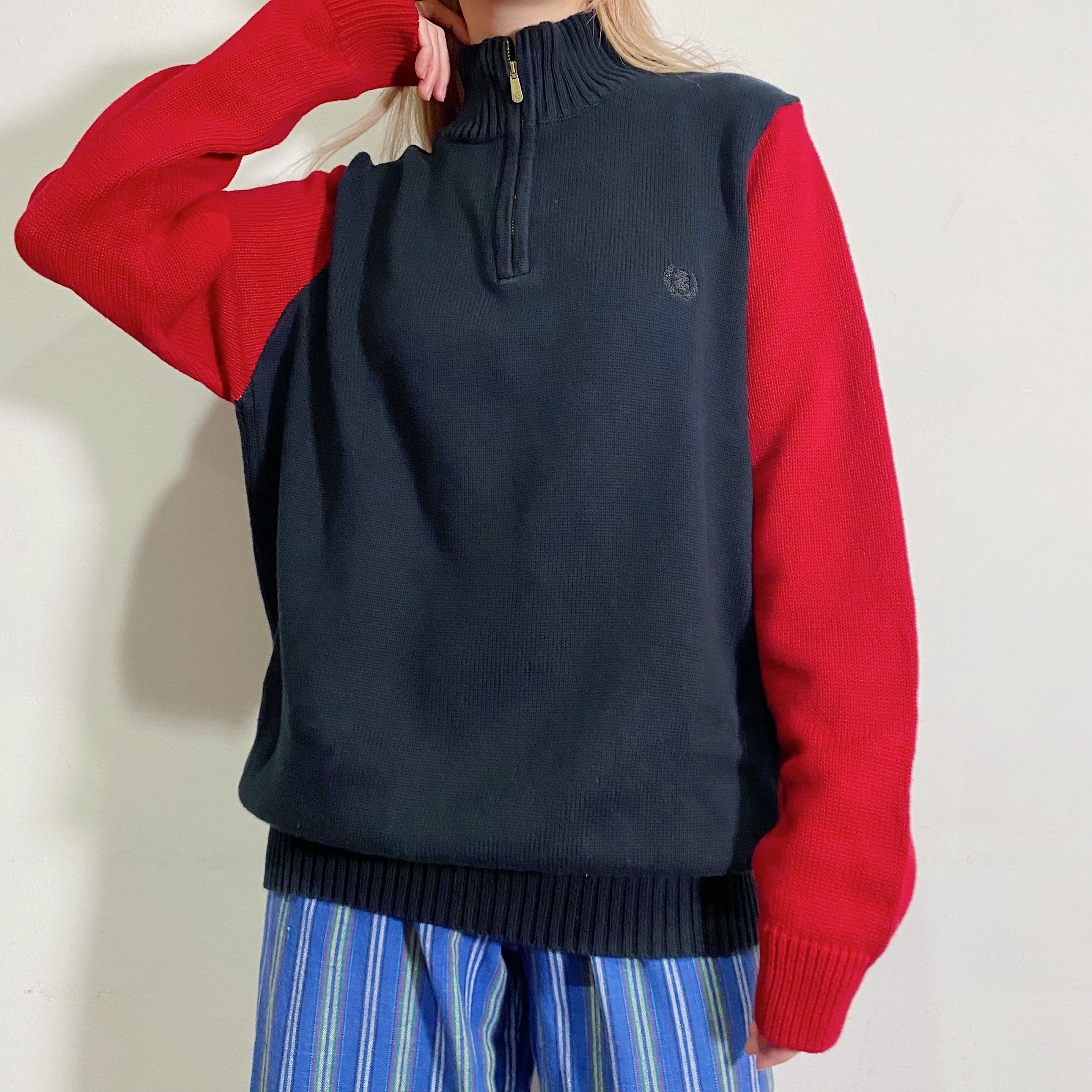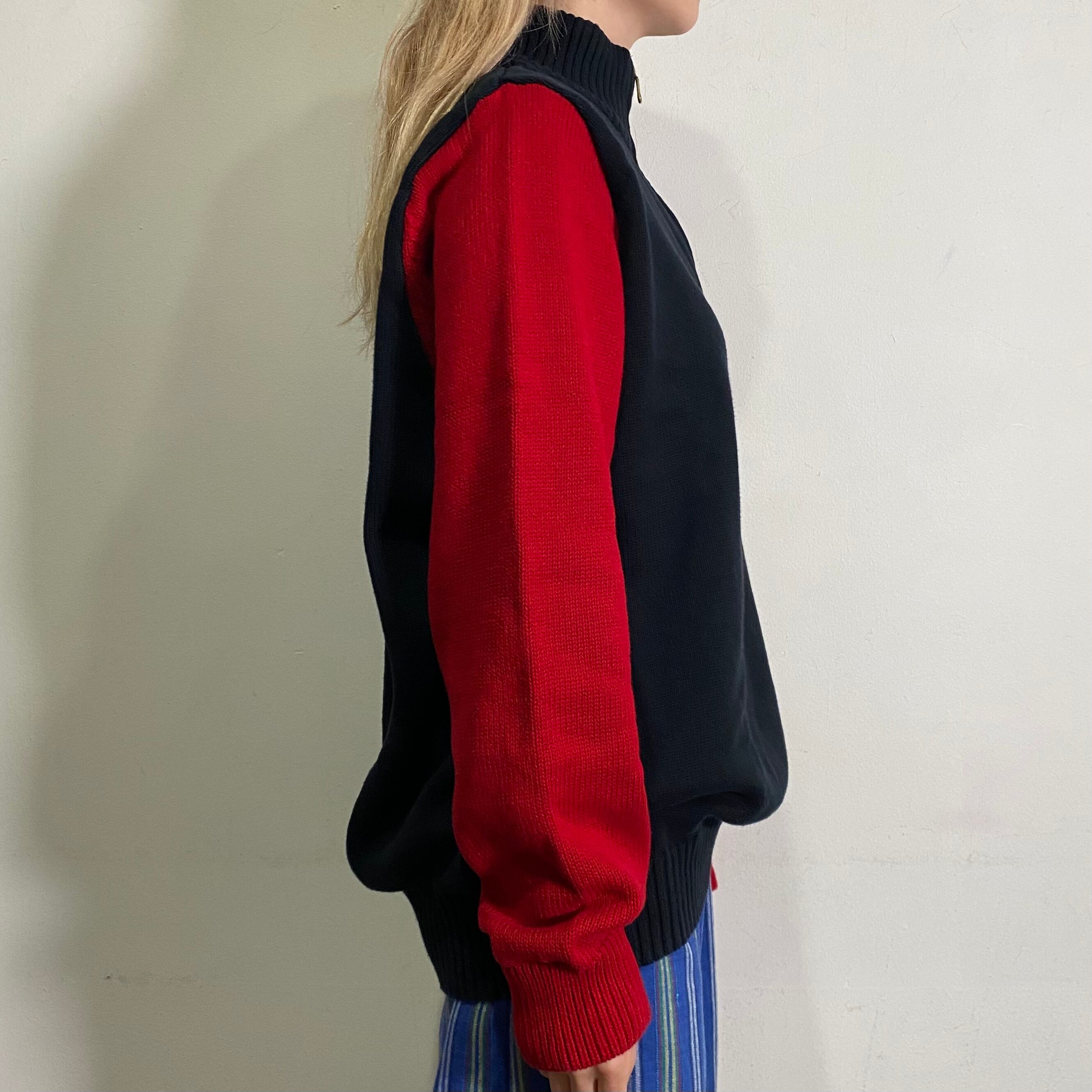 黒に近いネイビーと赤の組み合わせが可愛い、コットンニットセーターです。