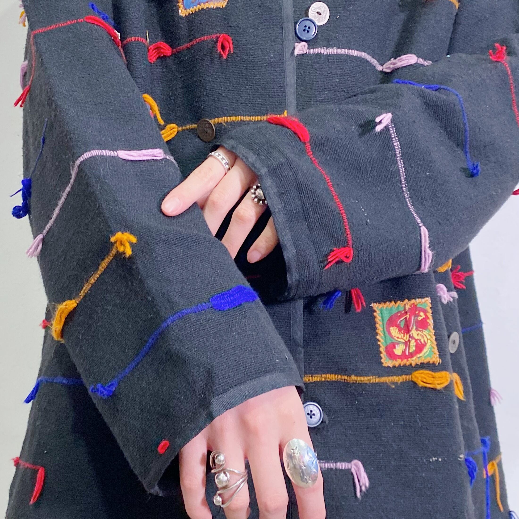カラフルな刺繍糸を縫い付けてあるのですが、途中部分をたるませていたりフリンジのようになっていたりと、縫い付け方も楽しい一枚。