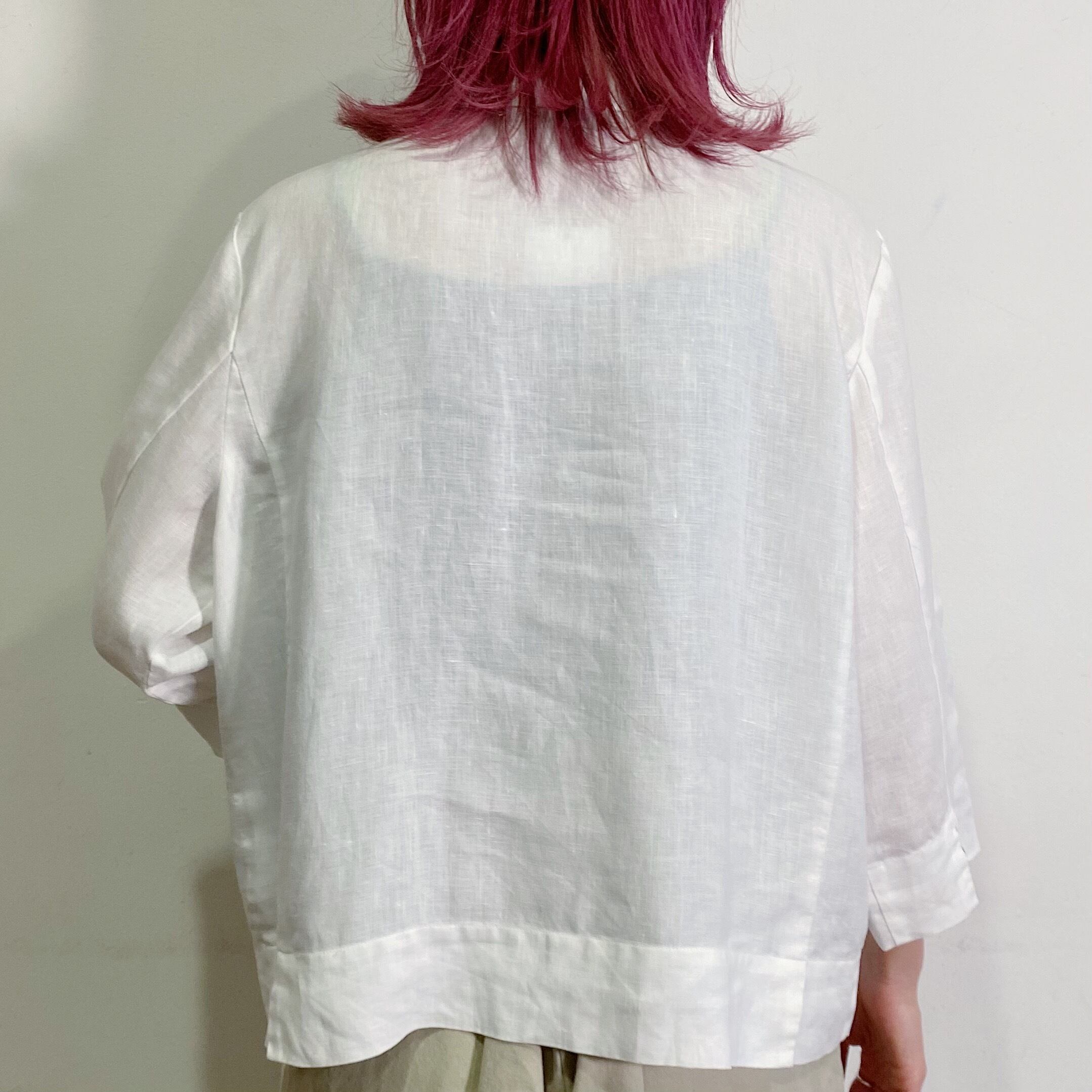 白で大変使い勝手の良さそうな、リネンシャツです。