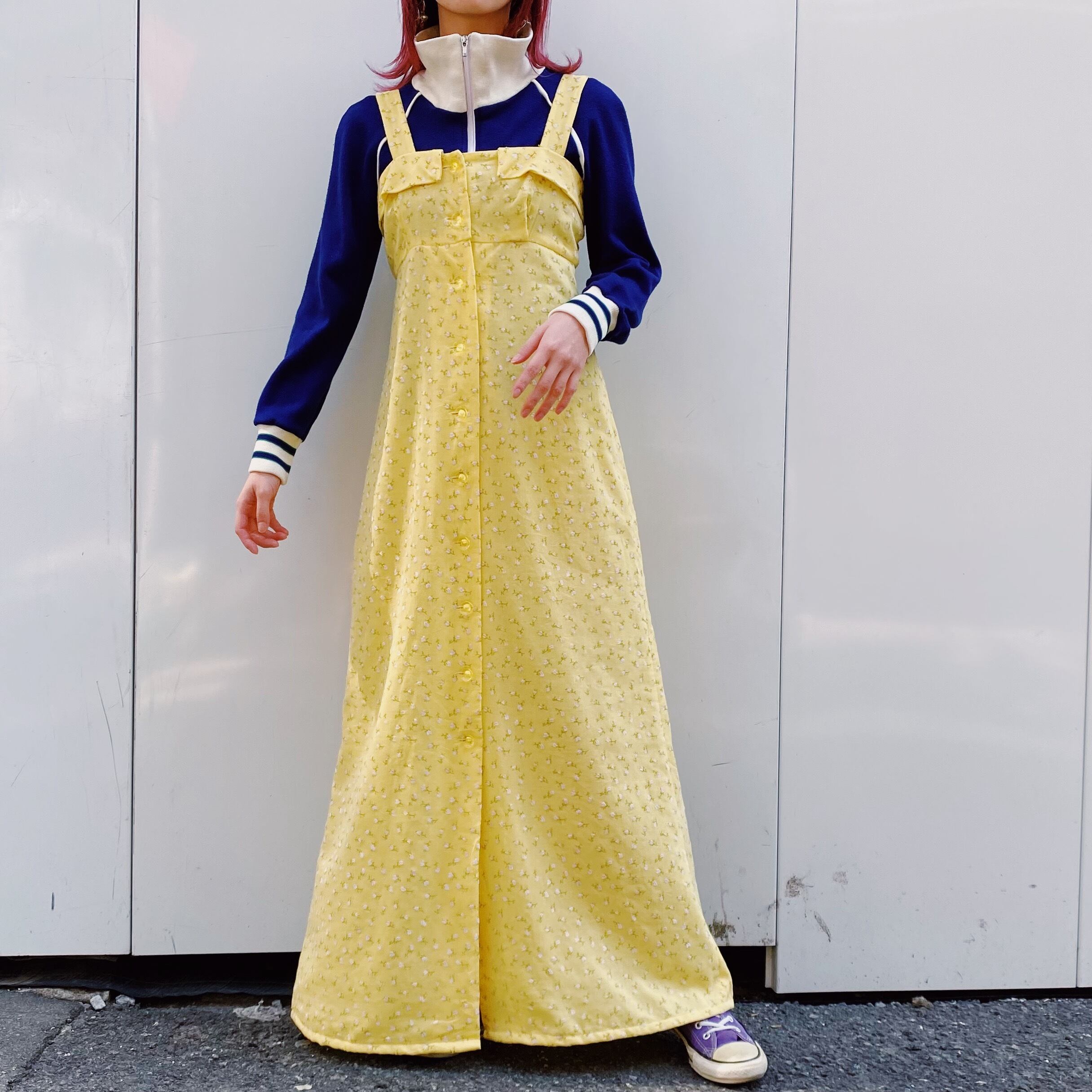 イエローにホワイトの小花柄が可愛い、70年代のロングワンピースです。