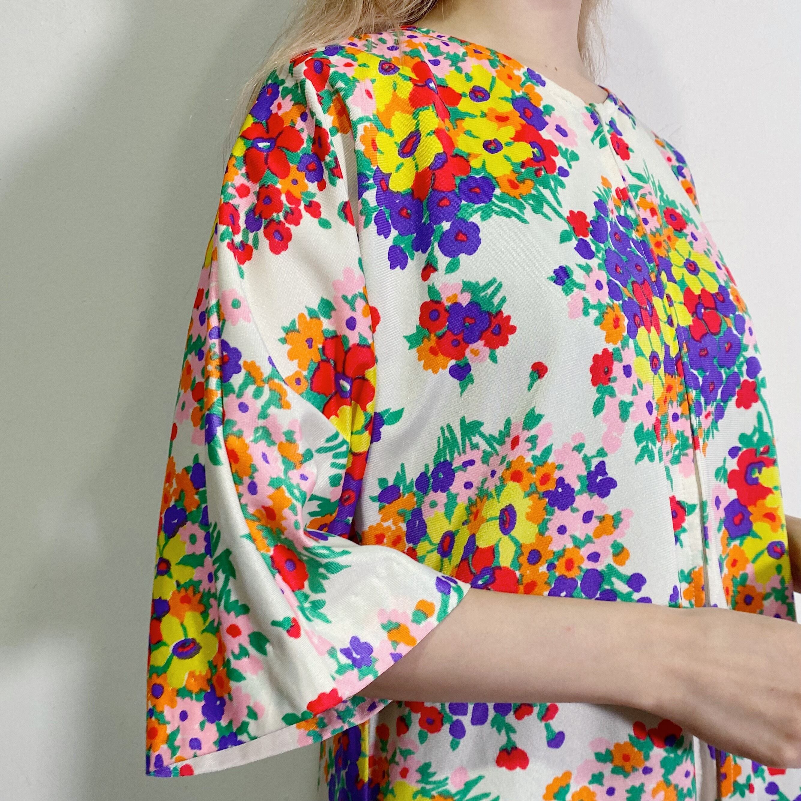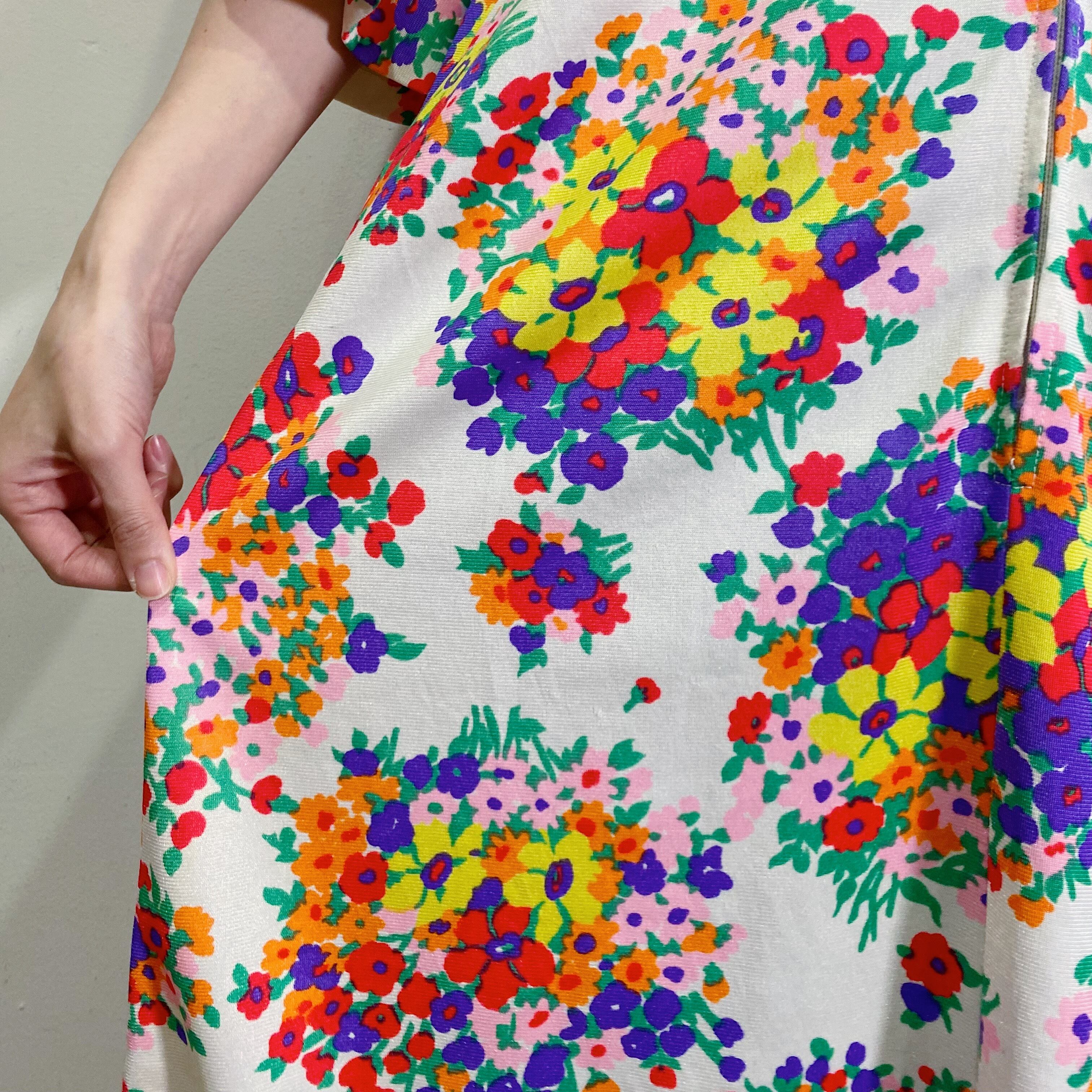 ホワイトベースにカラフルでブーケのようなお花柄がとても可愛い、70年代のロングワンピースです。