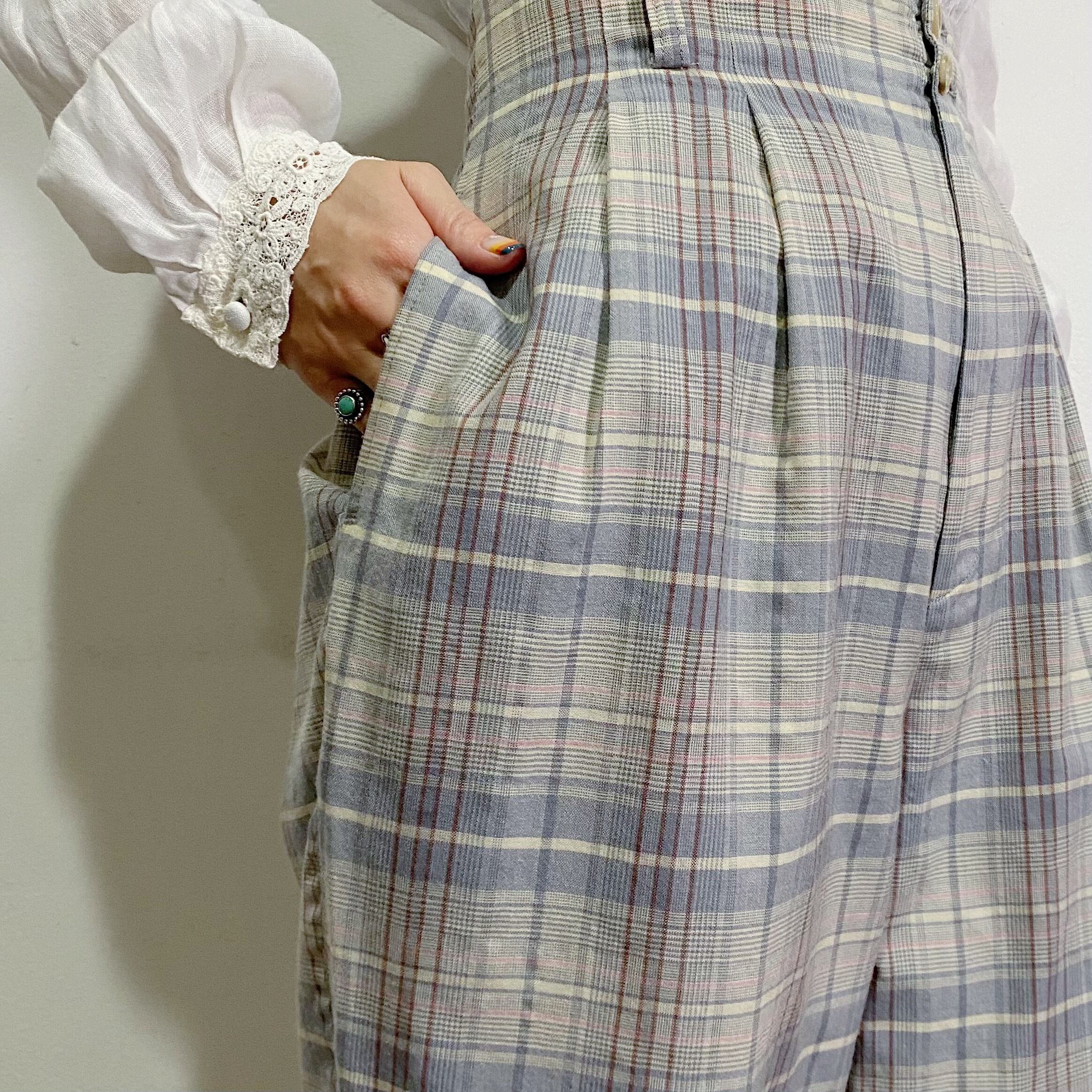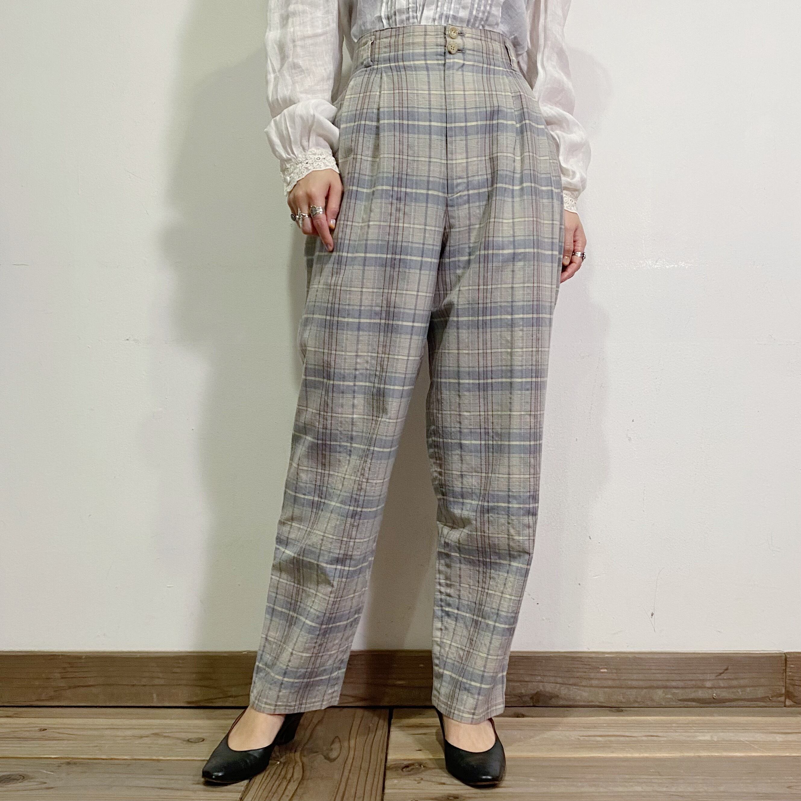 淡いグレーのチェックプリントが可愛い、90年代頃のタックパンツです。