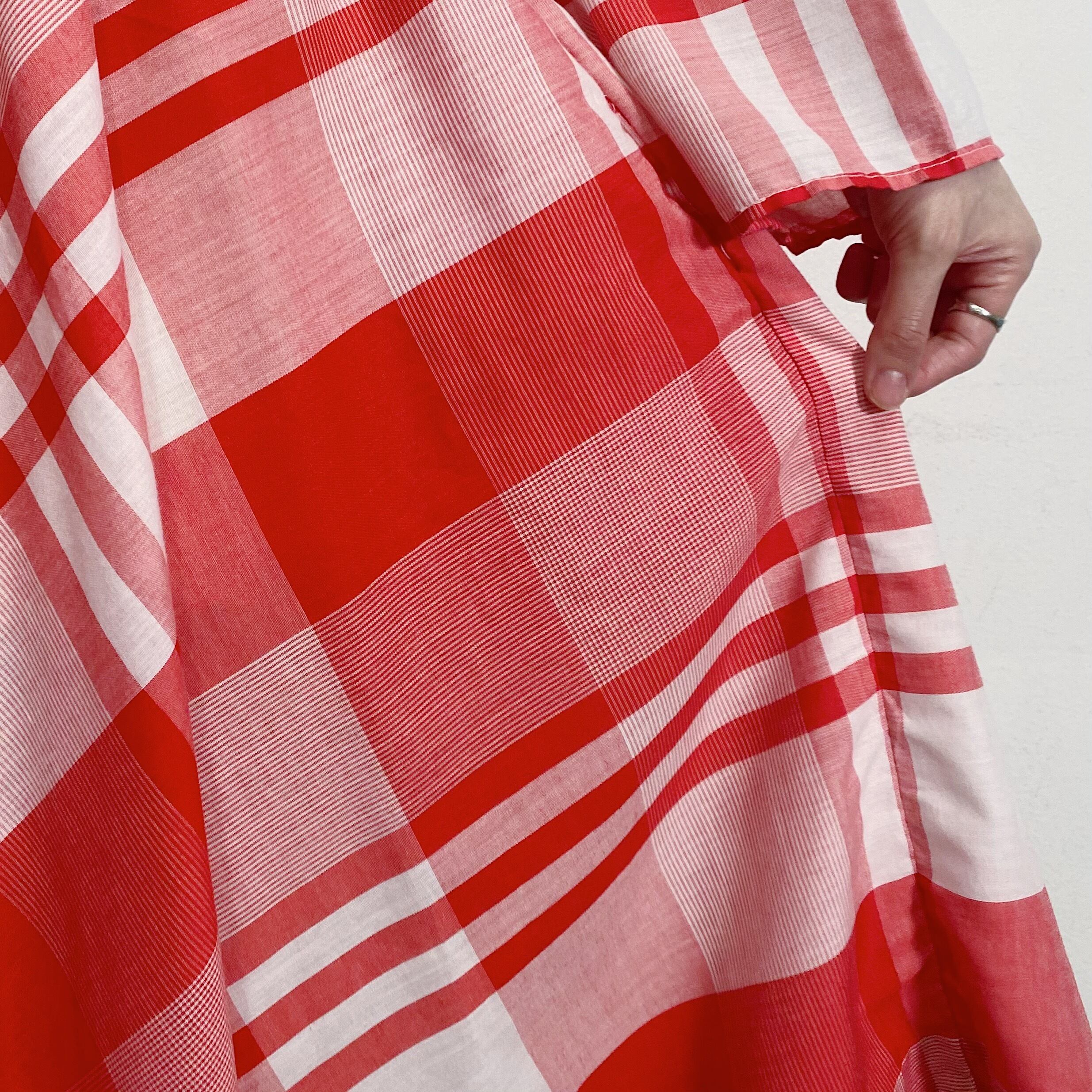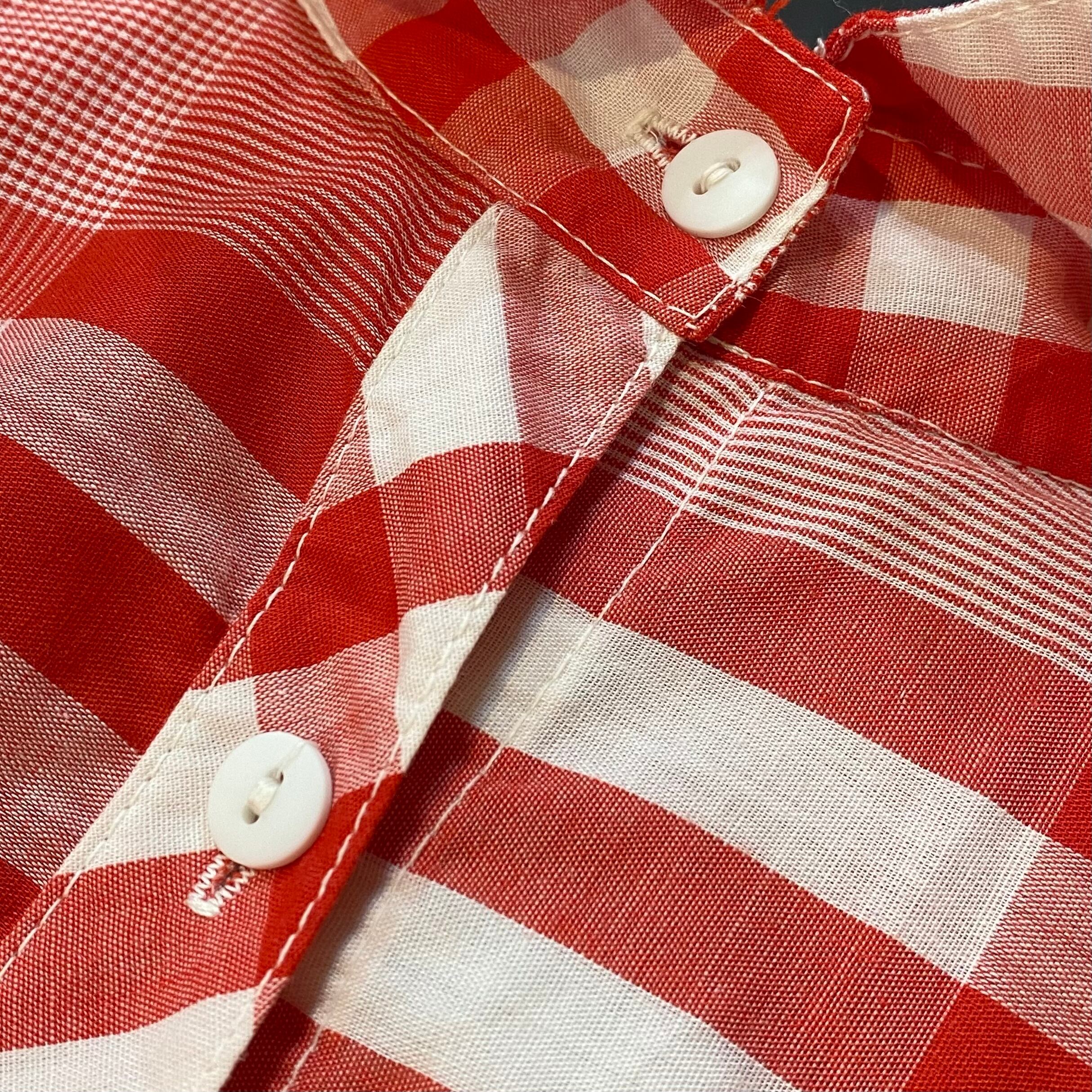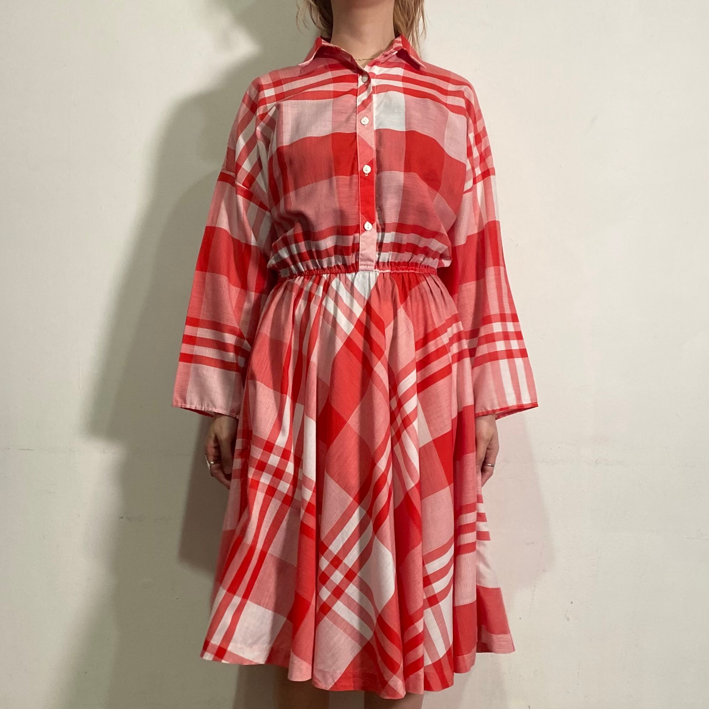 赤と白のチェックプリントが映える、シャツワンピースです。