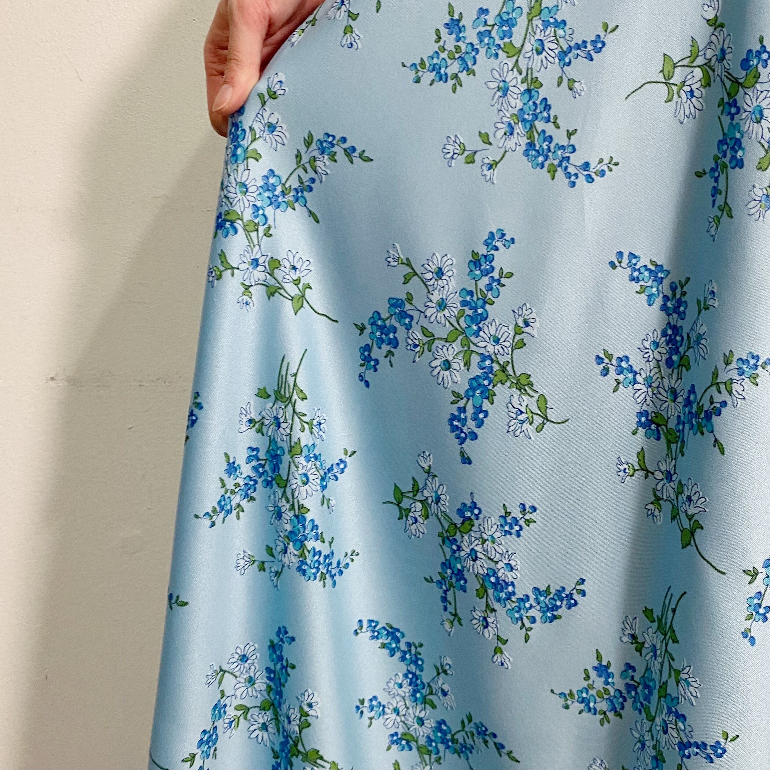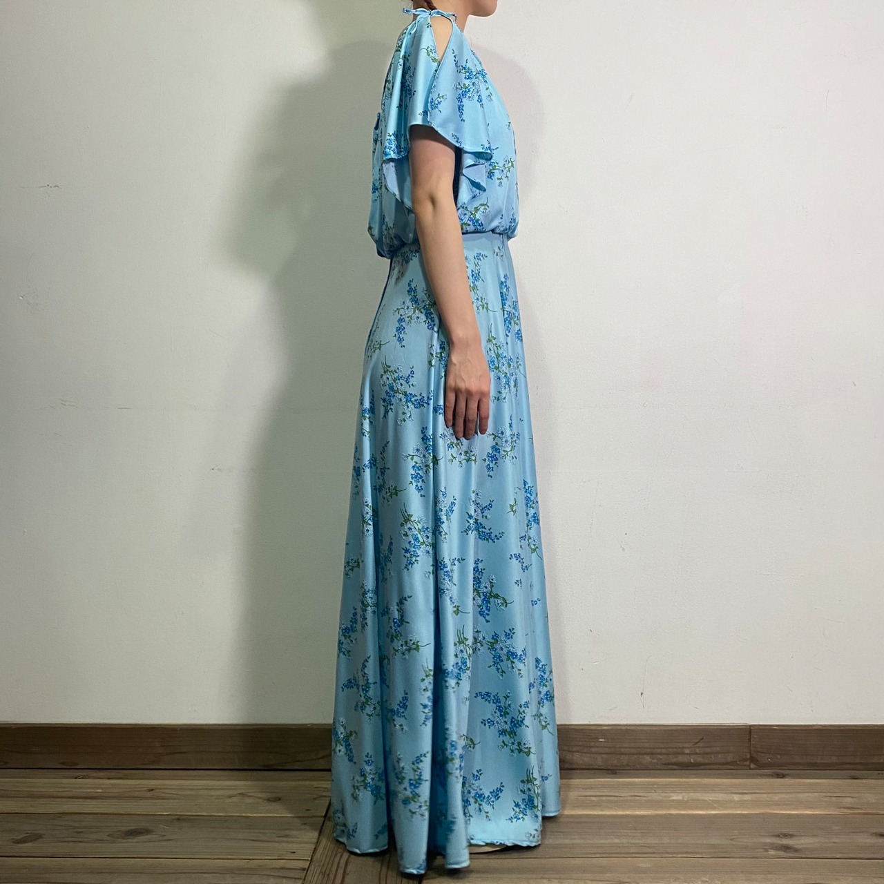 水色の花柄にドレープデザインが素敵な花柄ワンピースです。