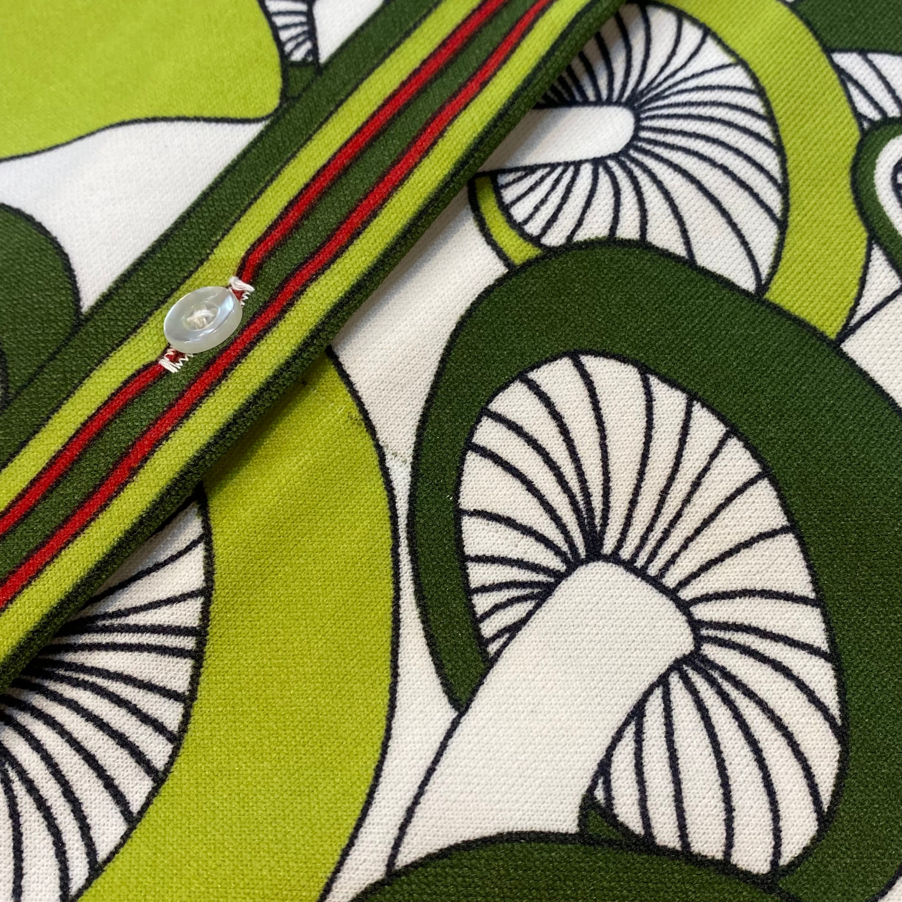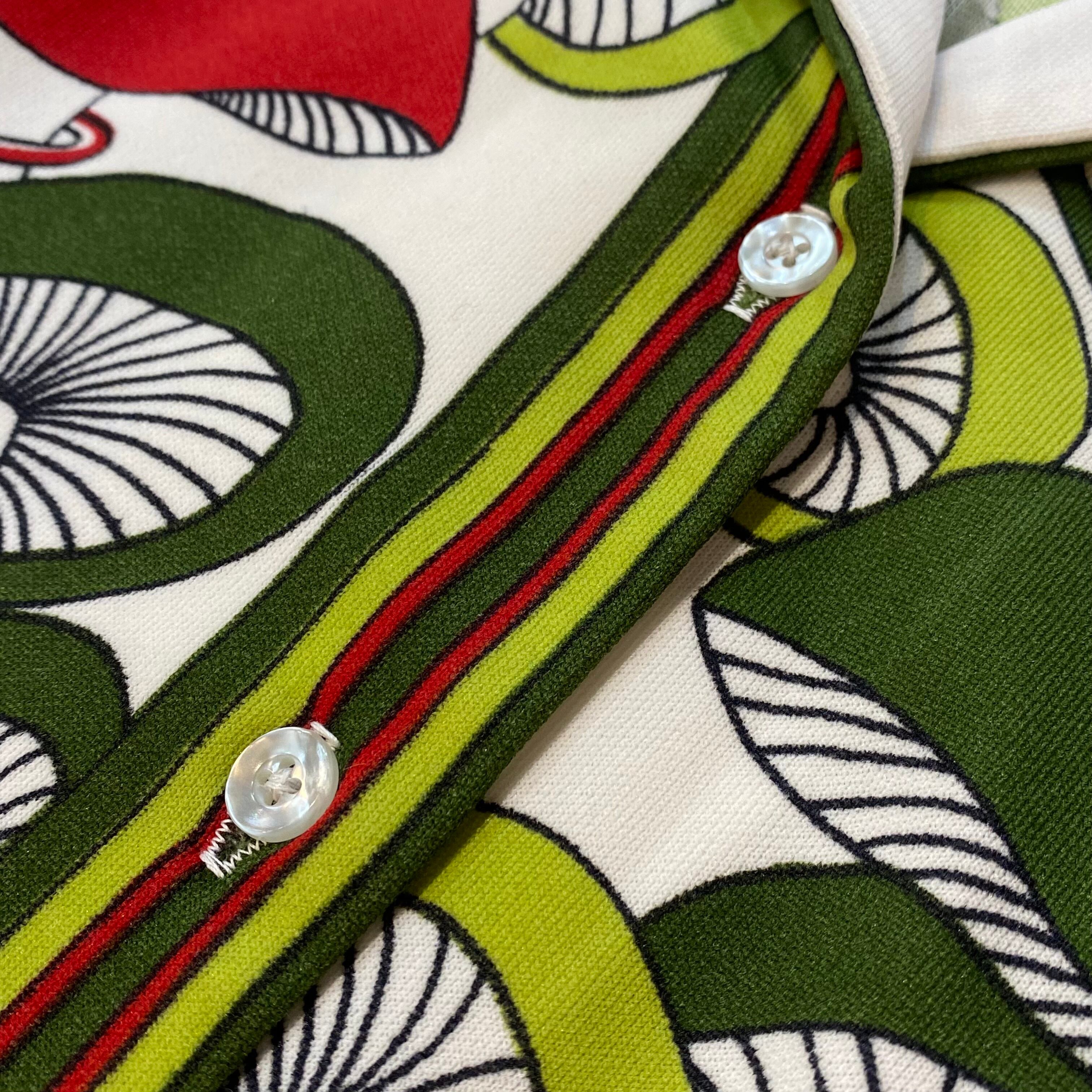 グリーンやレッドの色合いが可愛い、キノコ柄の長袖シャツです。