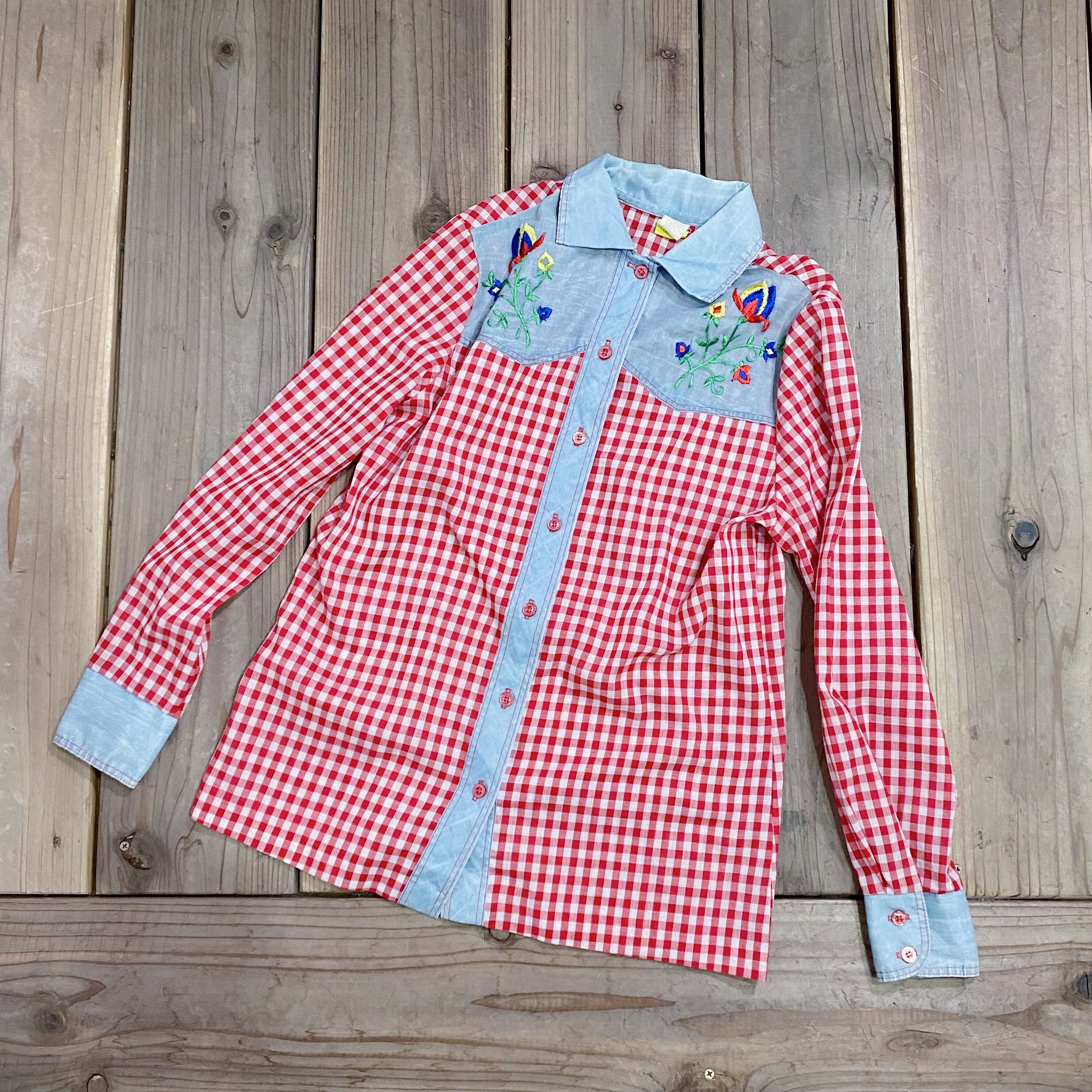 70s red gingham check embroidery shirt