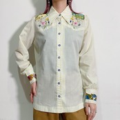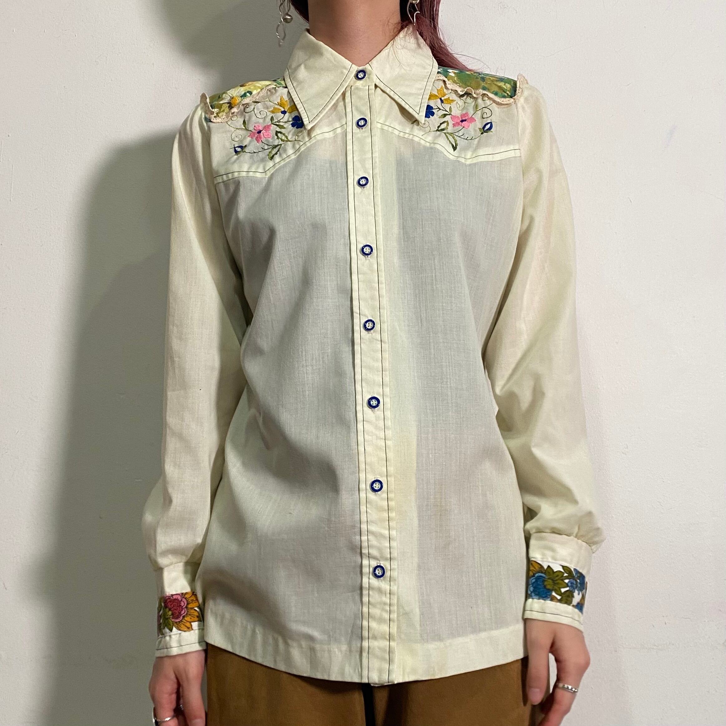 肩にはお花ので刺繍、背中には転写プリントの花の生地の切り替えと、豪華な仕様の70年代のシャツ。