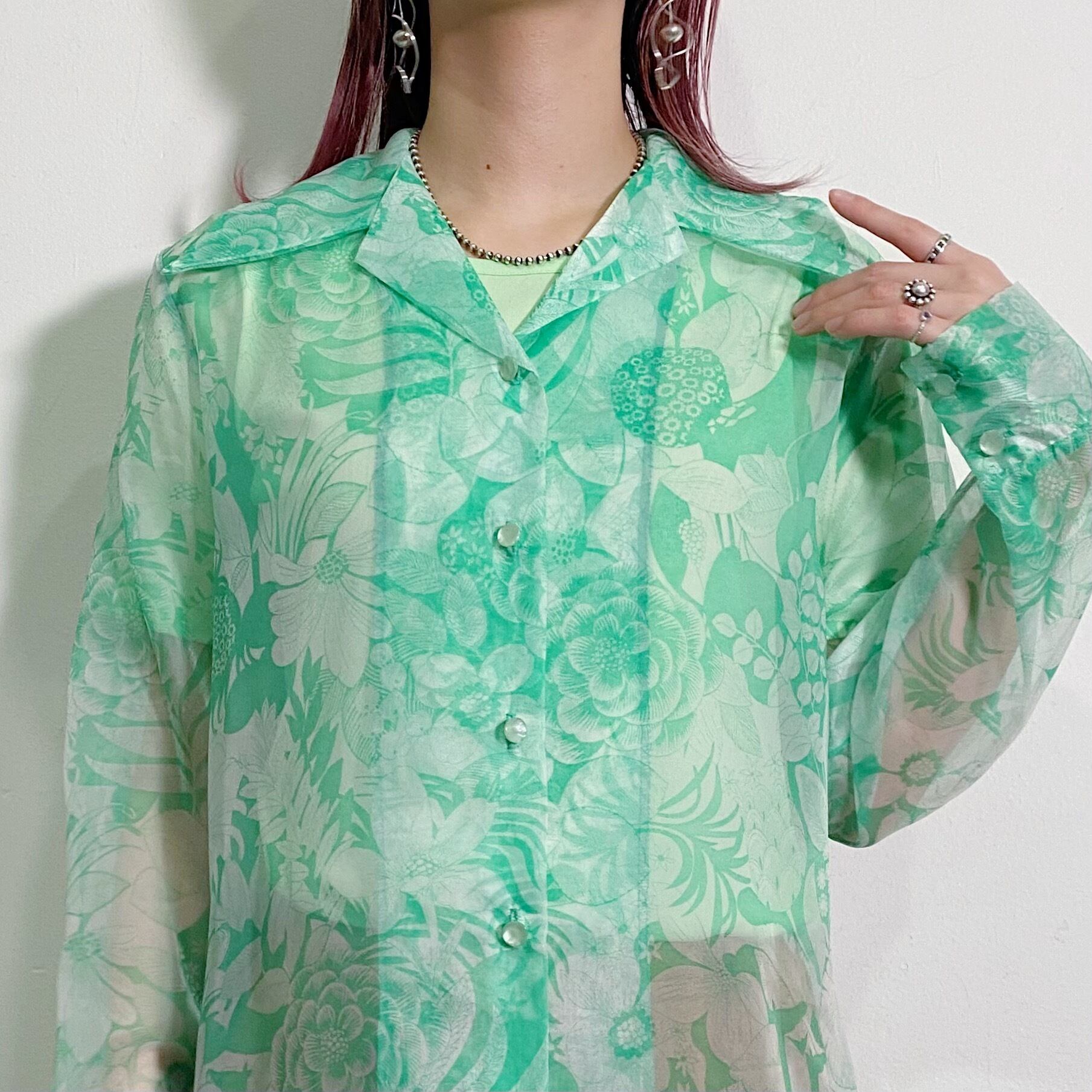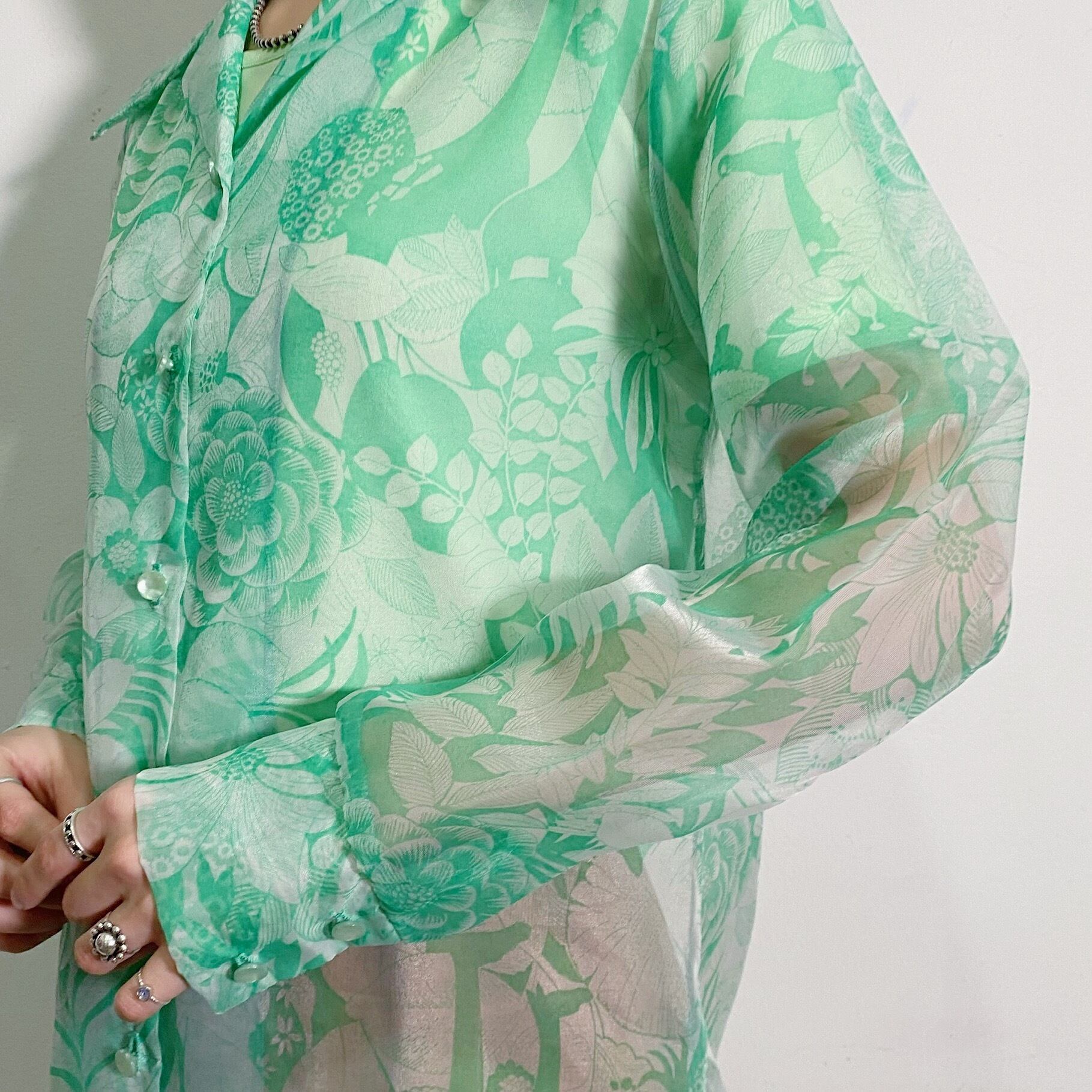 ボタニカルな花柄プリントの、爽やかグリーンがかわいいシアーシャツです。