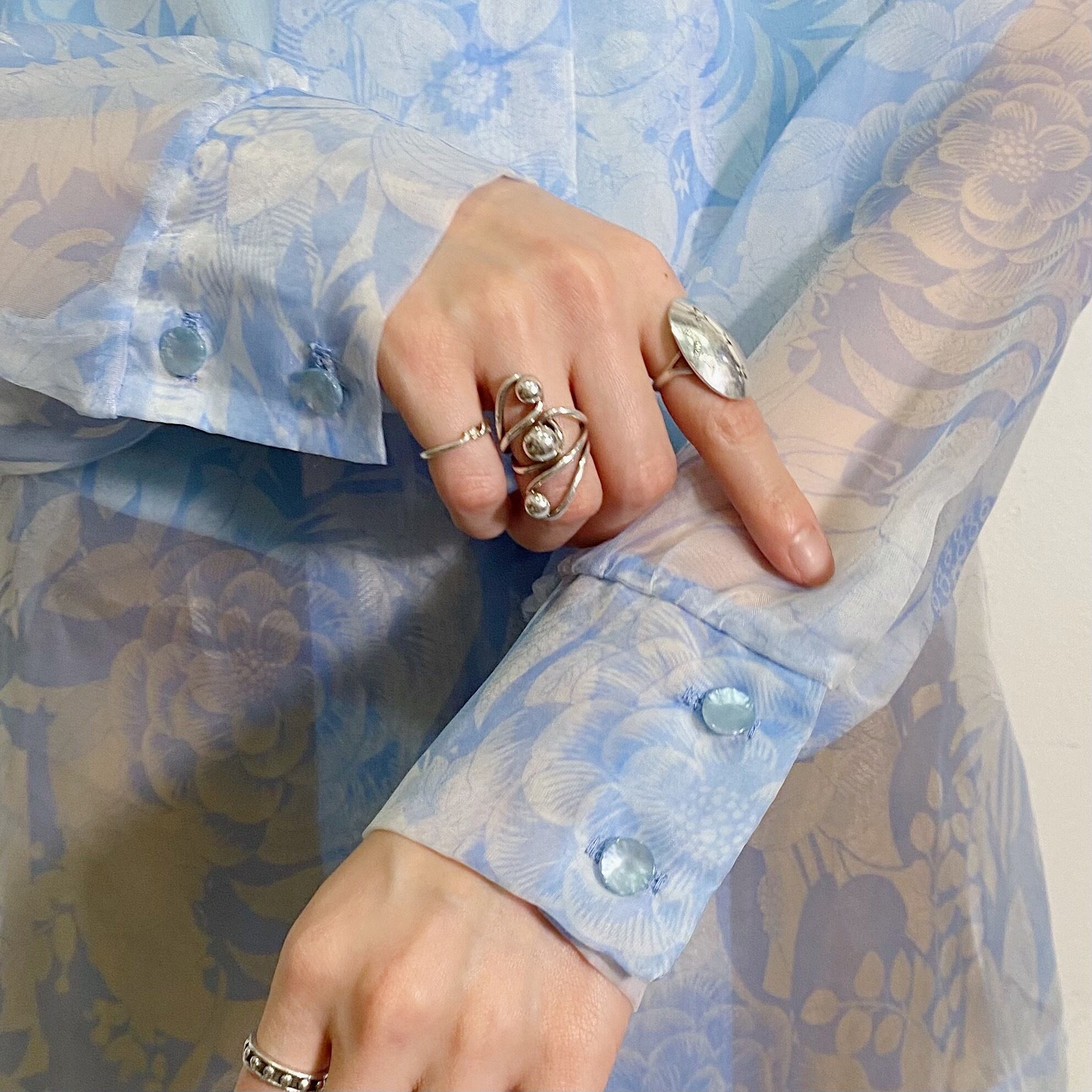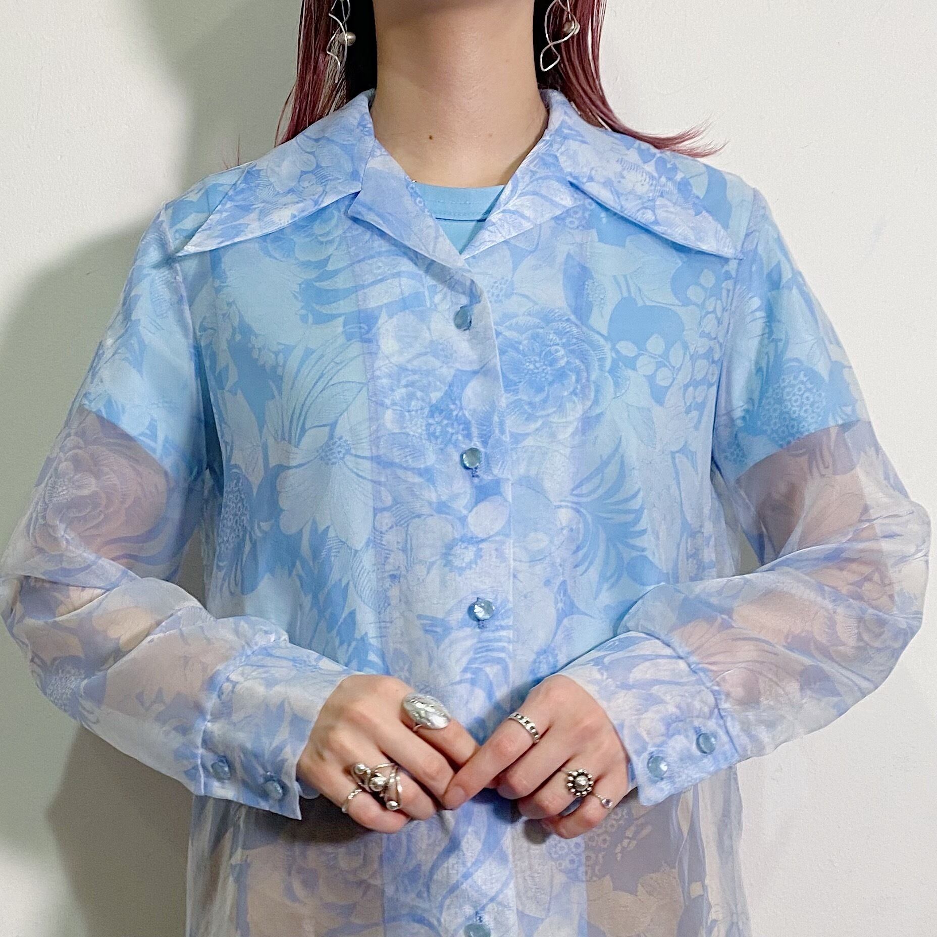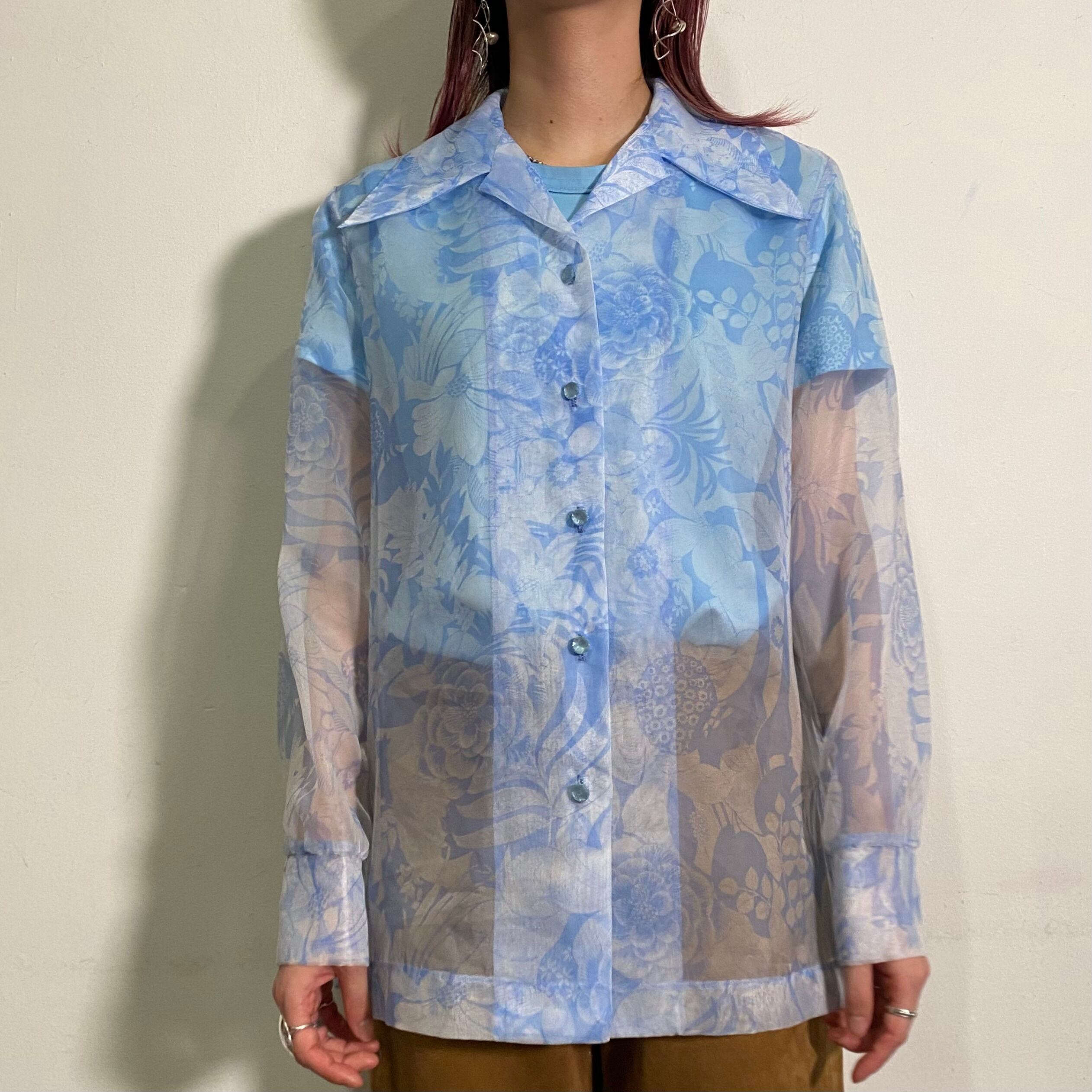 花と果実なプリントが魅力的な、淡いブルーの色合いがかわいいシアーシャツです。
