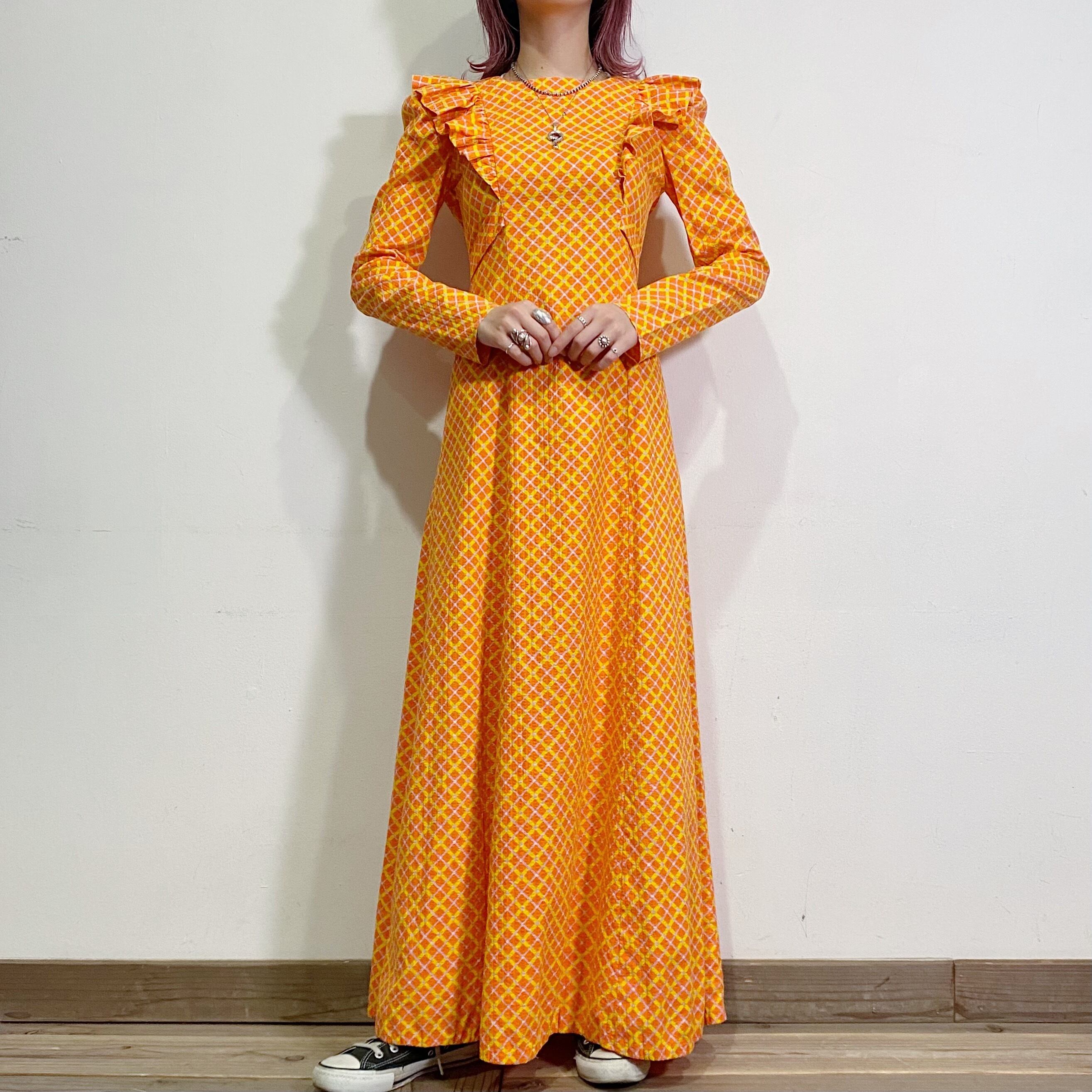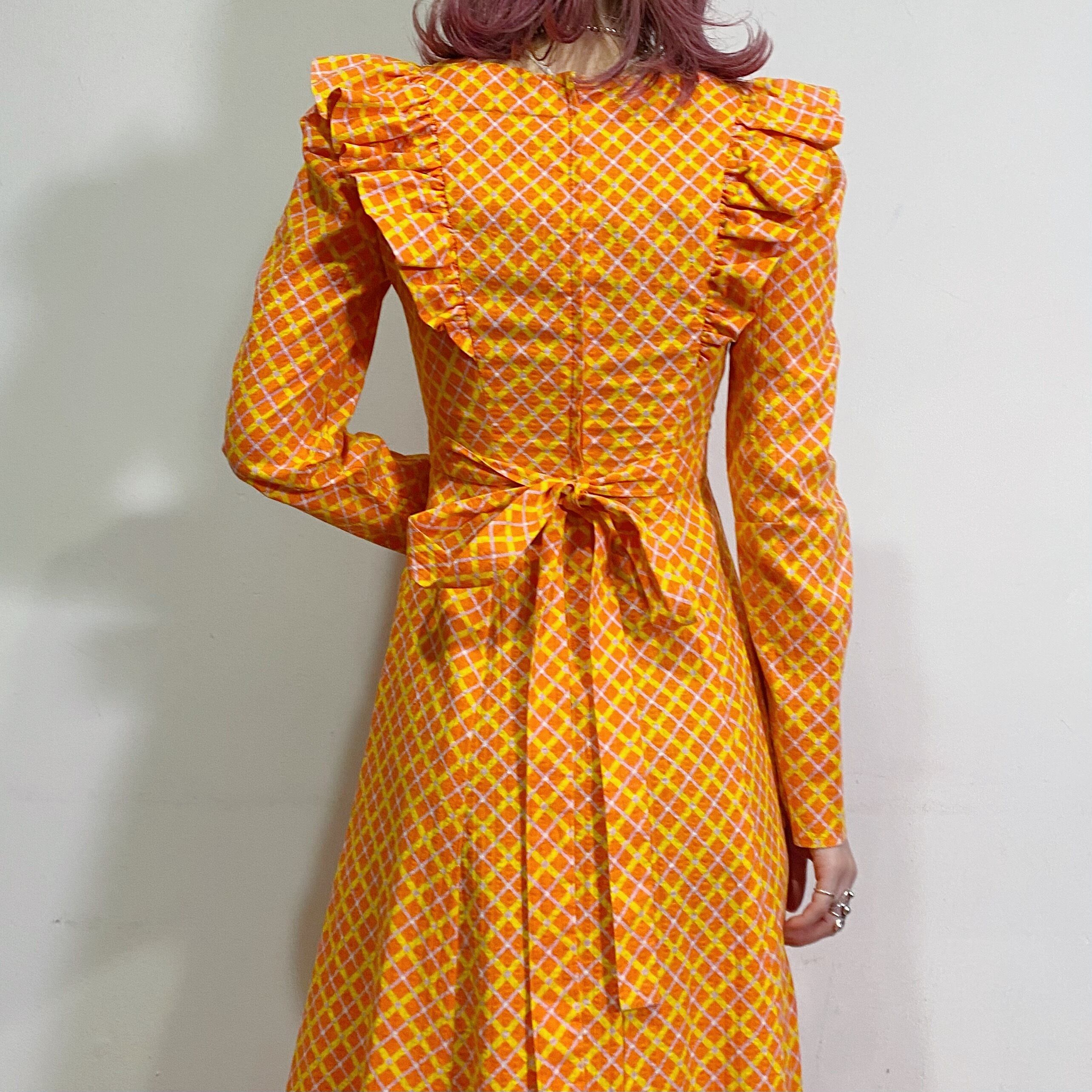 オレンジベースにイエローのチェックが可愛い、70年代のワンピースです。
