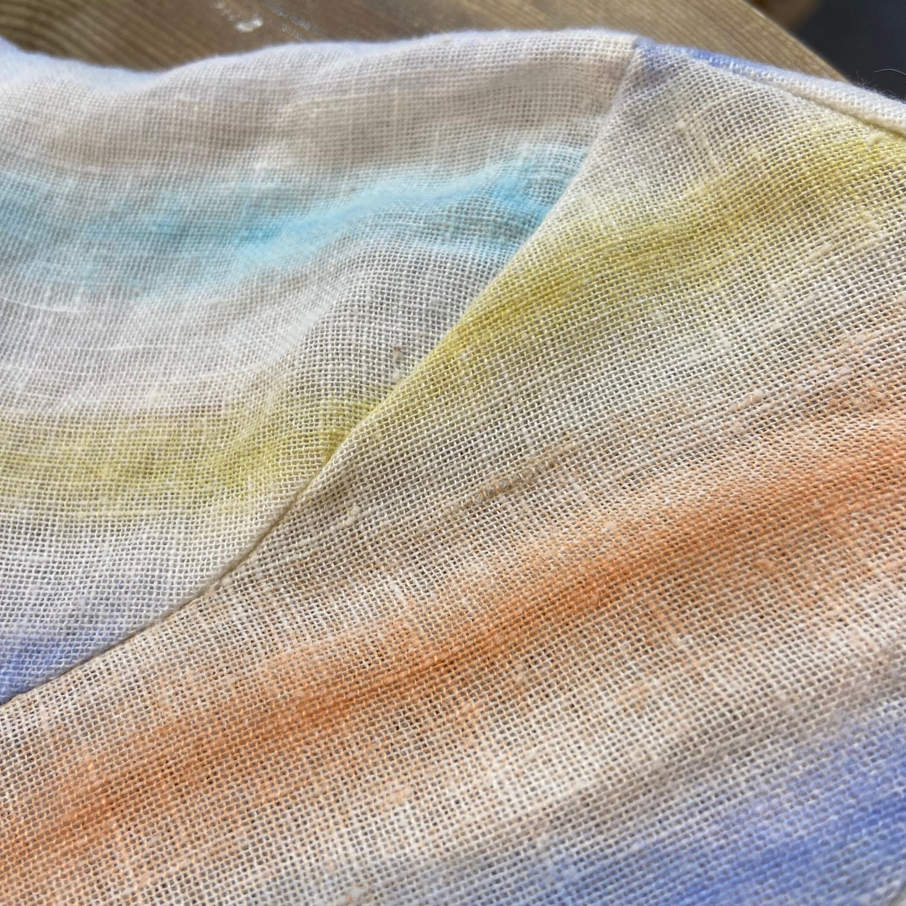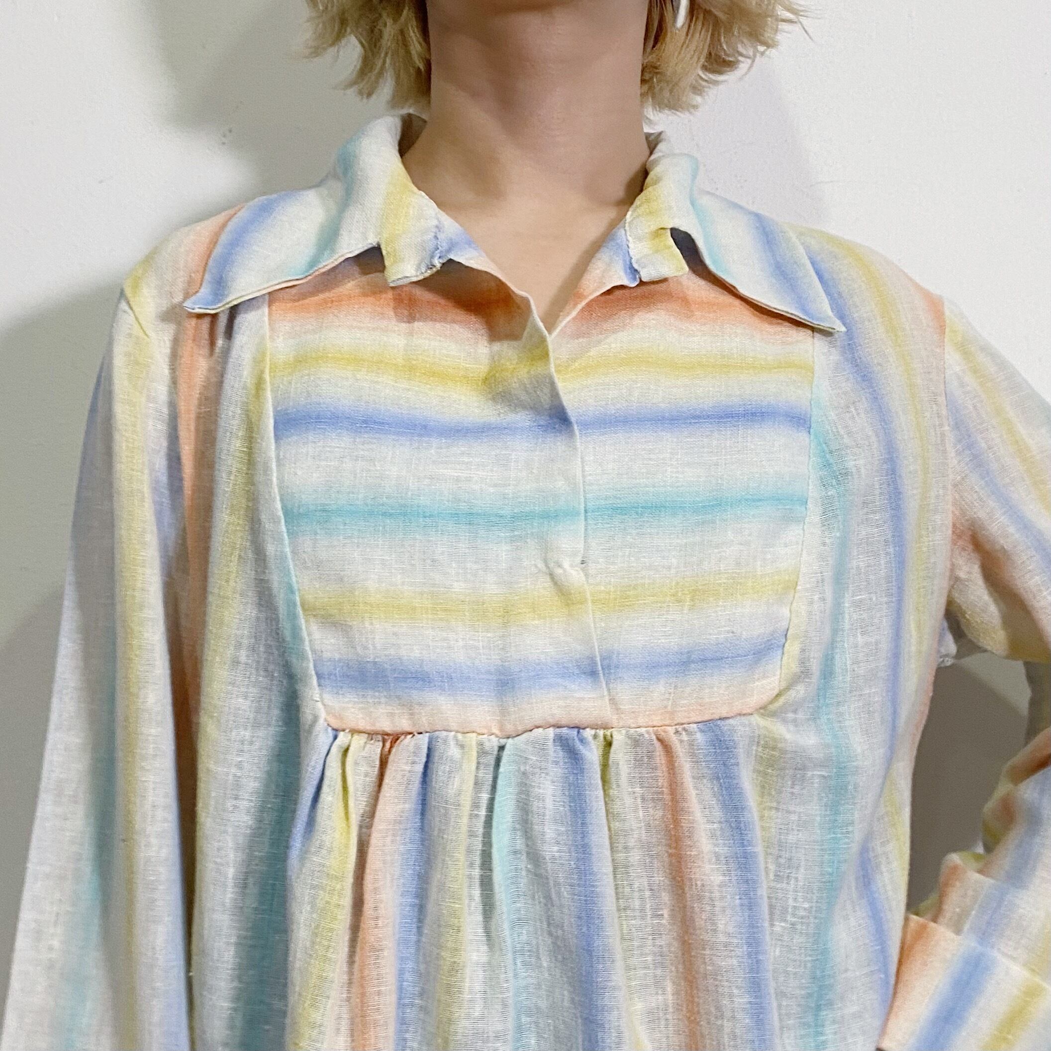オレンジやブルーの淡い色合いのストライプ柄が可愛い、70年代のチュニックです。