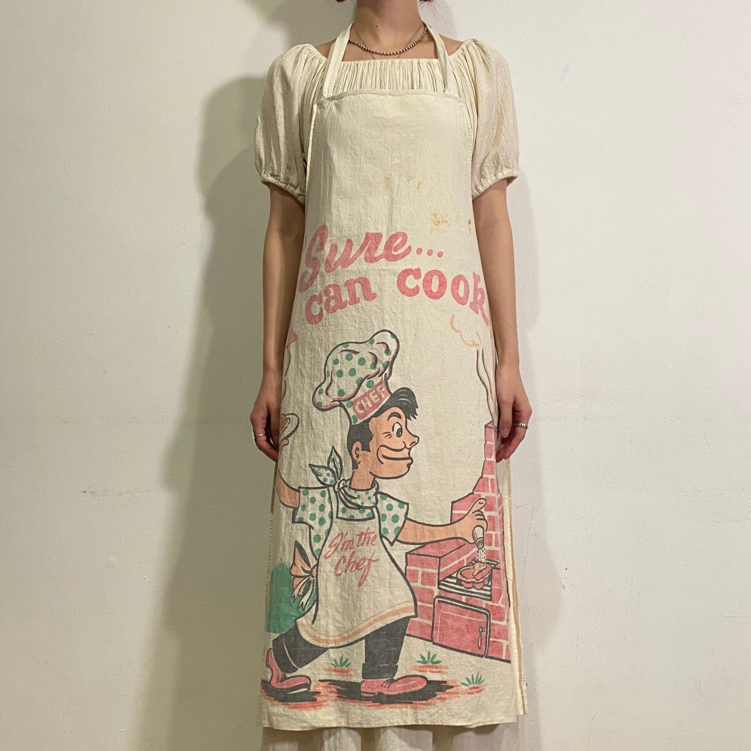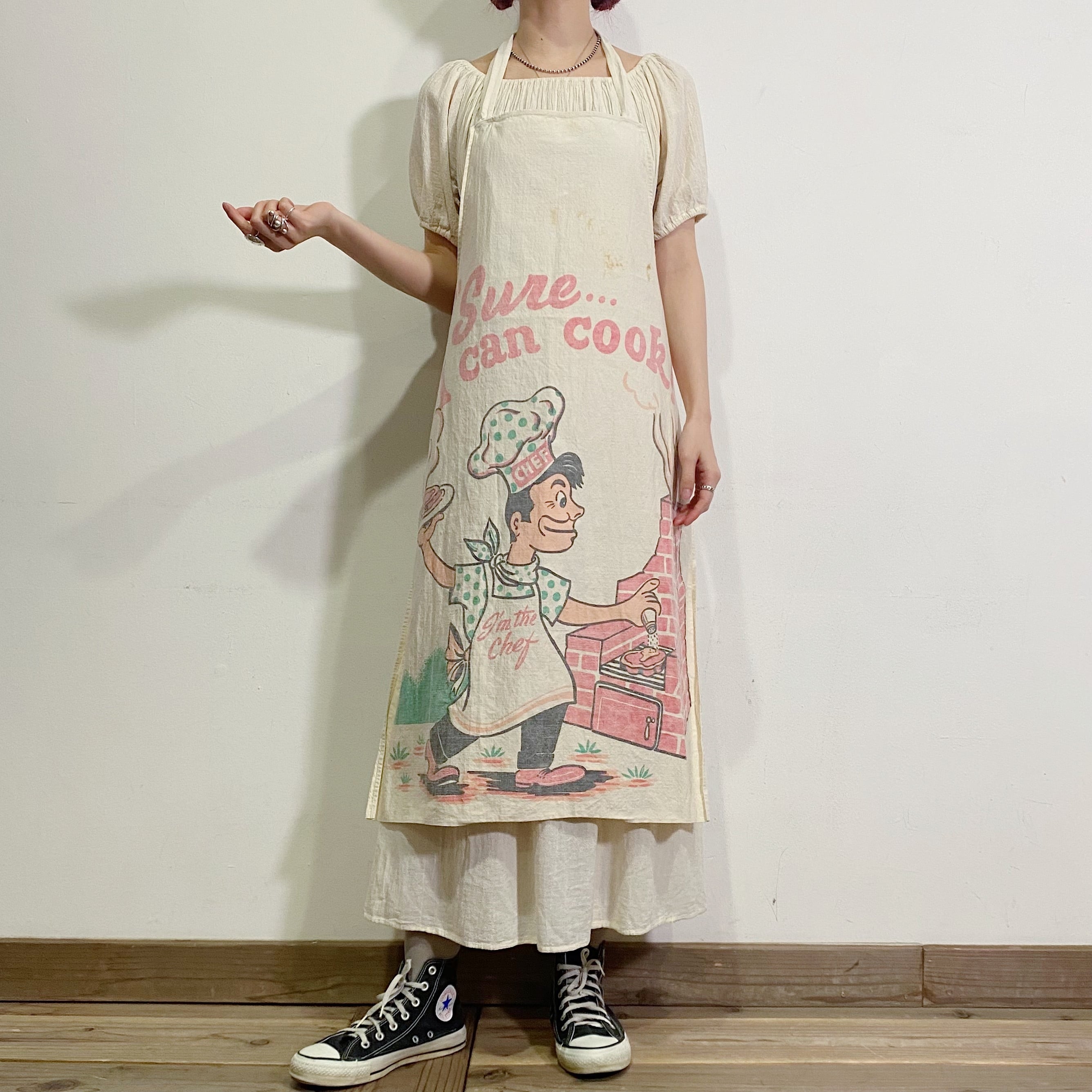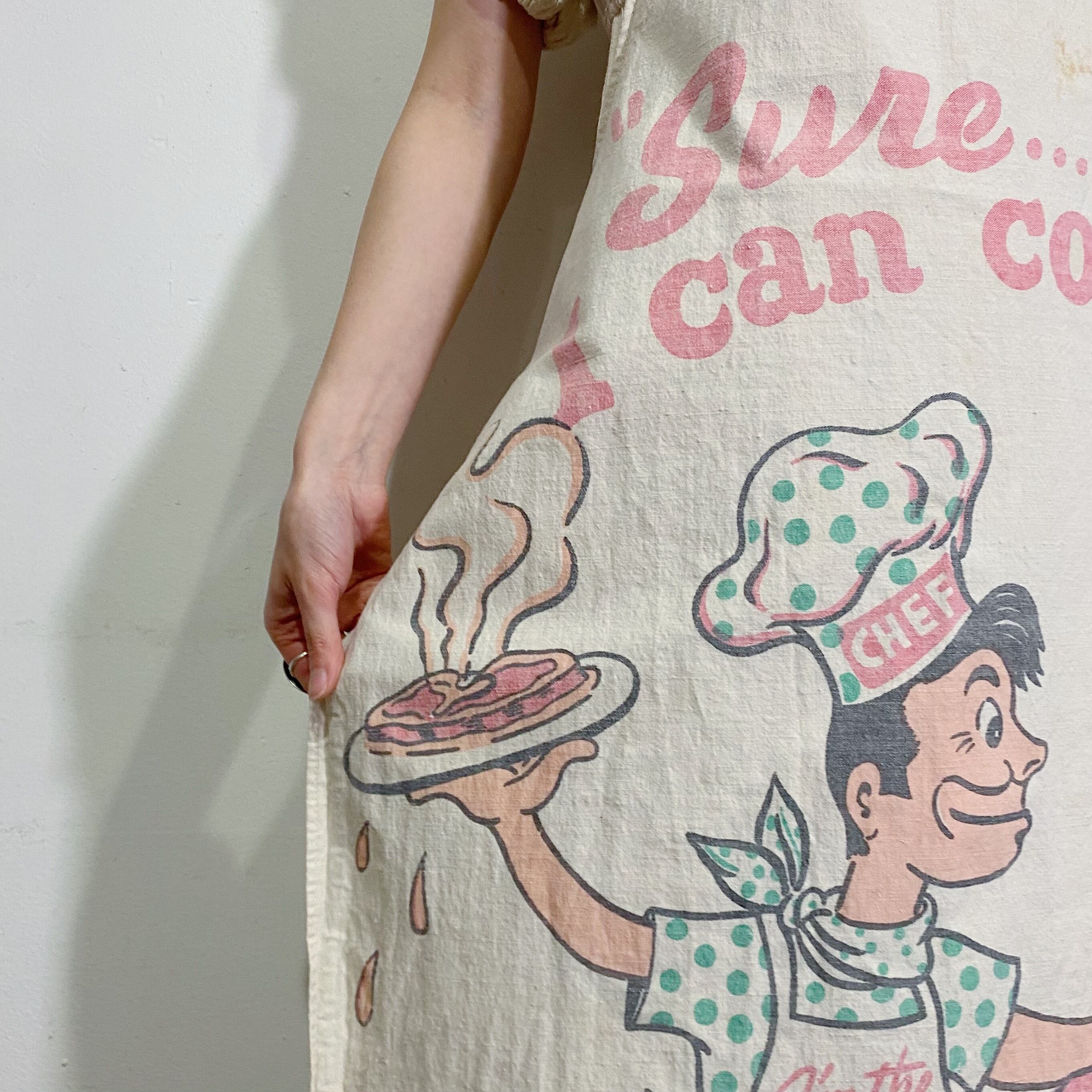 男性がお肉を焼いているプリントが可愛い、50年代のフルエプロンです。
