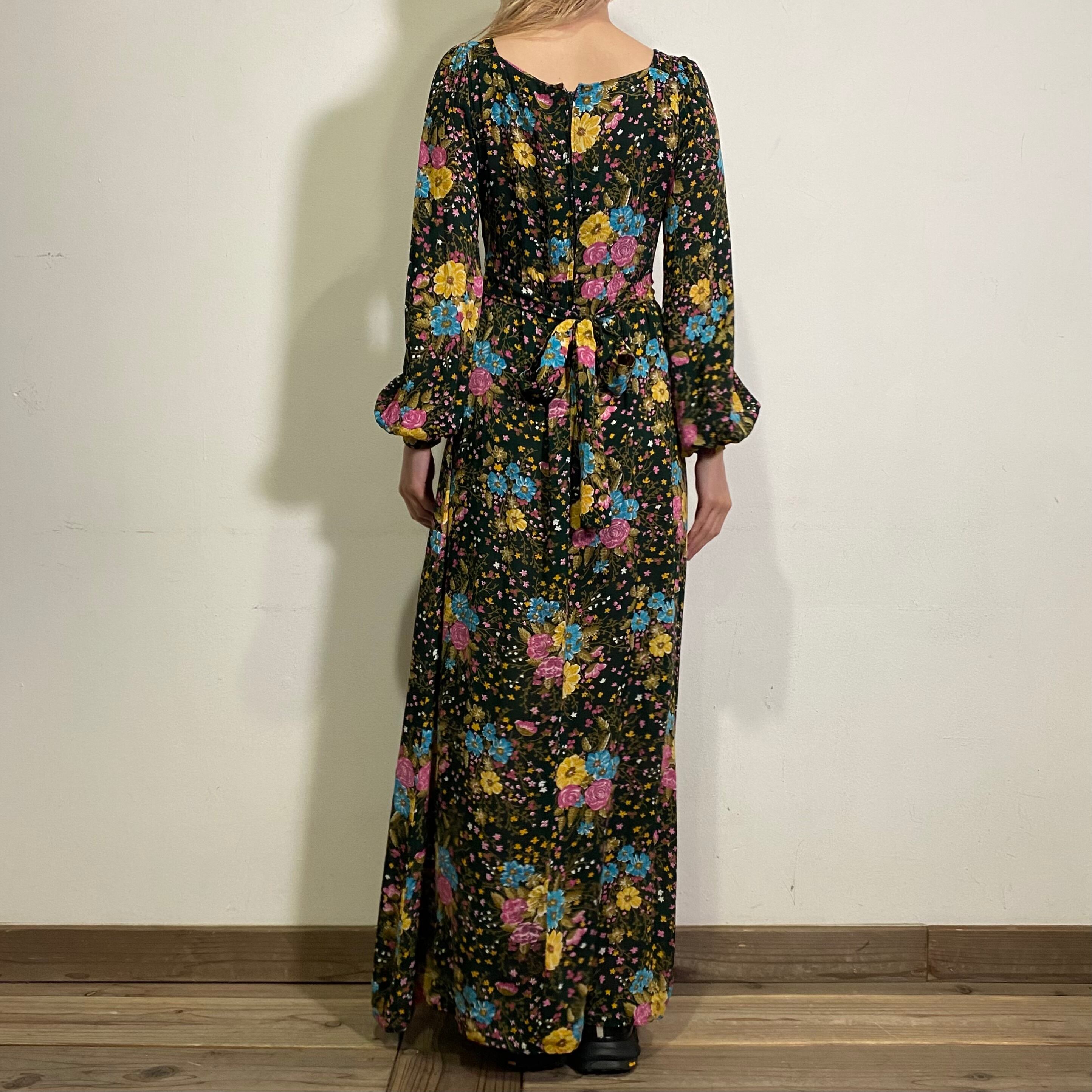 カラフルな花束のようなテキスタイルが可愛い、70年代のワンピースです。