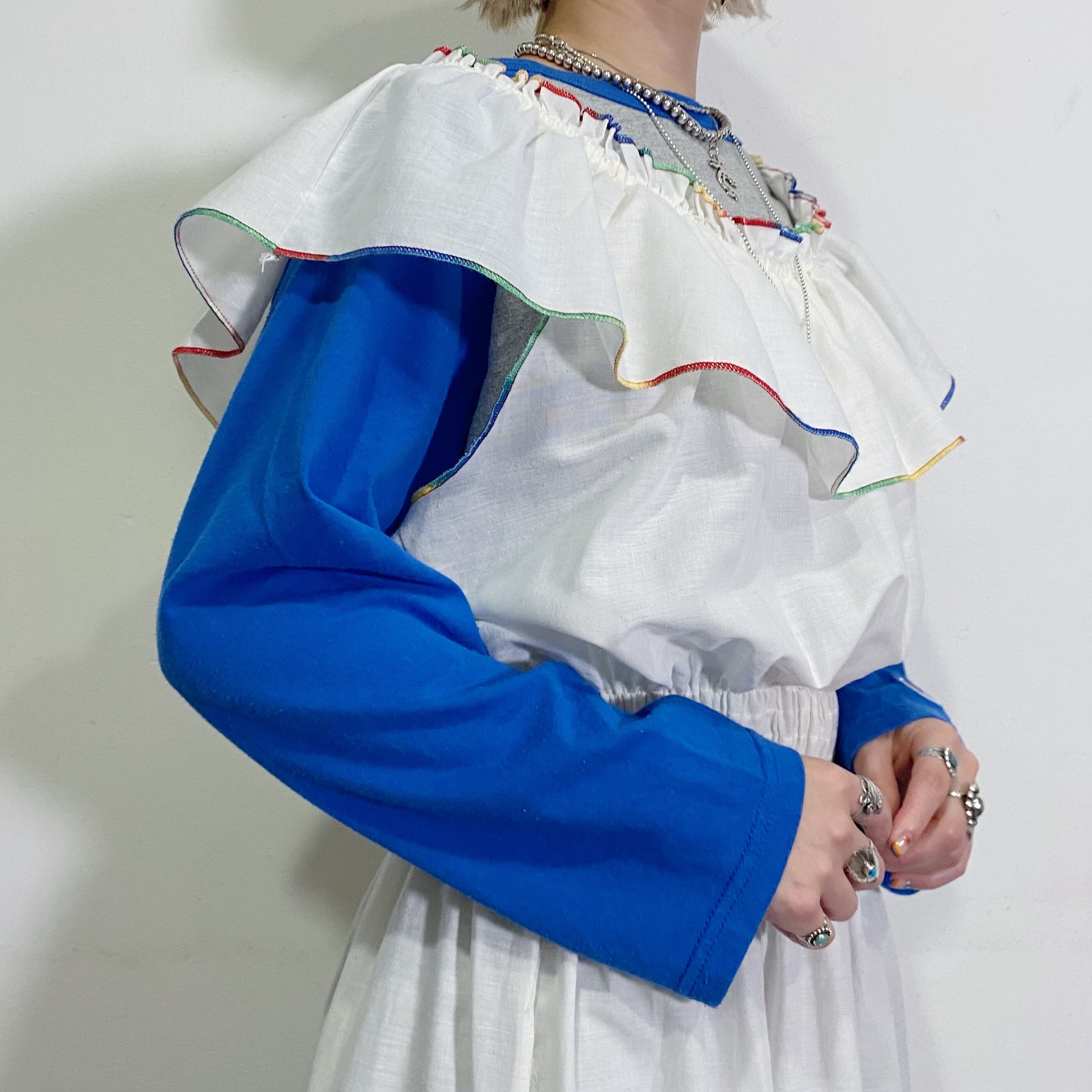 ホワイトベースにレインボーの縁取りが可愛い、70年代のワンピースです。