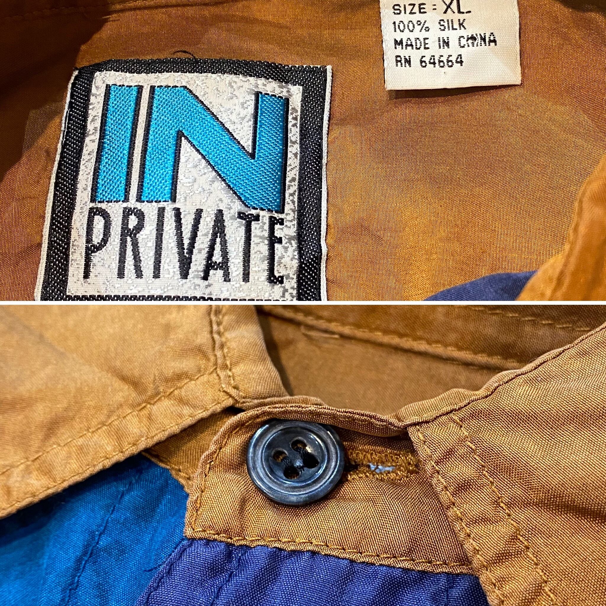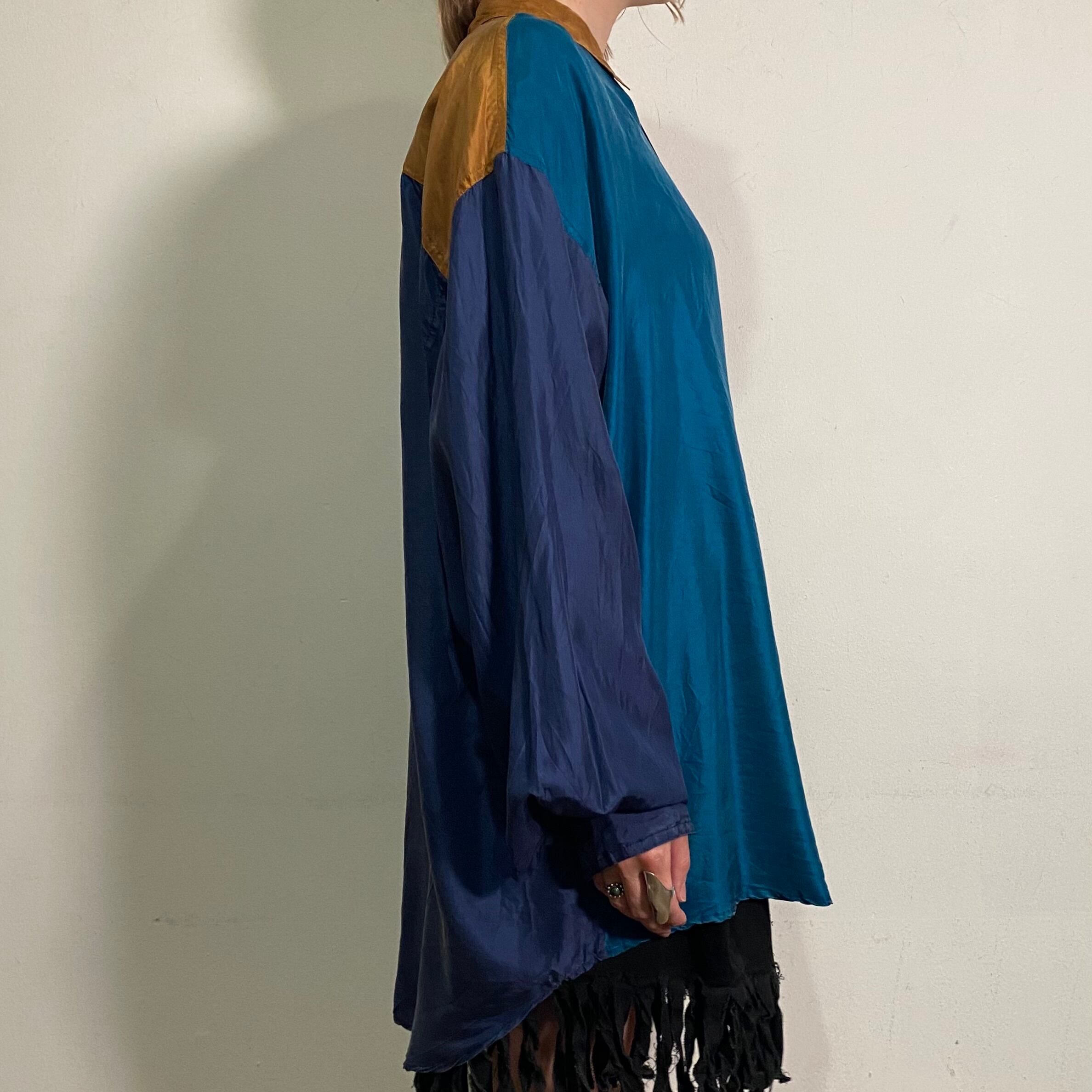 ブルーやブラウンの切り替えが可愛い、長袖のシルクシャツです。