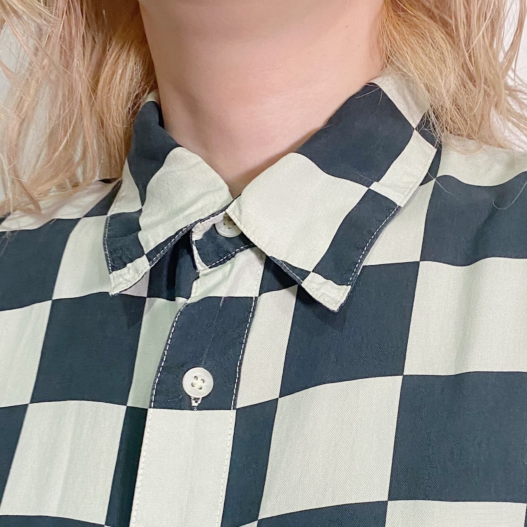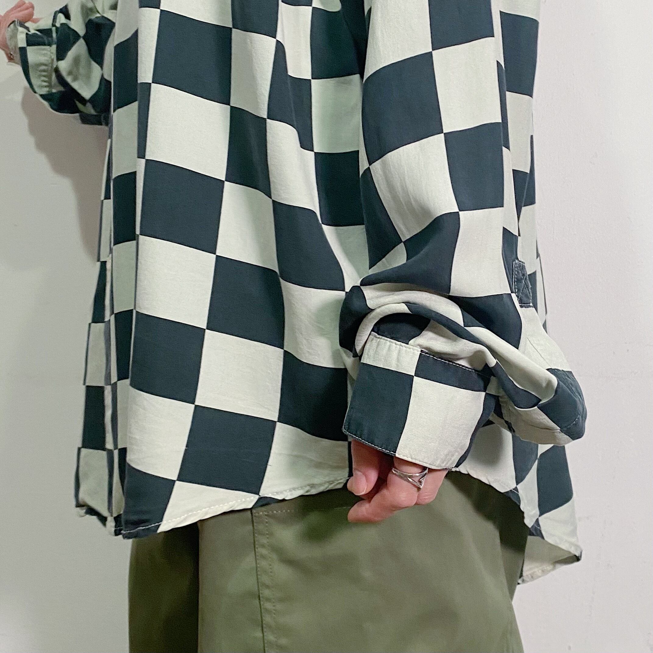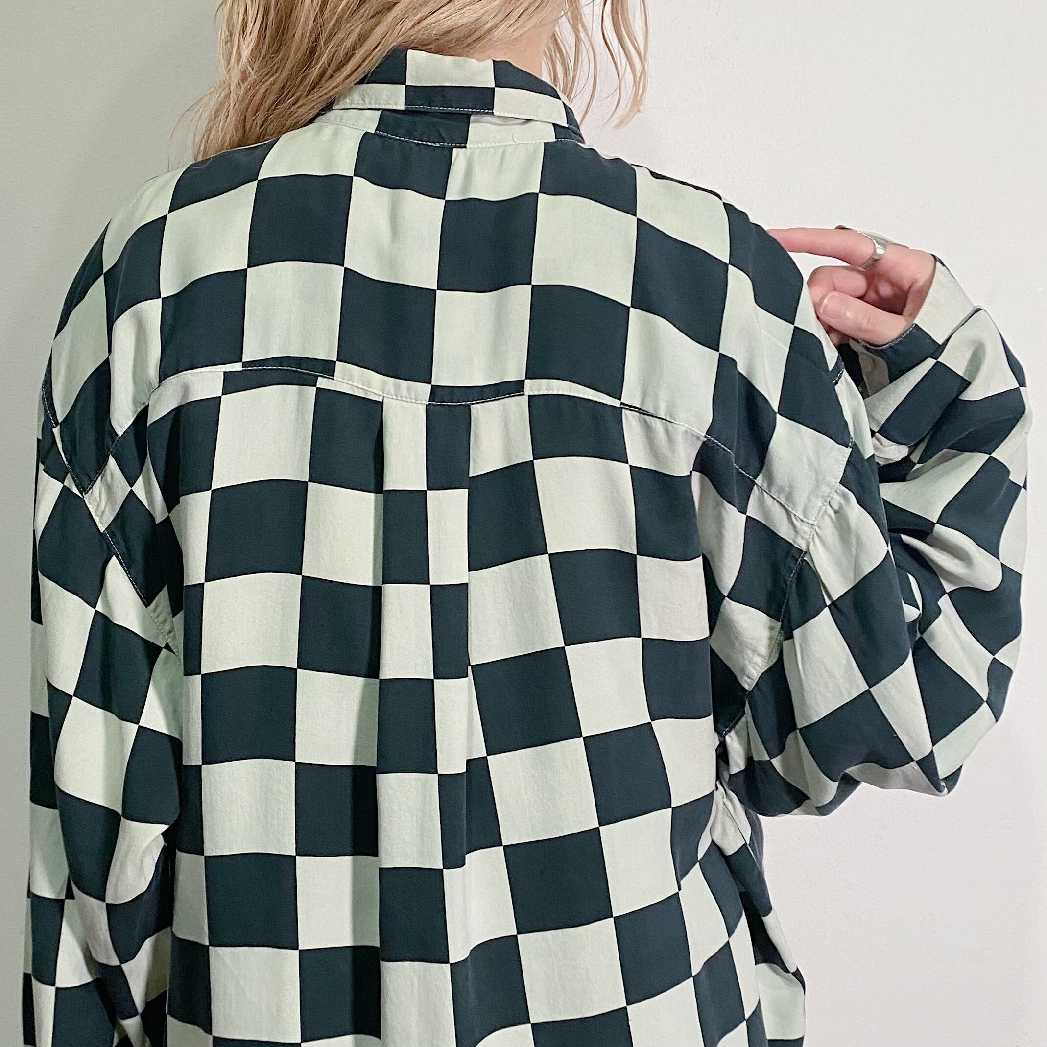 モノトーンカラーのブロックチェックが可愛い、長袖のシルクシャツです。
