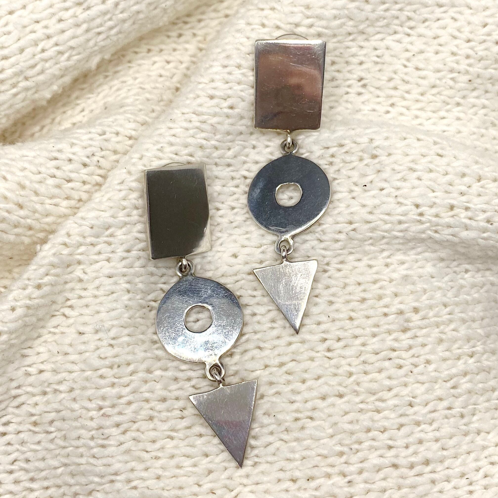 四角、丸、三角が連なった、925シルバーのピアスです。