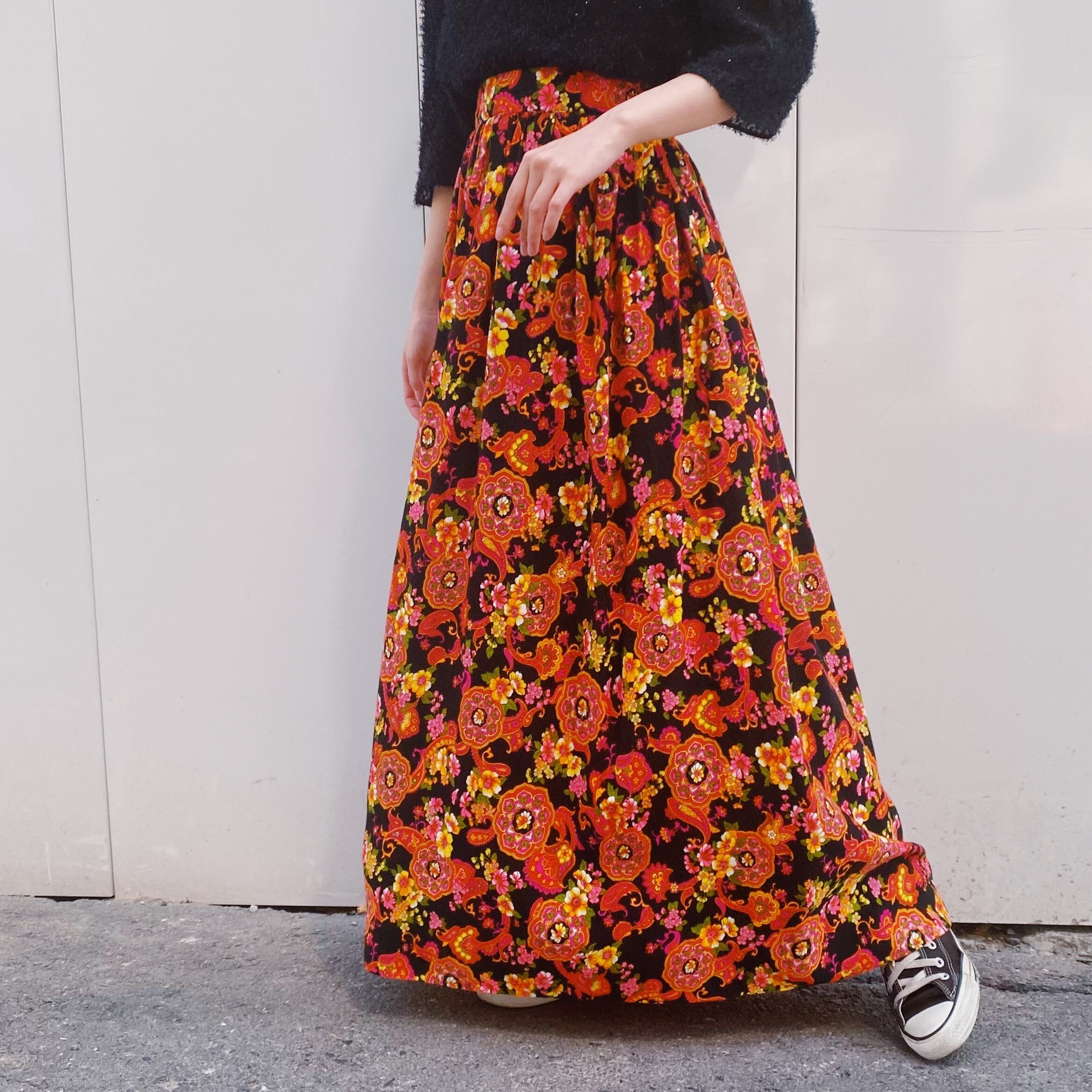 オレンジやピンクの花柄が可愛い、70年代のスカートです。