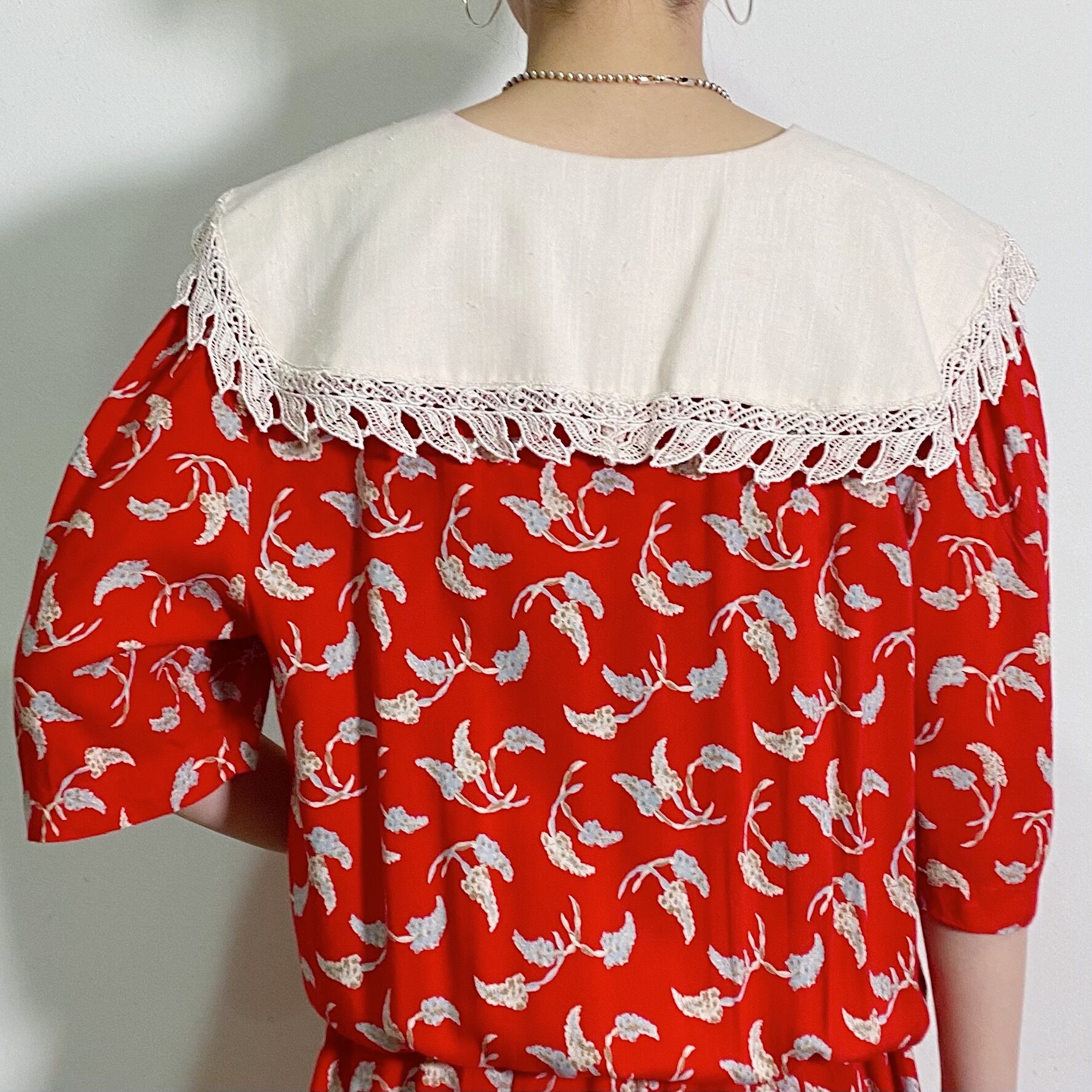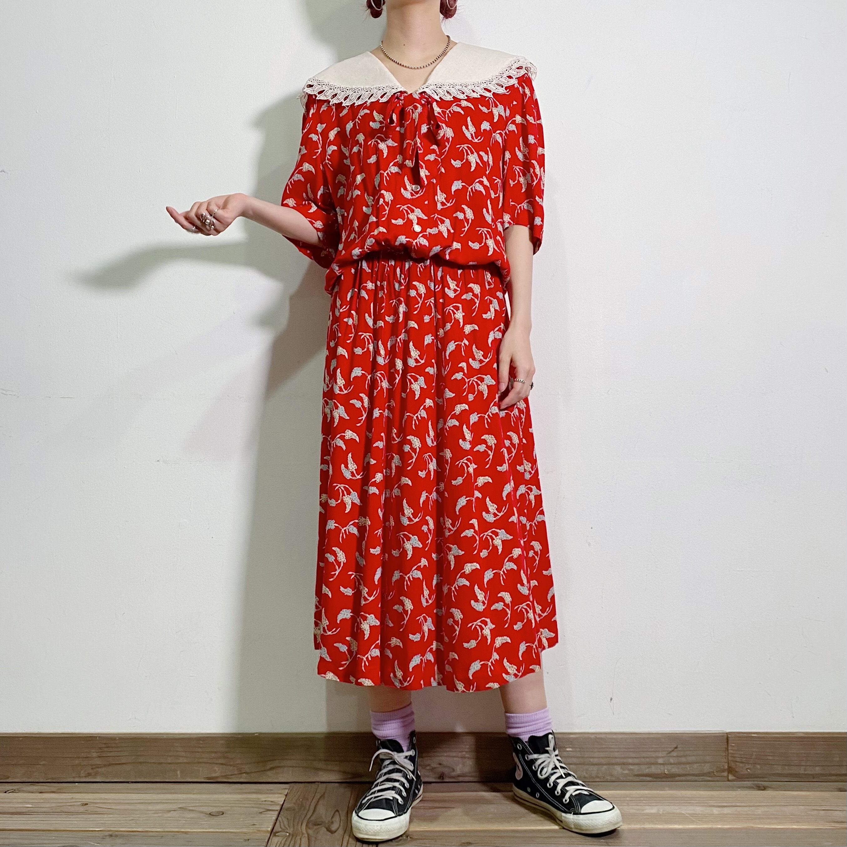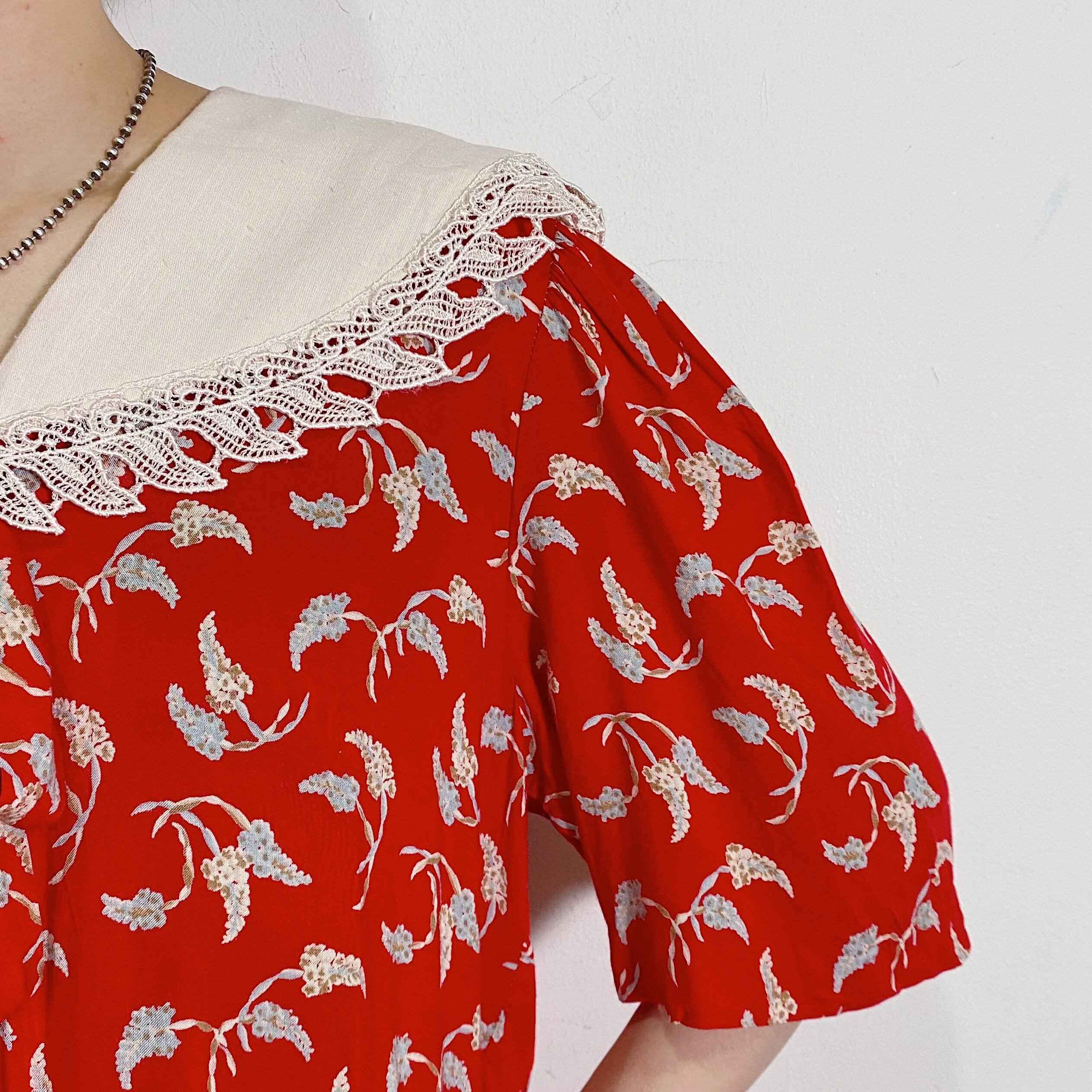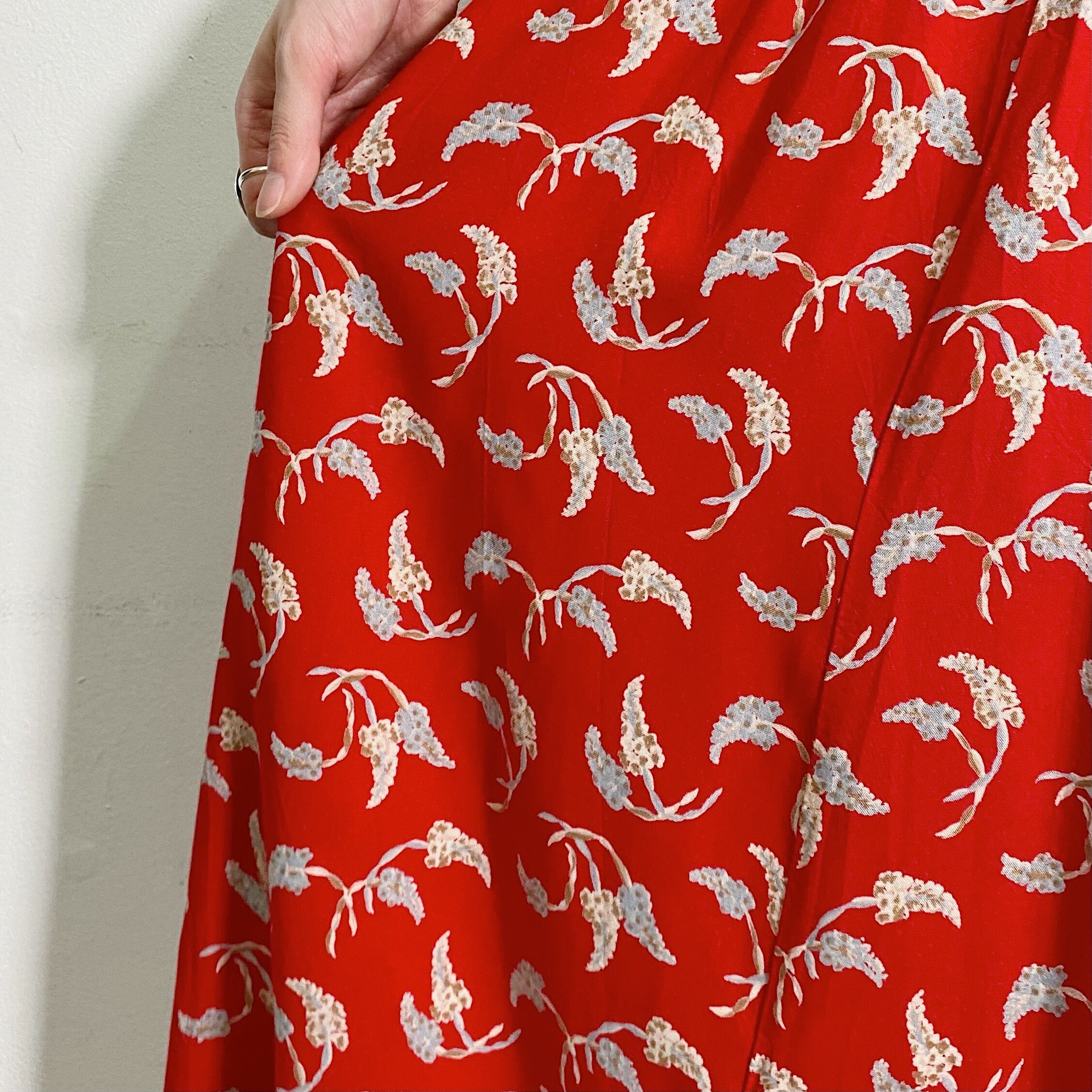 レッドベースにボタニカルなテキスタイルのレーヨンワンピースです。