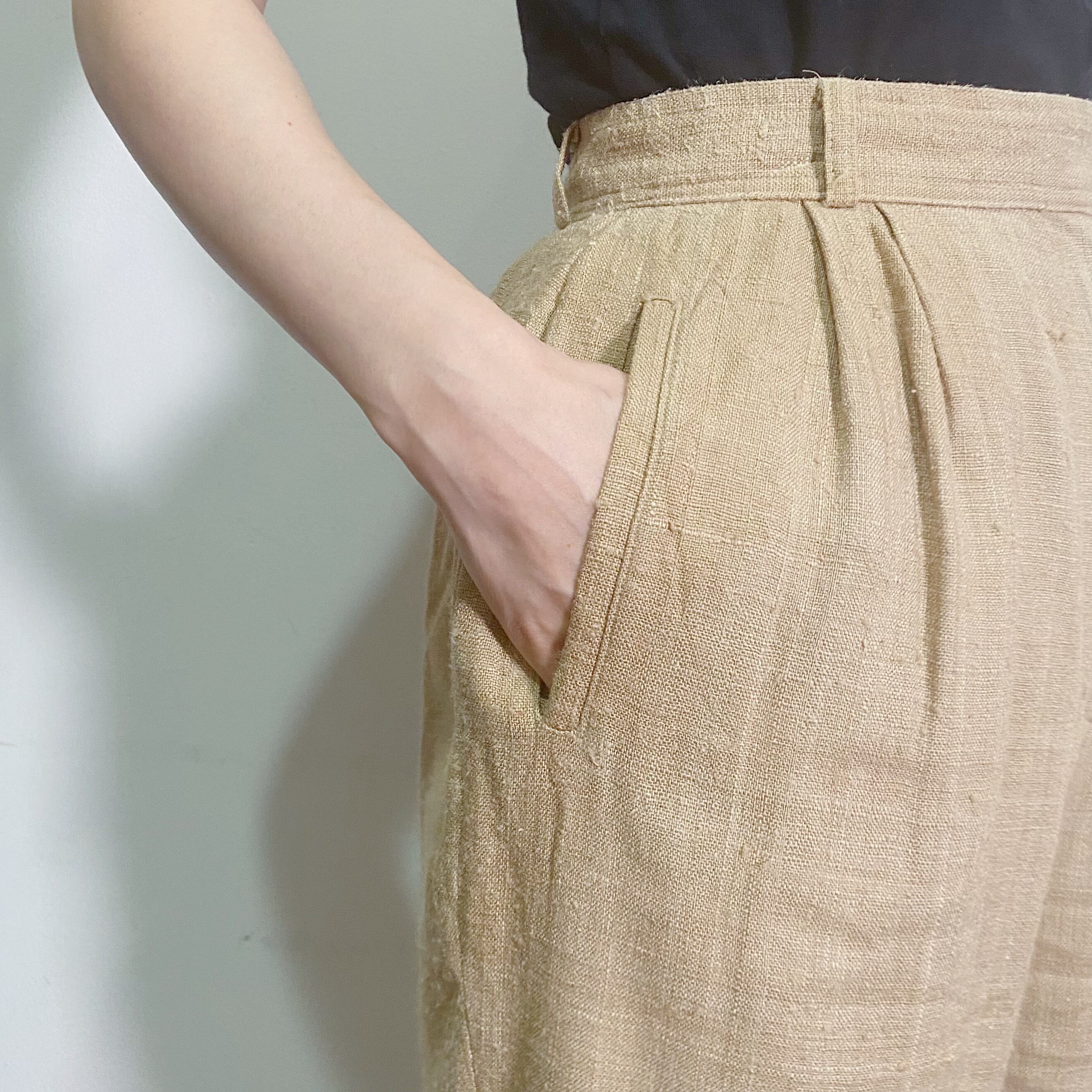 ベージュでコーディネートに取り入れやすい、シルク100%のパンツです。
