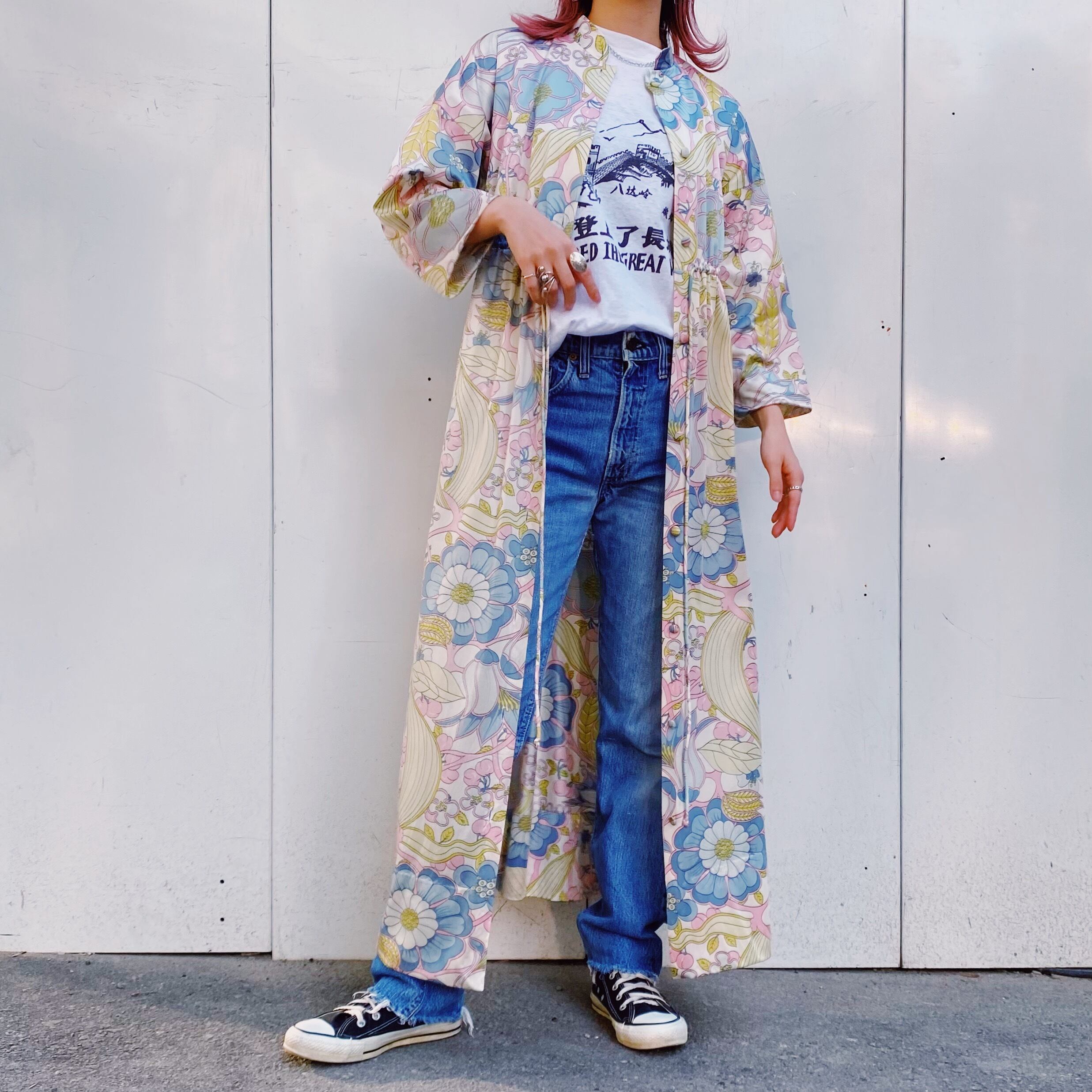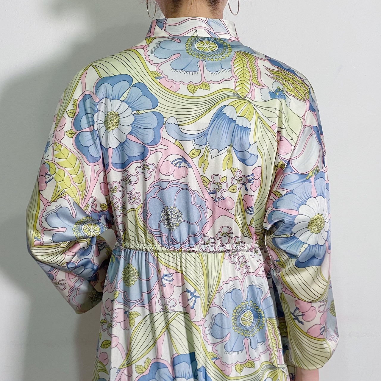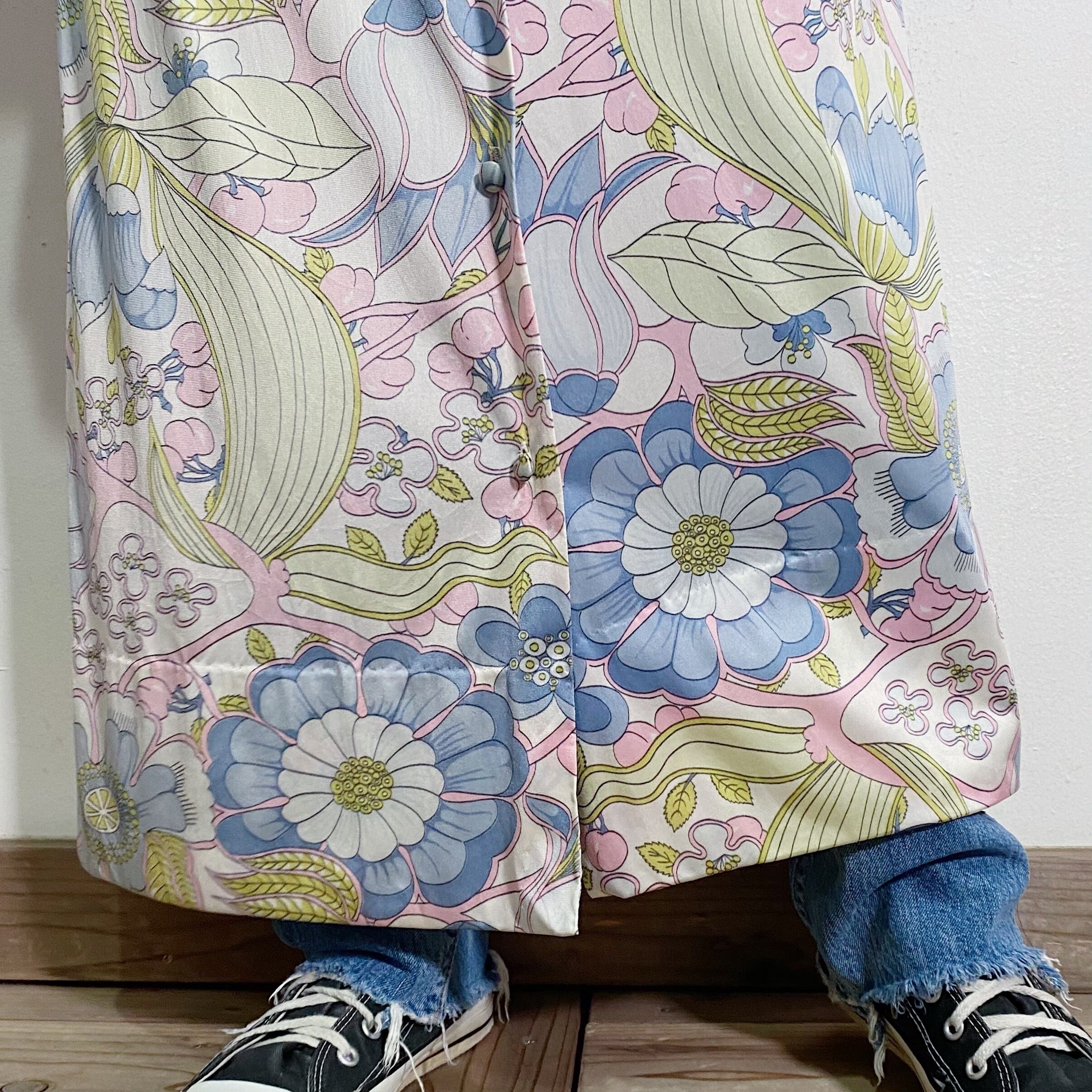 お花や果実のようなプリントが可愛い、70年代のワンピースです。