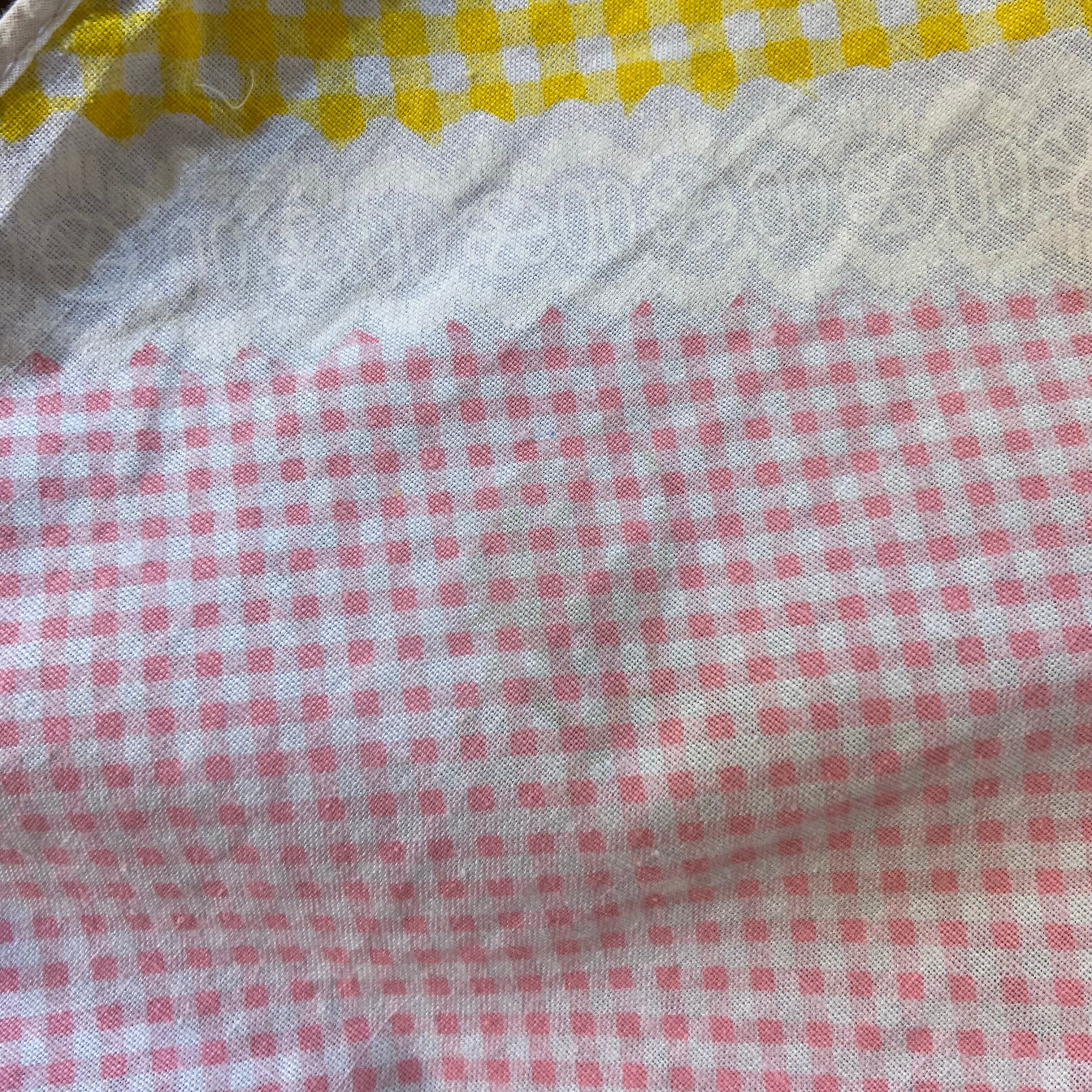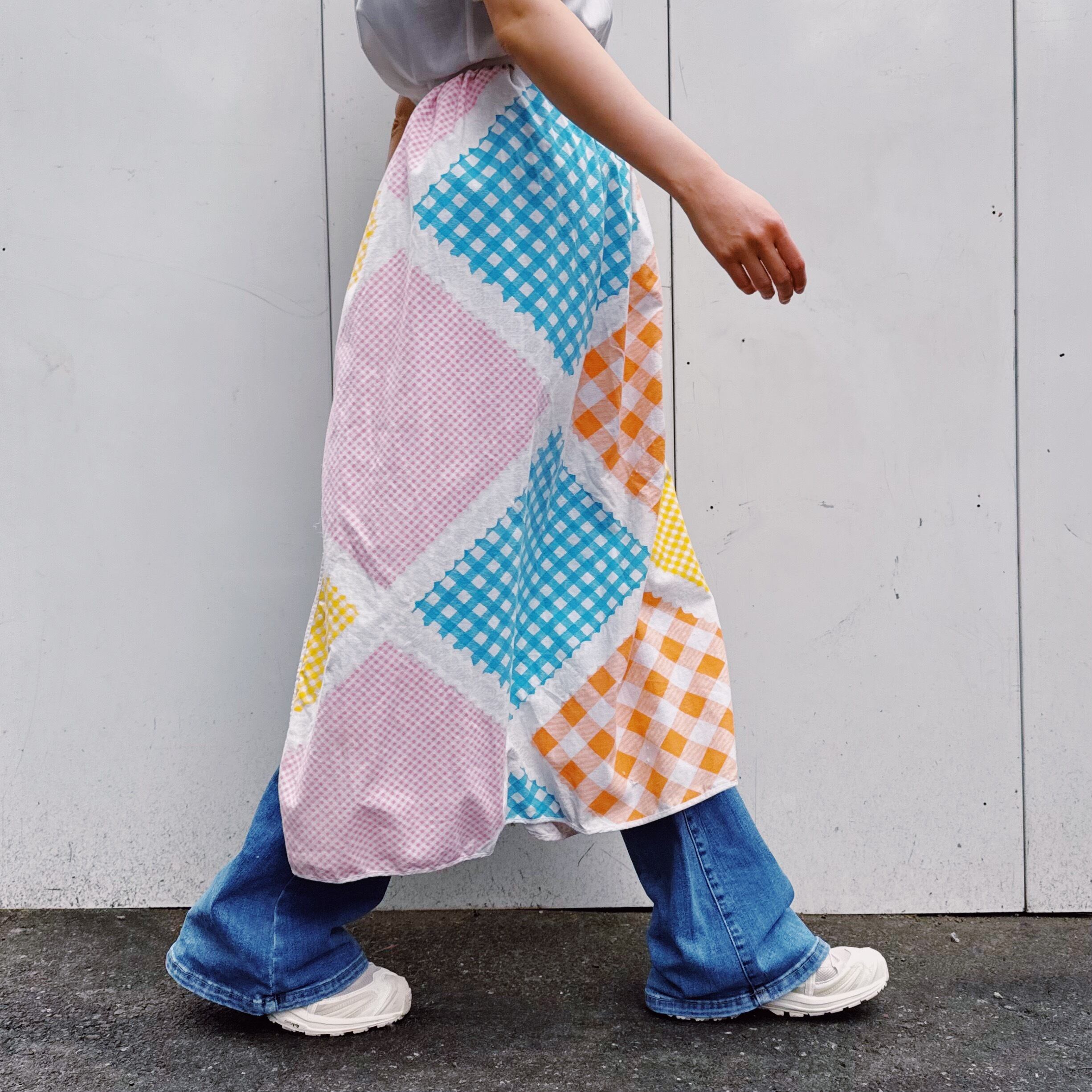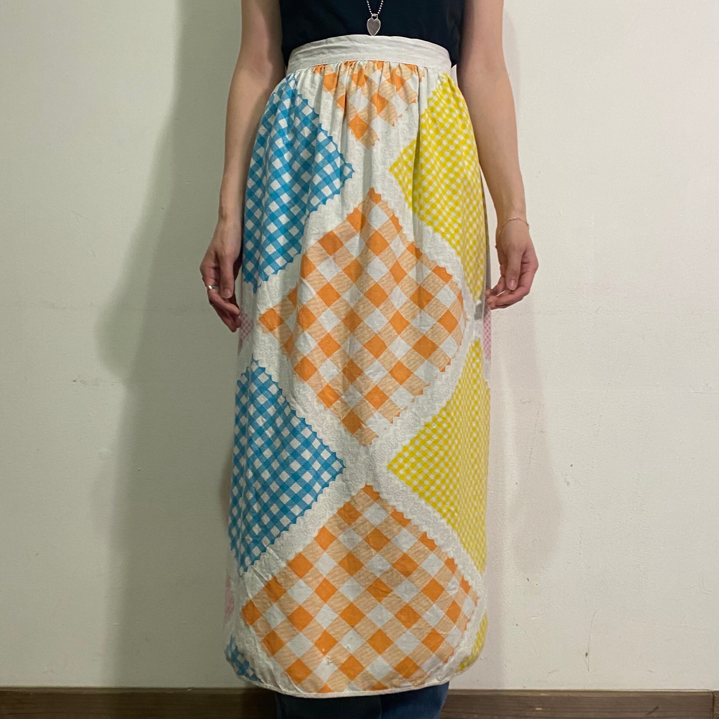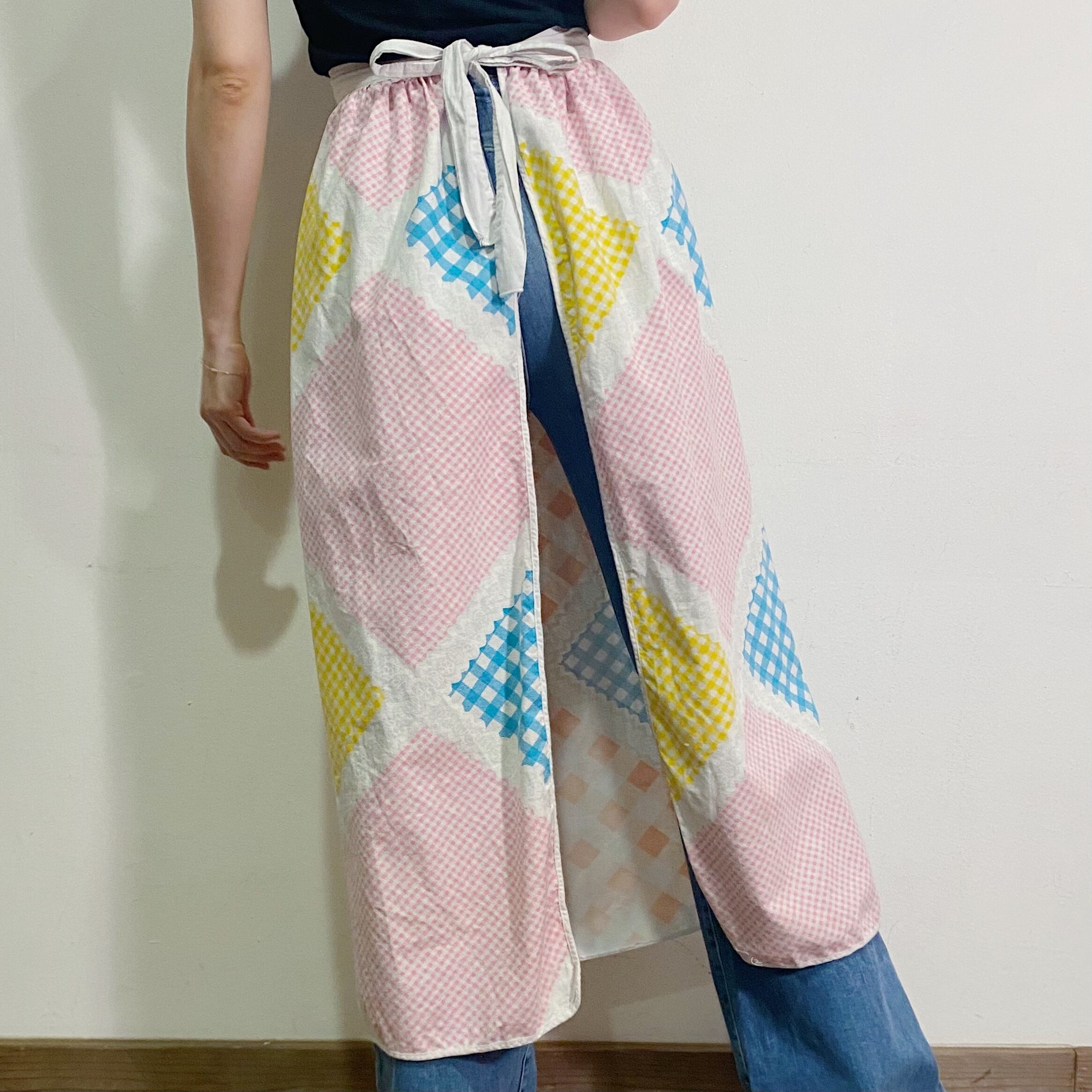 パステルカラーのギンガムチェックのパッチワーク柄がとっても可愛い、70年代のエプロンスカートです。