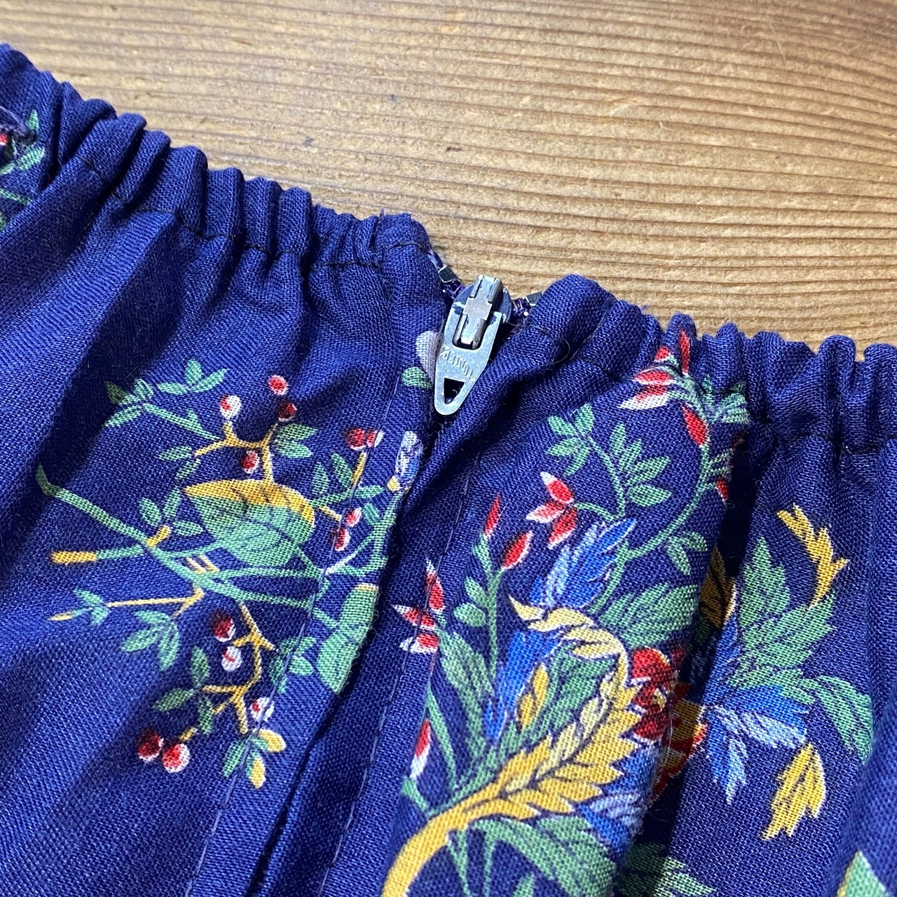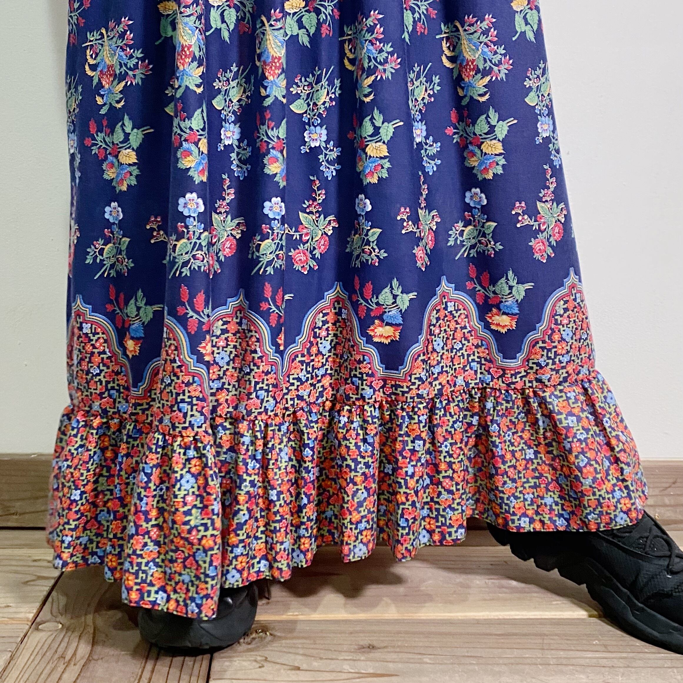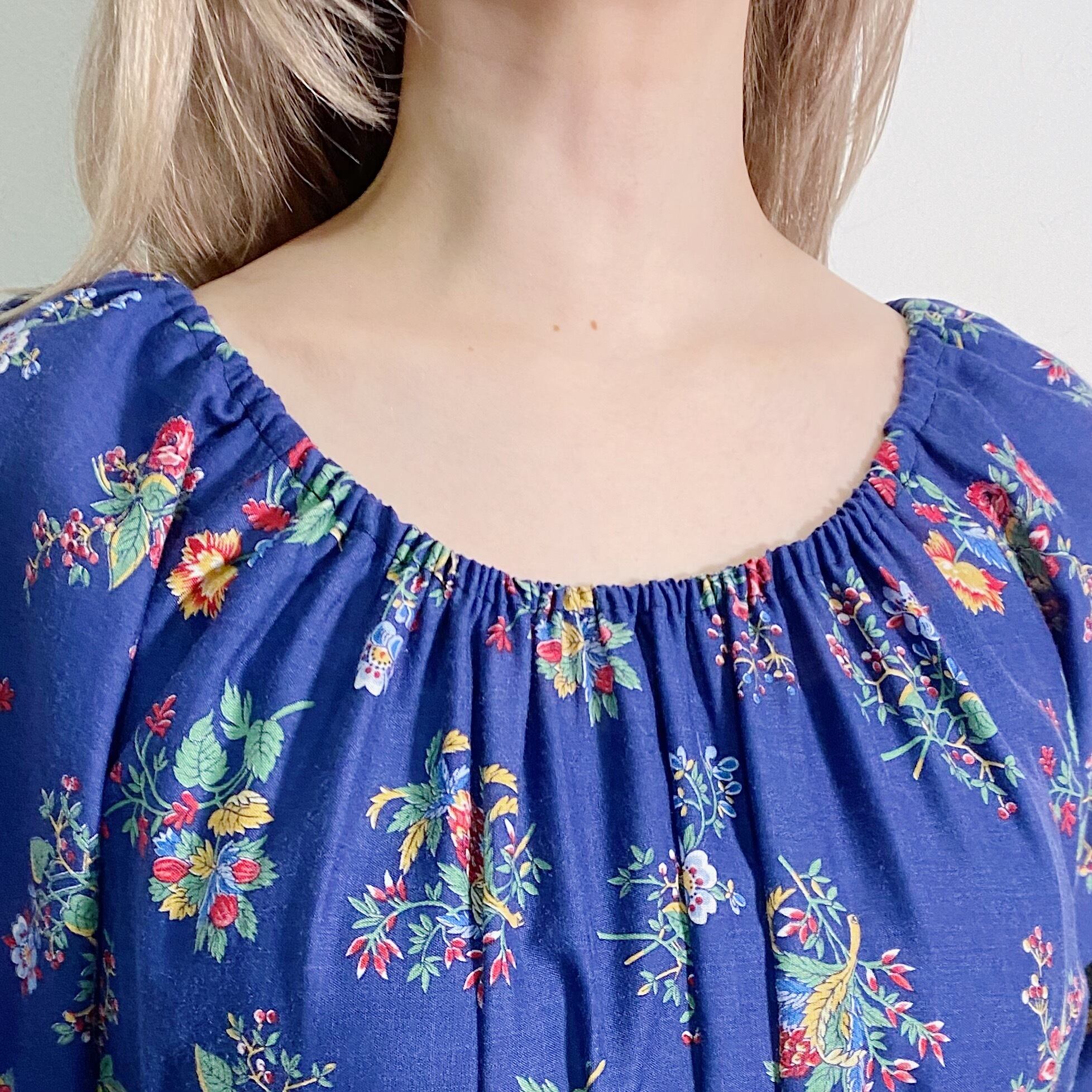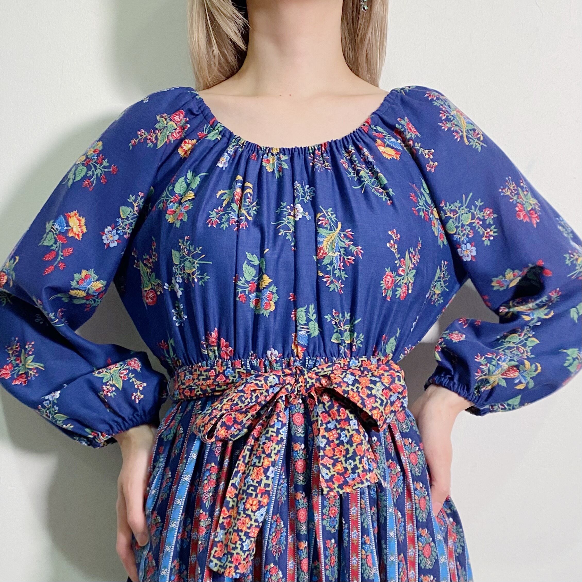 ネイビーベースの花柄が可愛い、70年代のワンピースです。