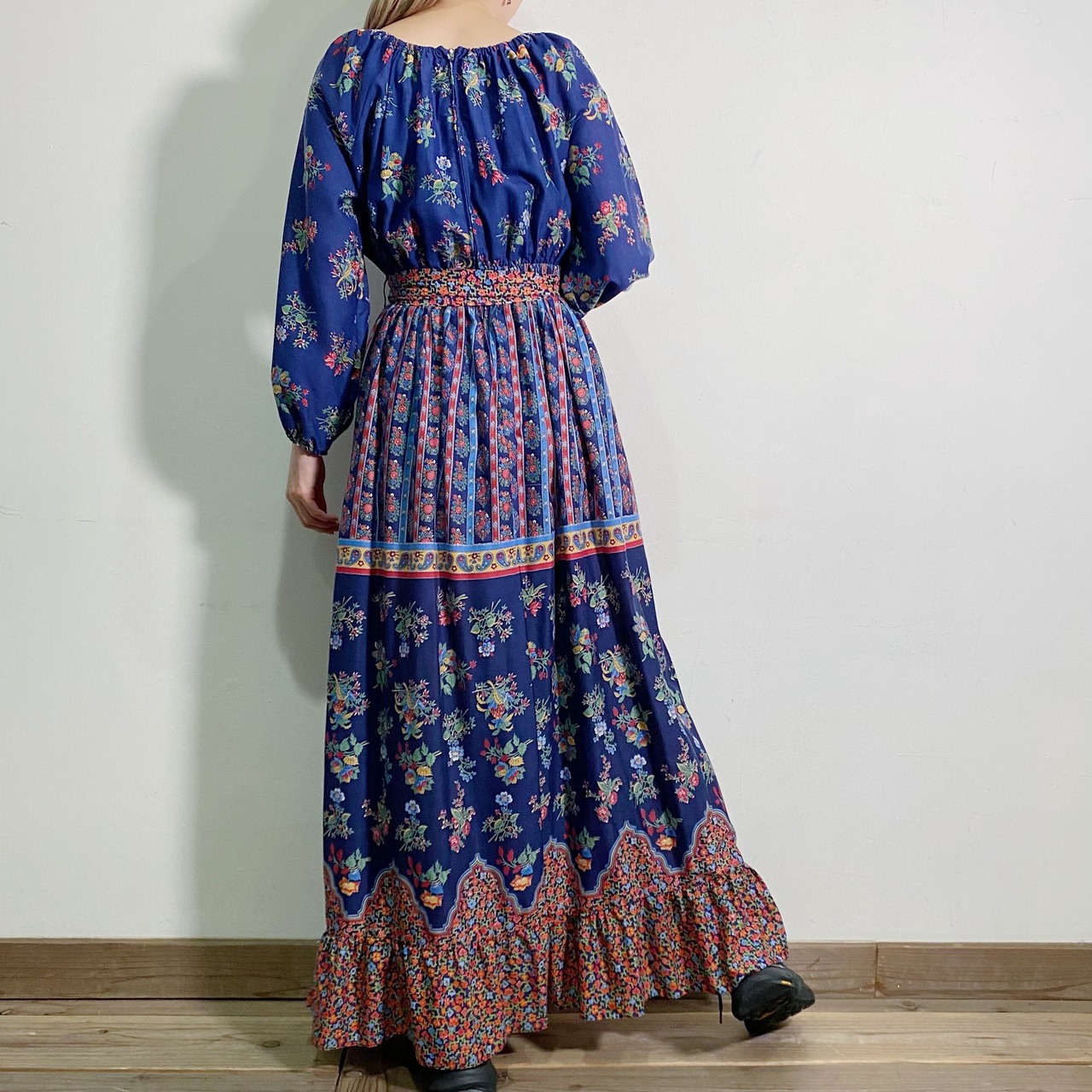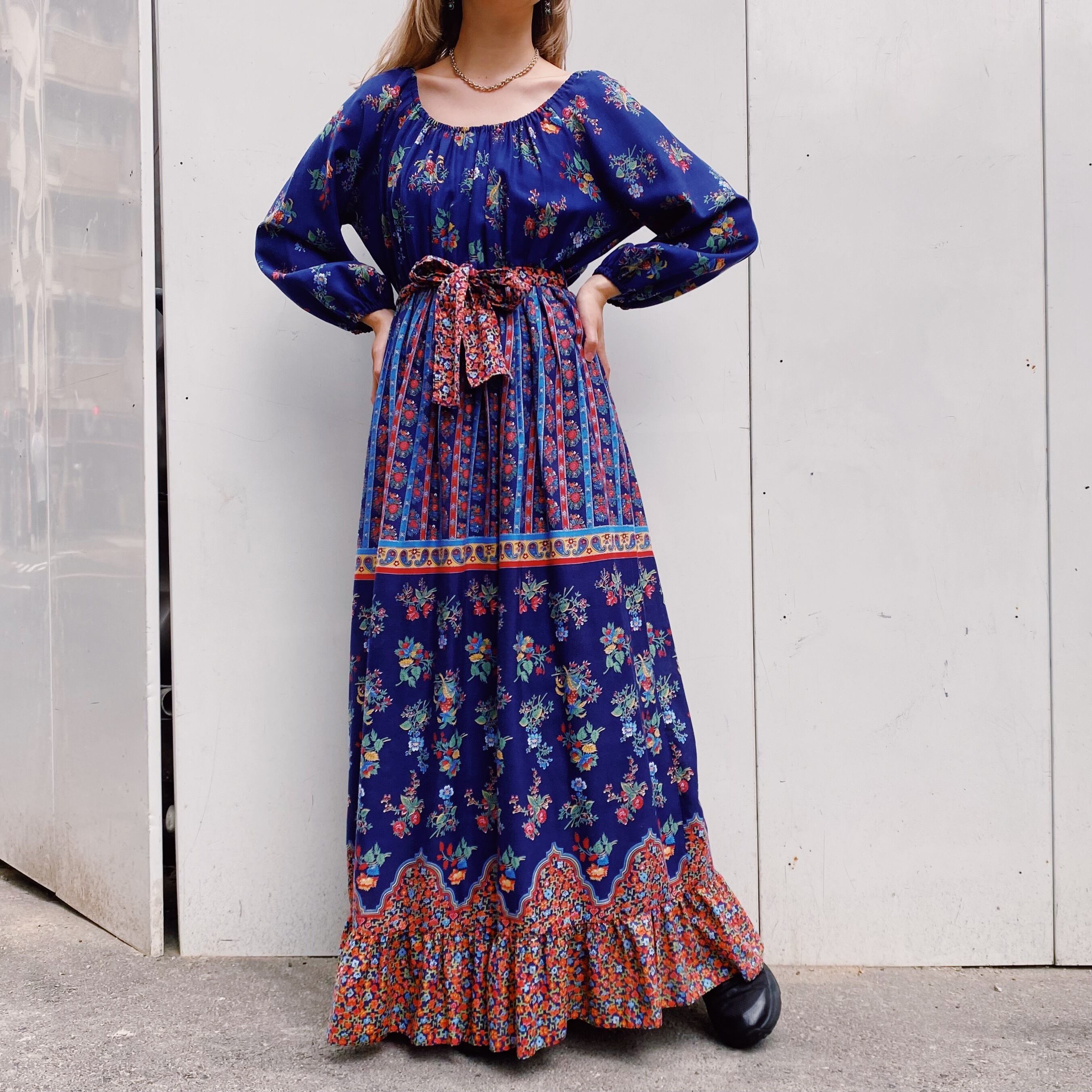 70s navy flower printed long dress