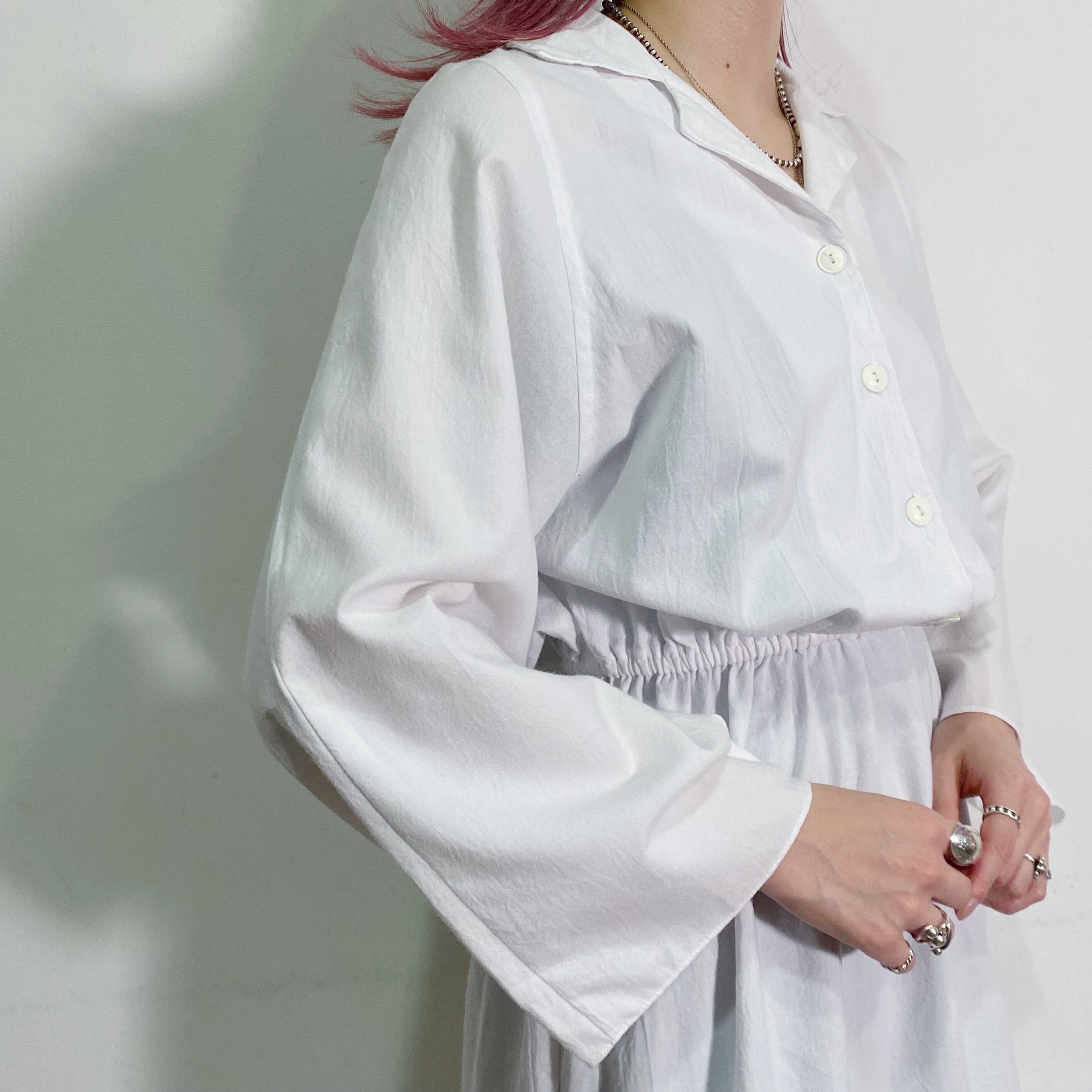 ウエストのゴムから広がるフレアシルエットや、広めに作られたお袖のデザインも魅力的。