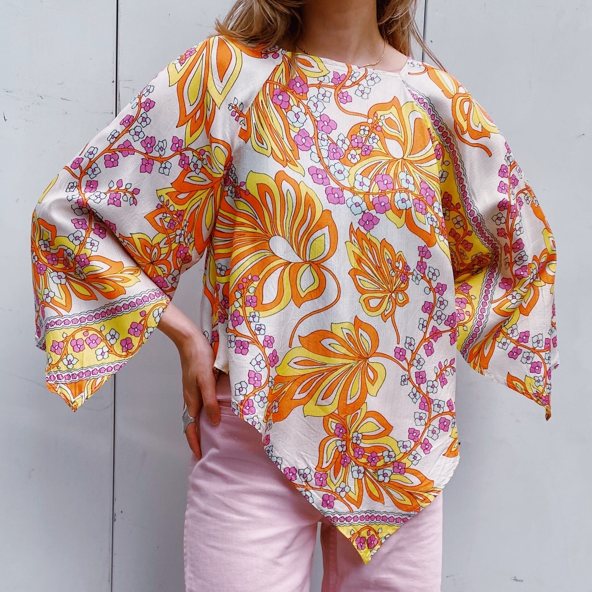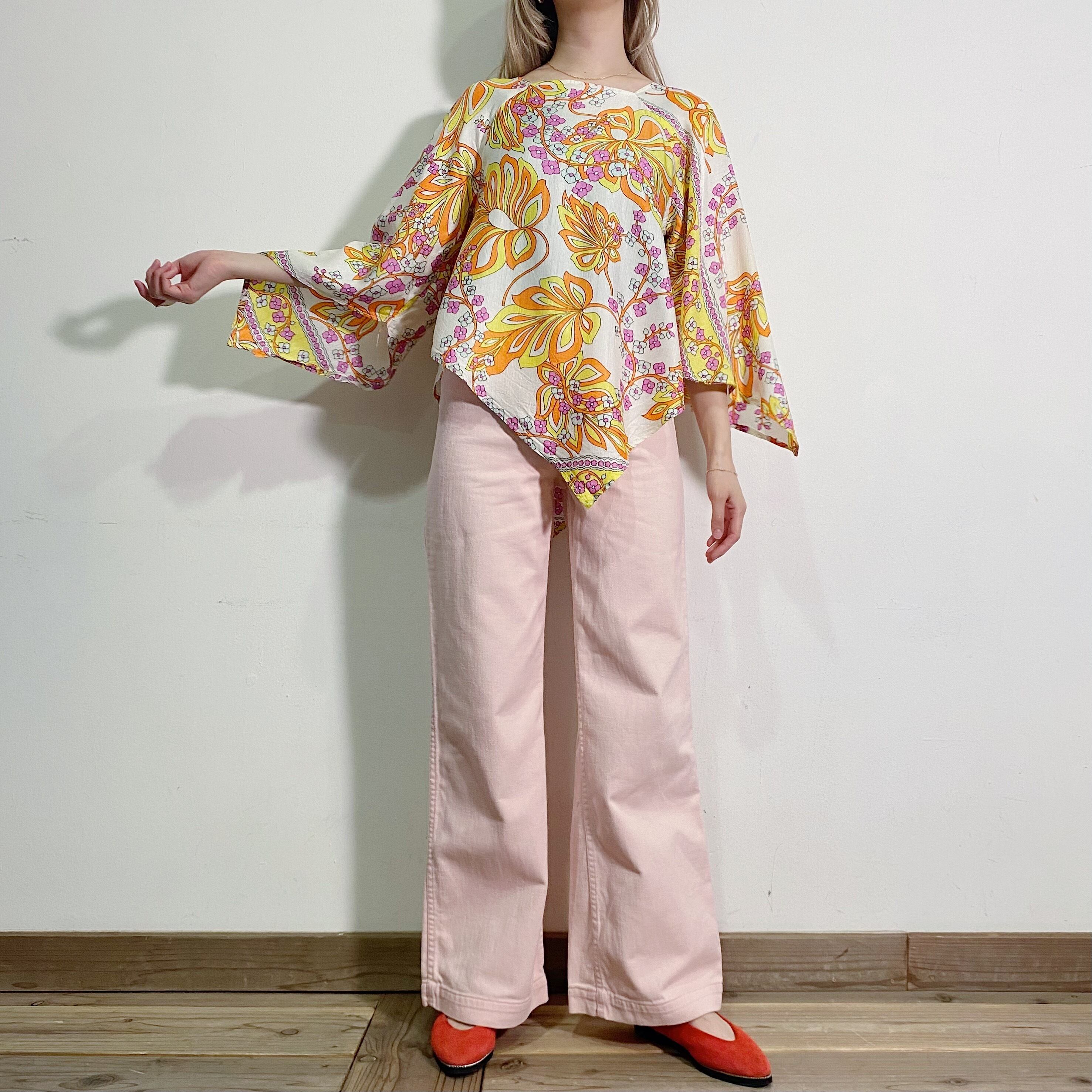 ピンクやイエロー、オレンジなどのハッピーな色合いが可愛い、70年代のチュニックです。
