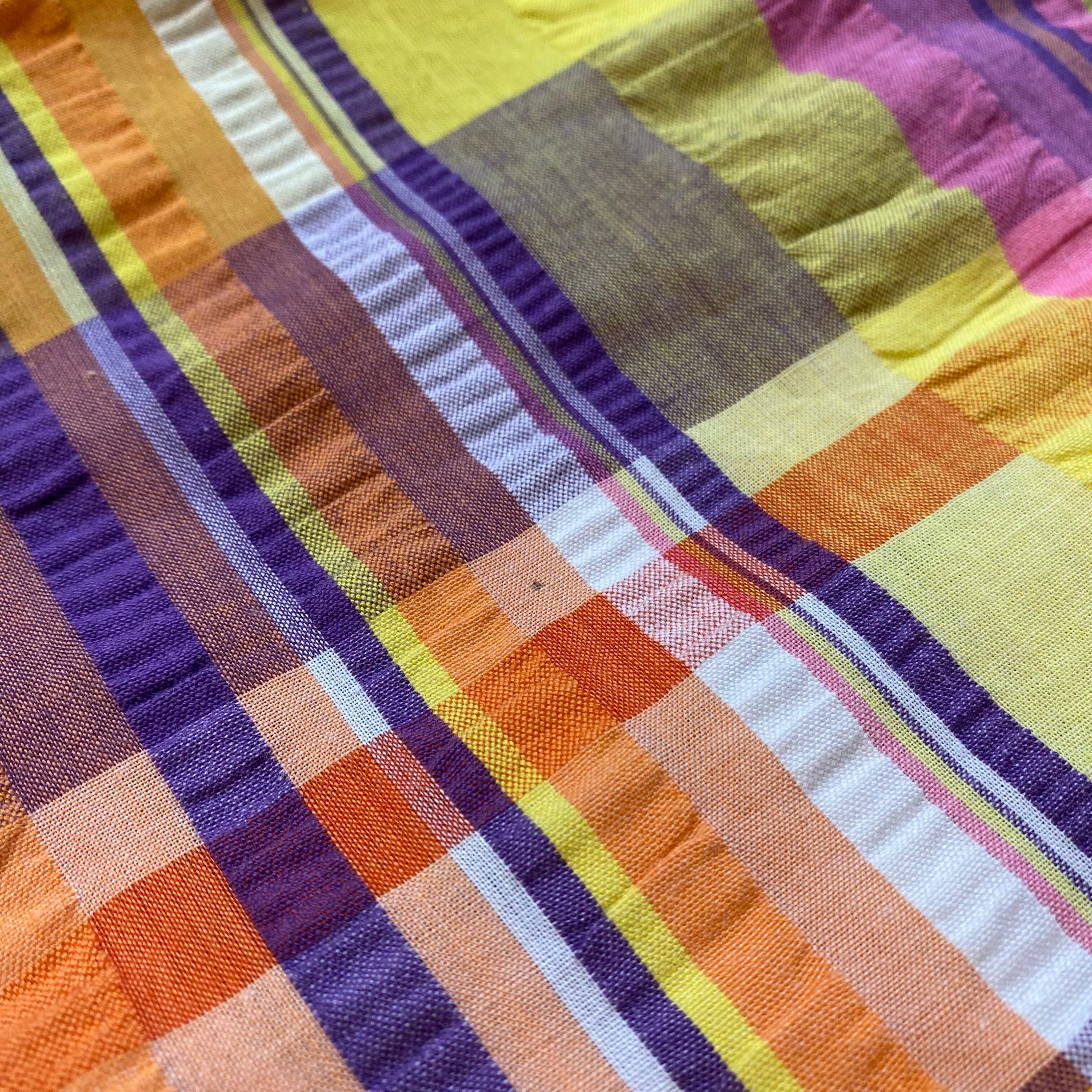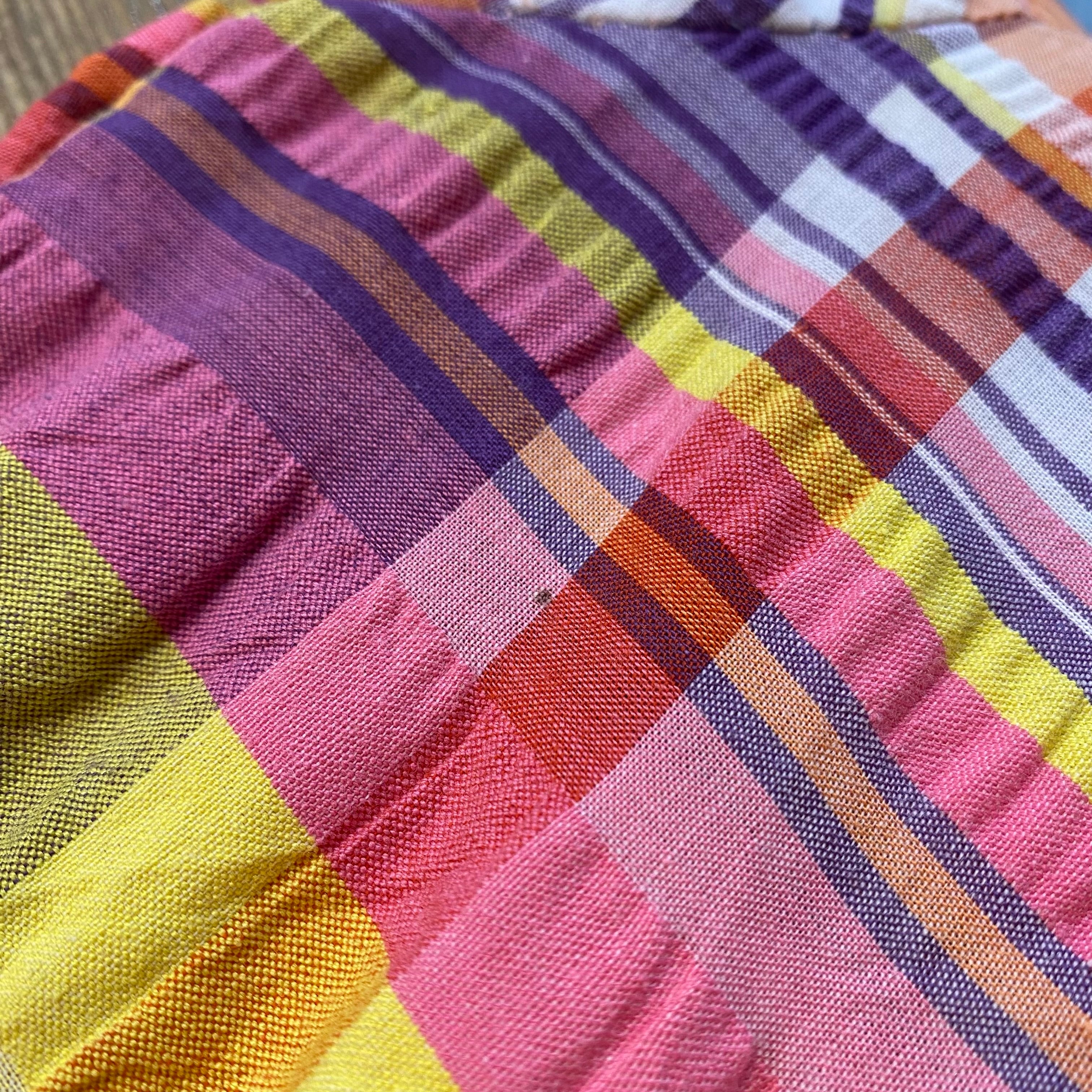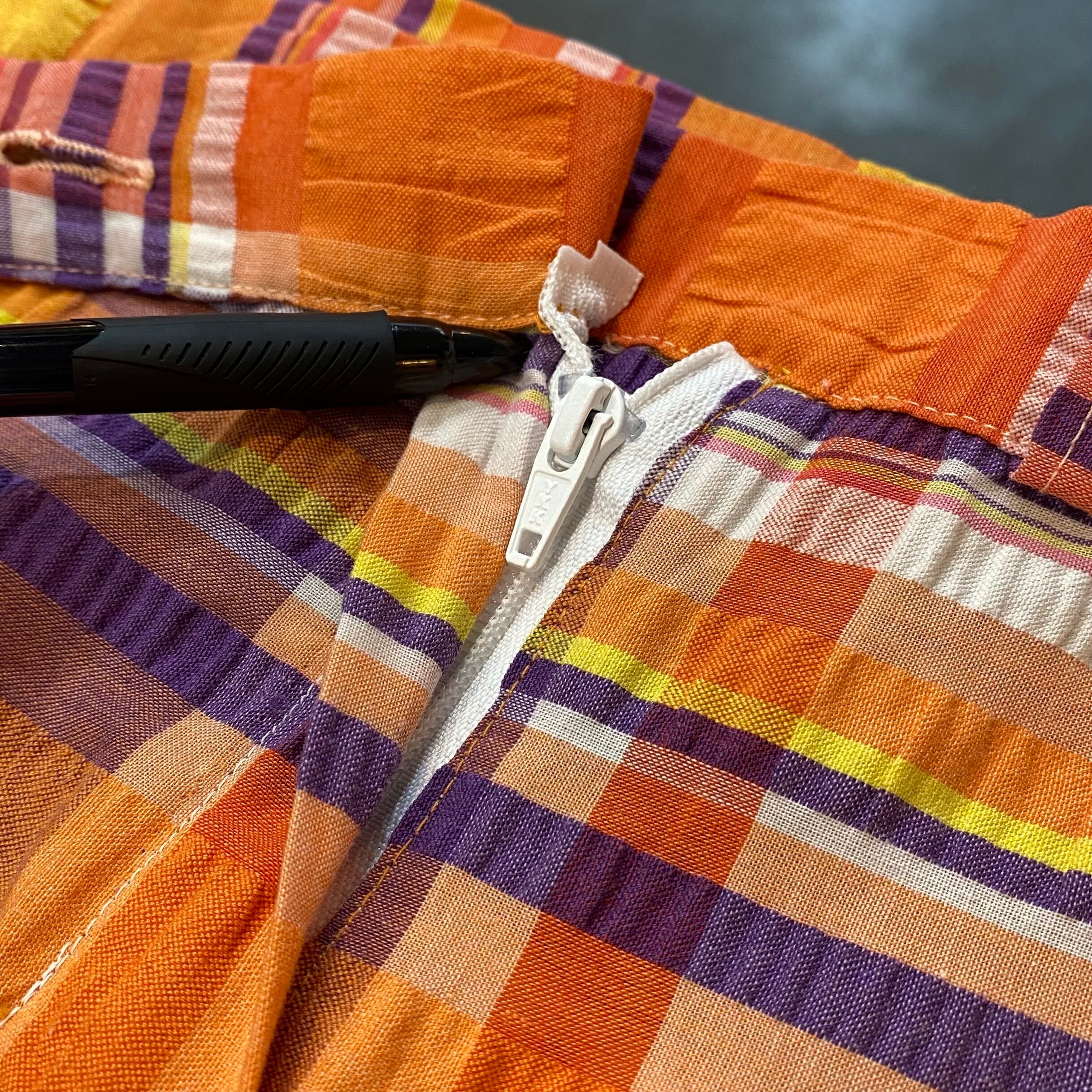 オレンジやピンクなどのハッピーな色合いが可愛い、70年代のチェックパンツです。