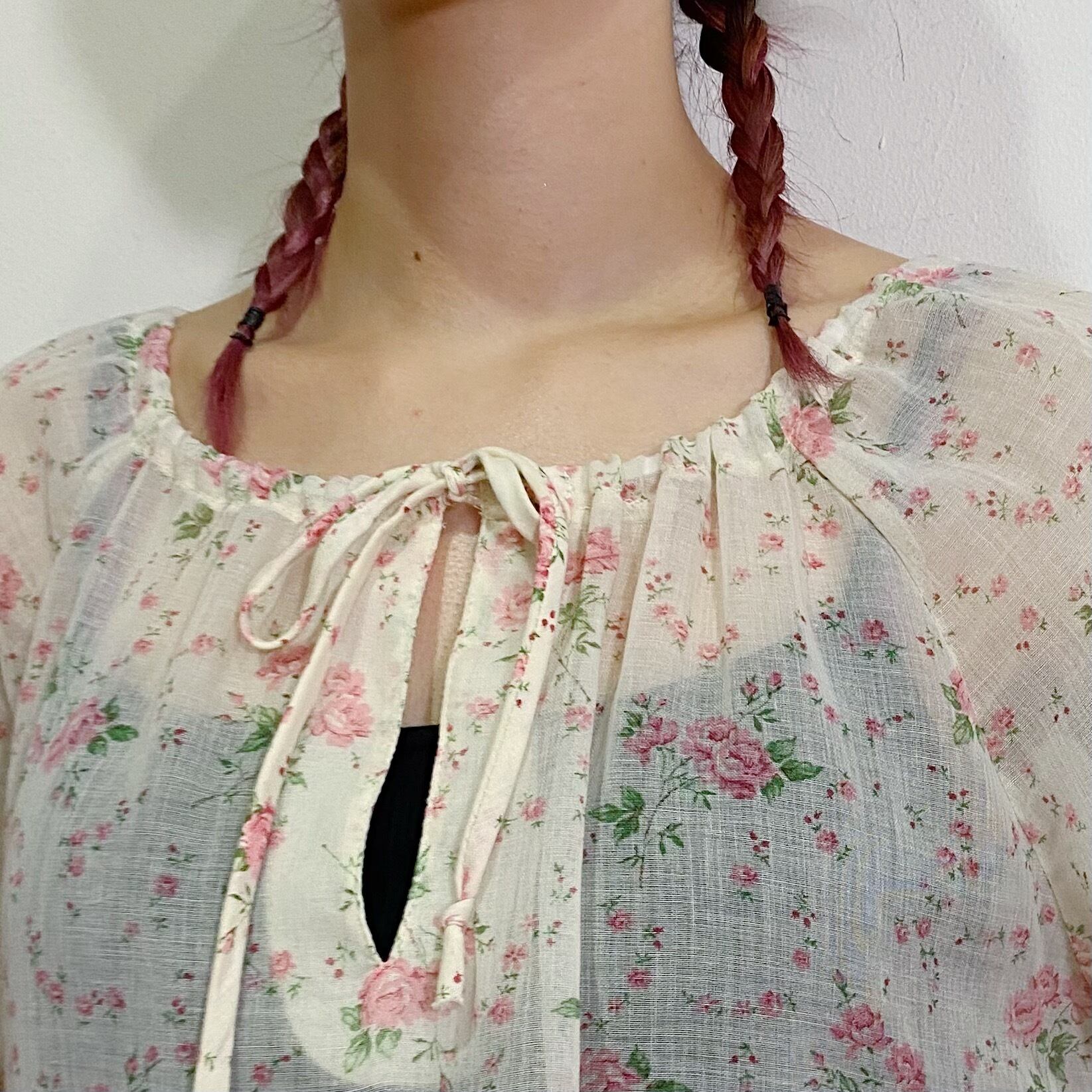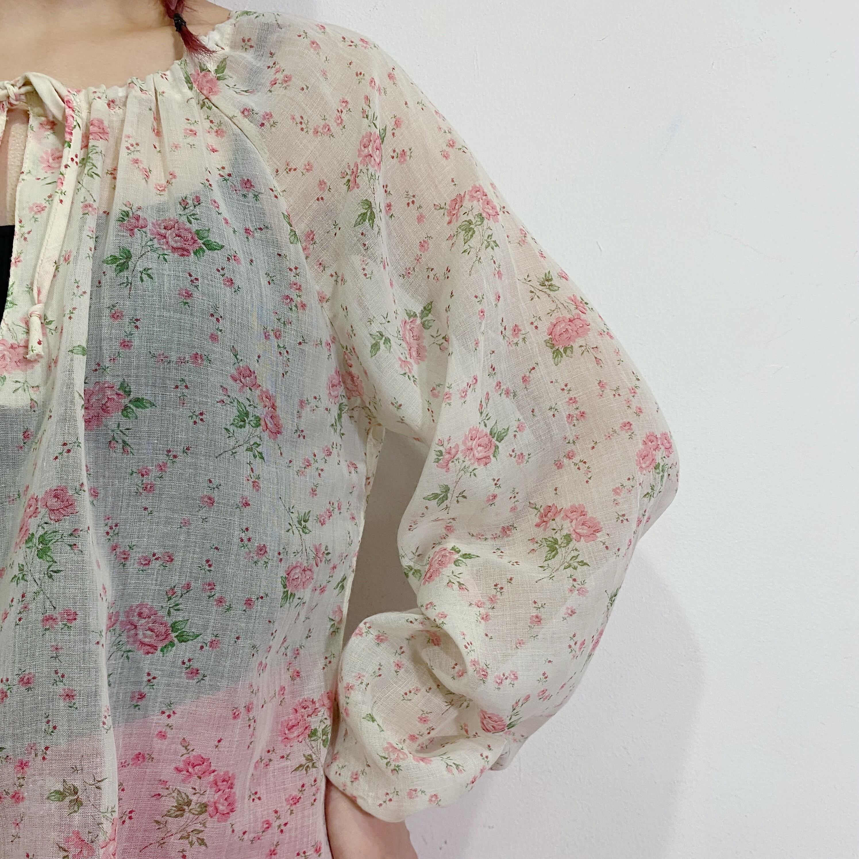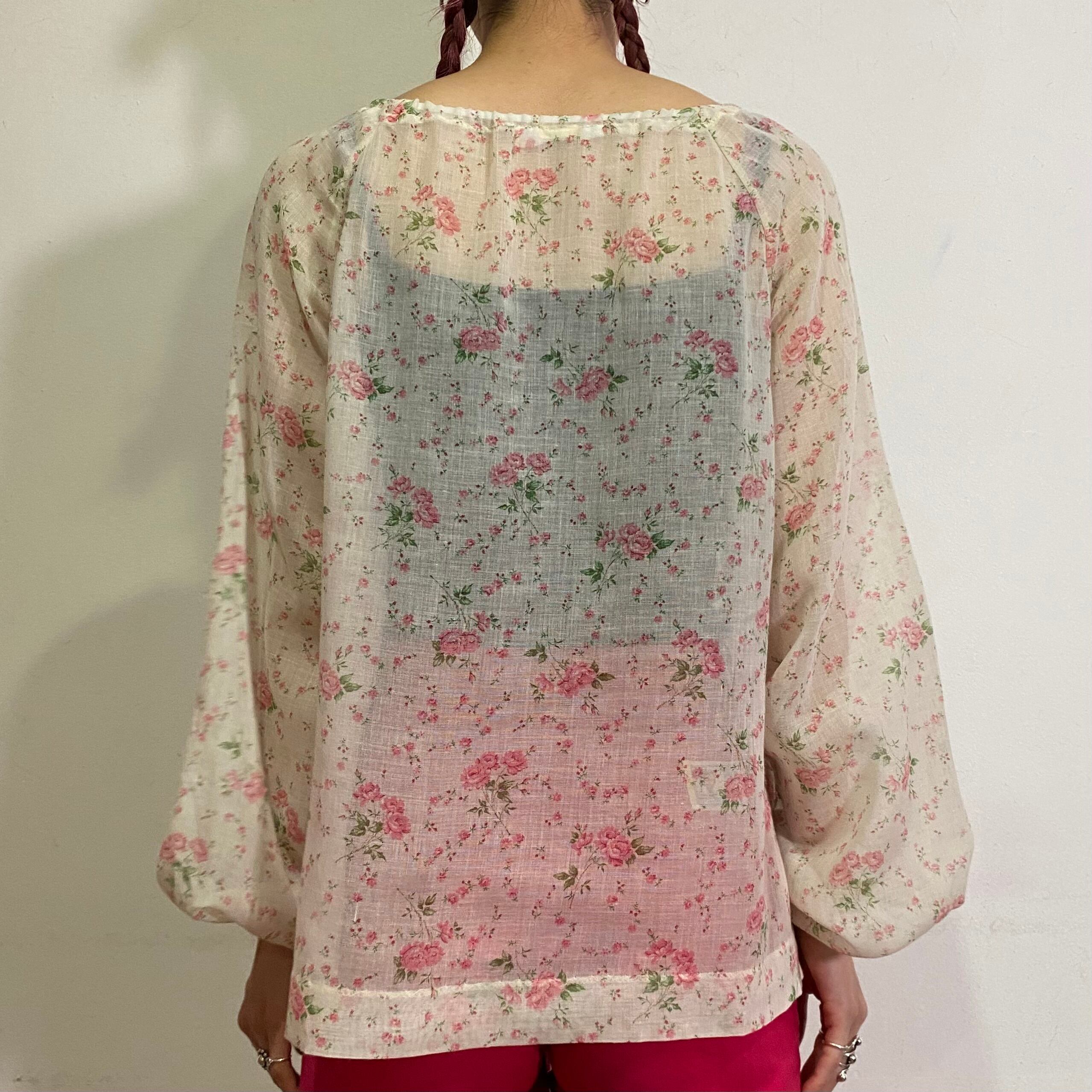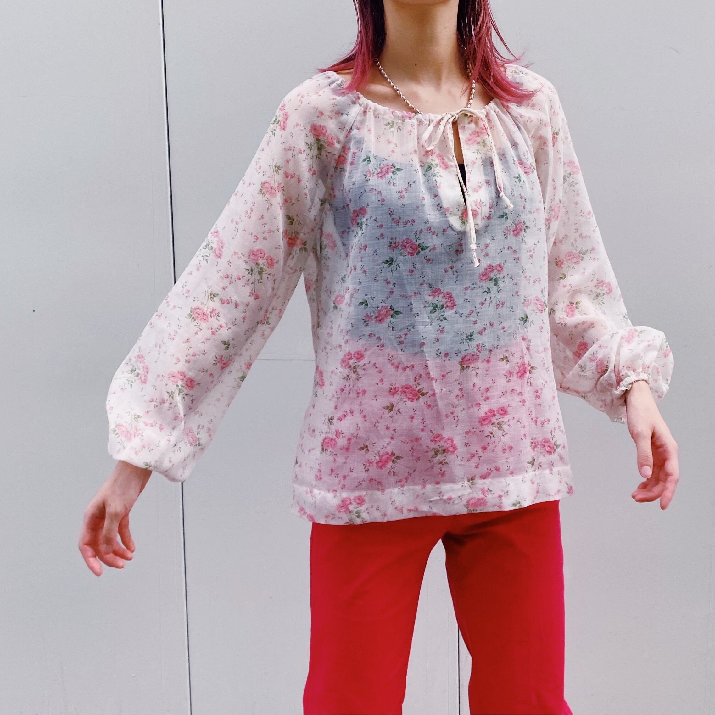 透け感のある柔らかなコットンガーゼ素材に、ピンクのお花のプリントが可愛い70年代のトップスです。