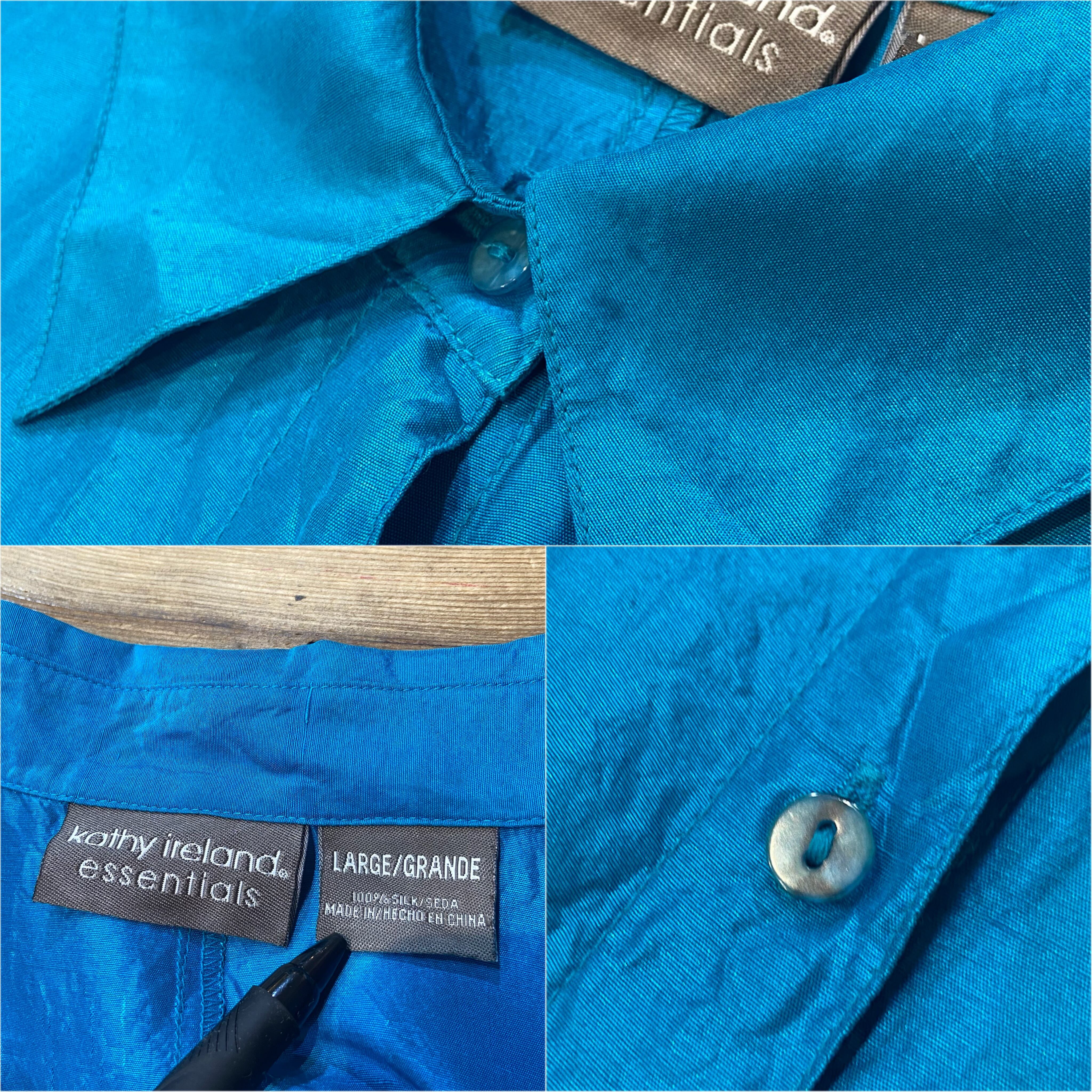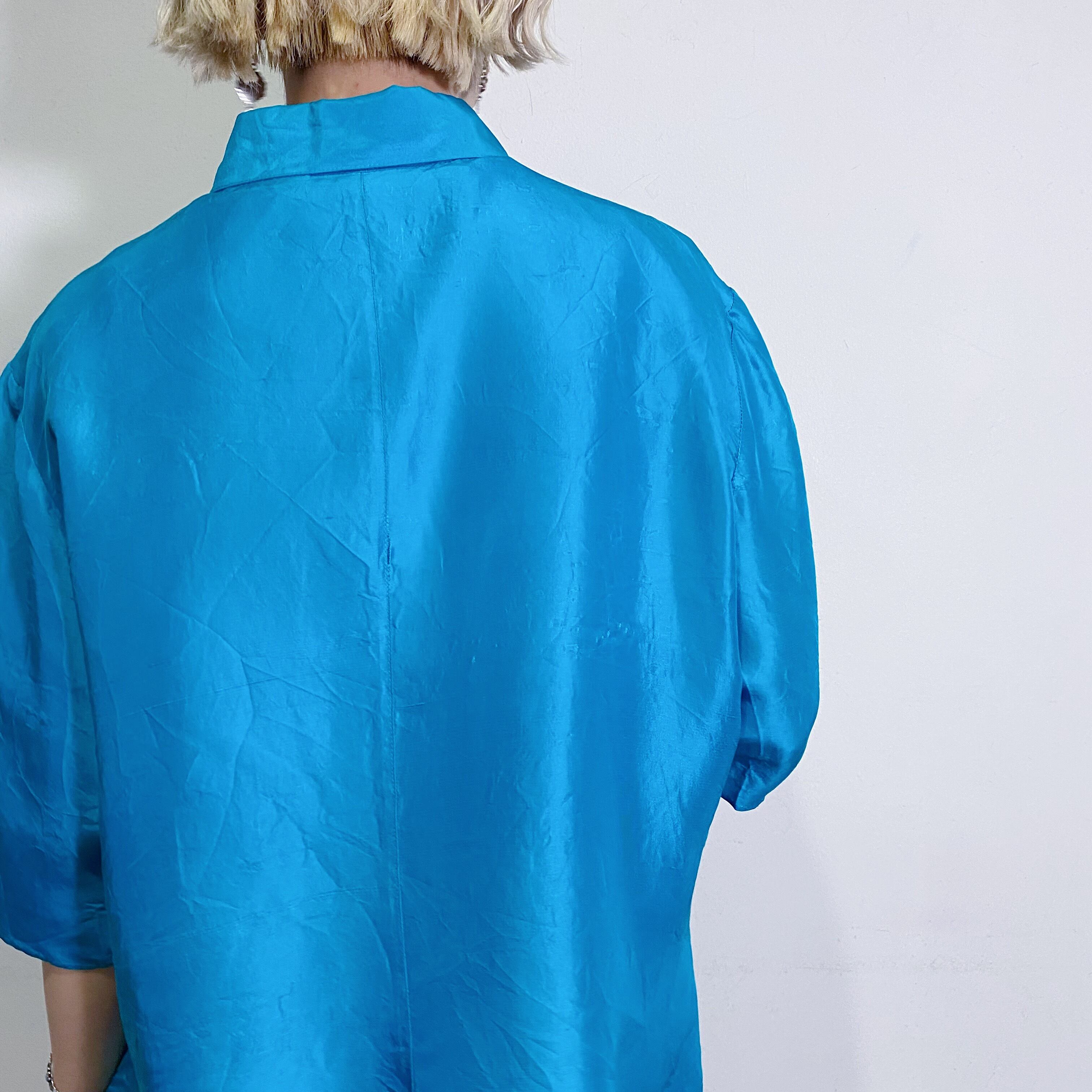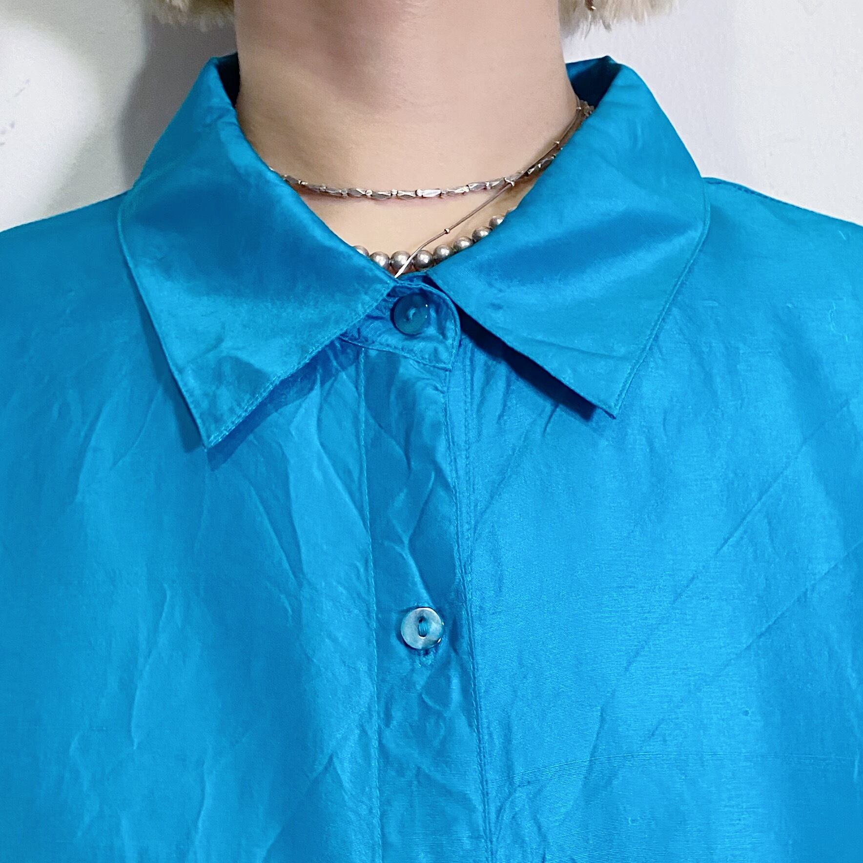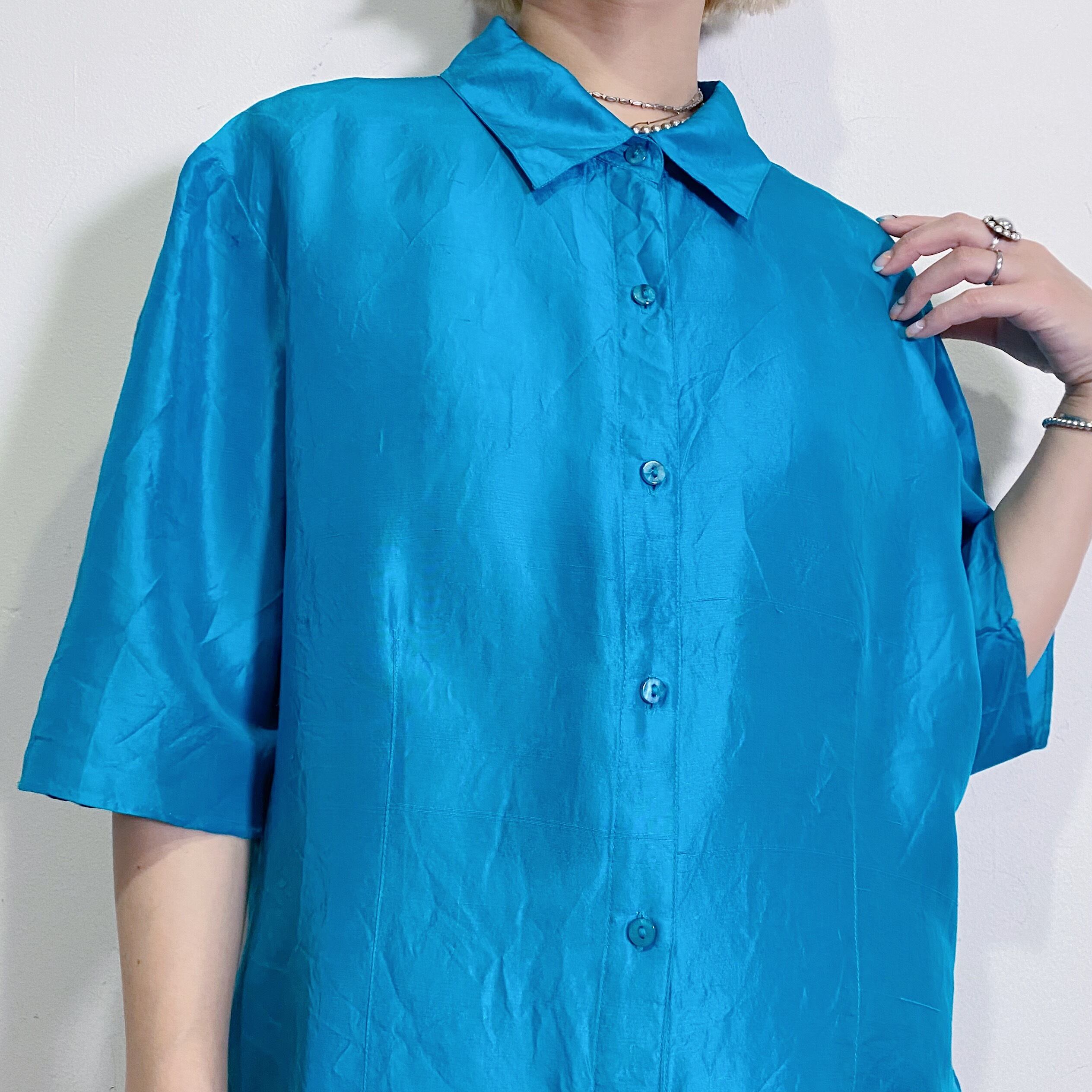 ターコイズの色合いが珍しくて可愛い、シルク素材の半袖シャツです。