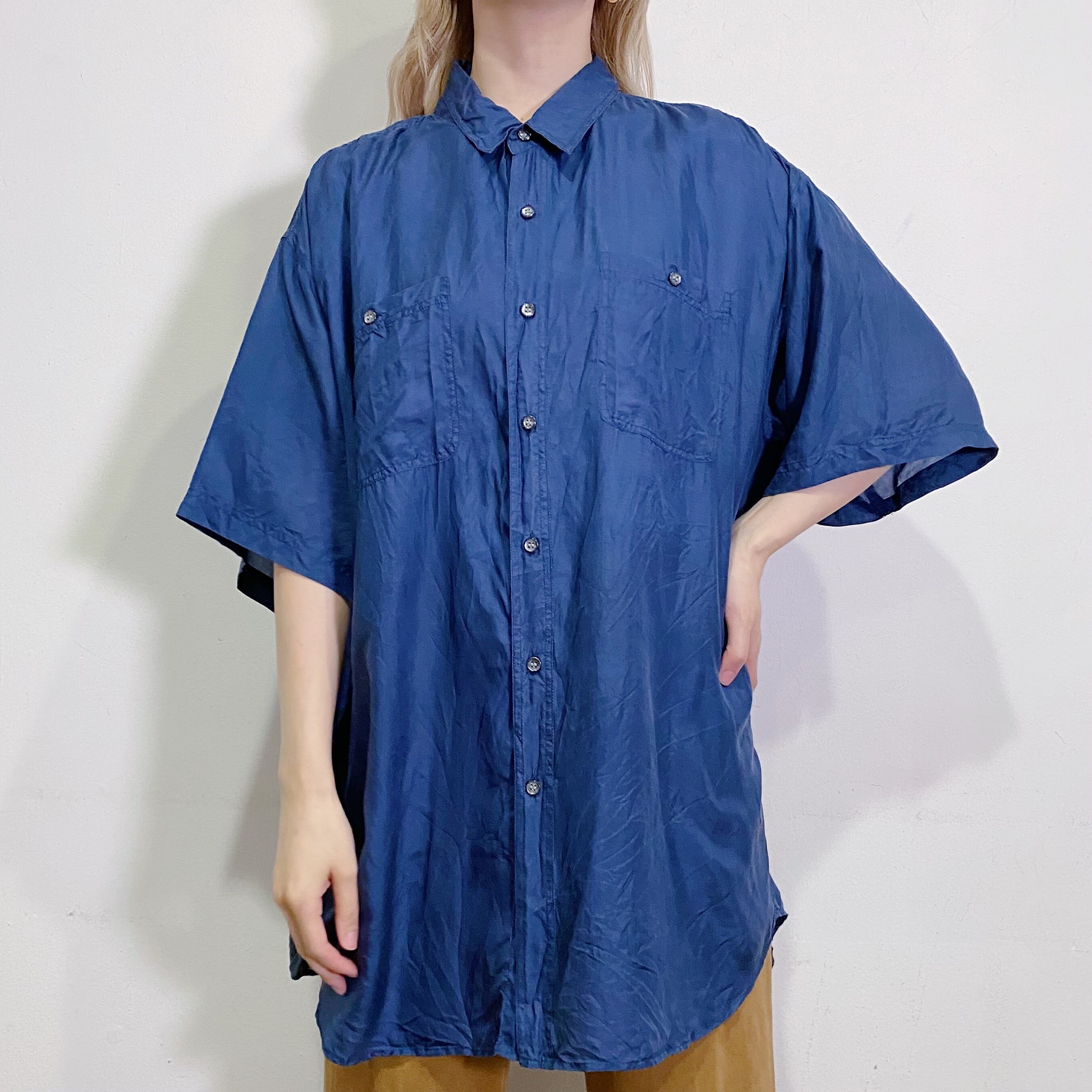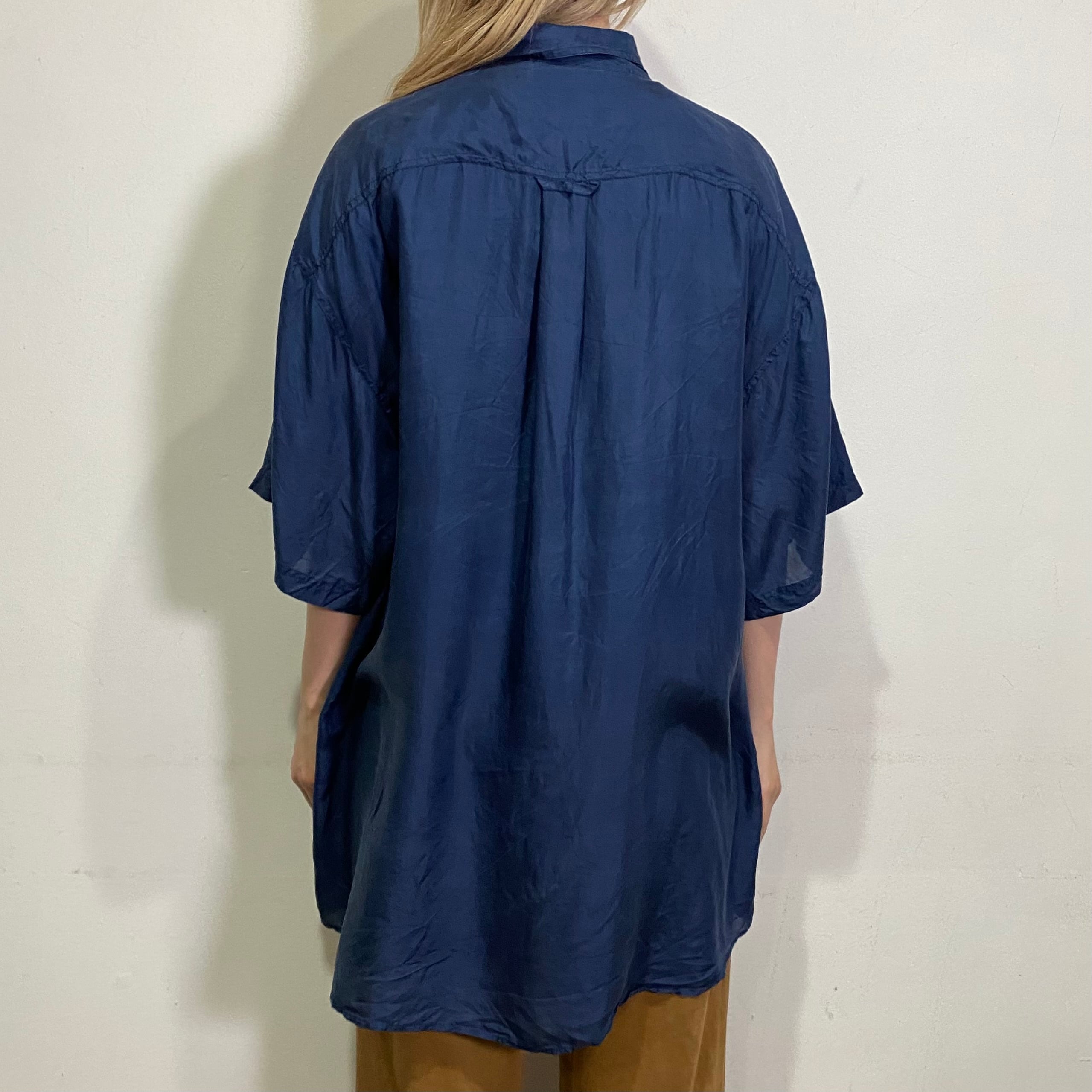 ネイビーの色が使い勝手抜群の、シルク素材の半袖シャツです。