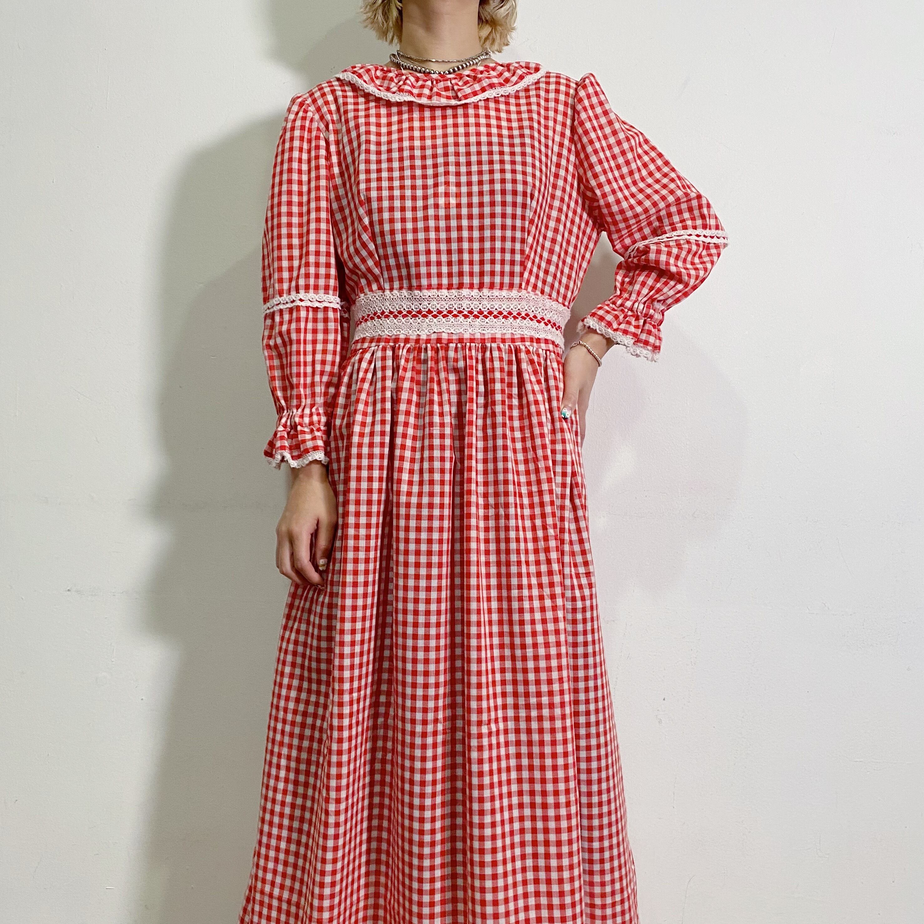 赤×白ギンガムチェックにレースの組み合わせが可愛い、70年代のロングワンピースです。