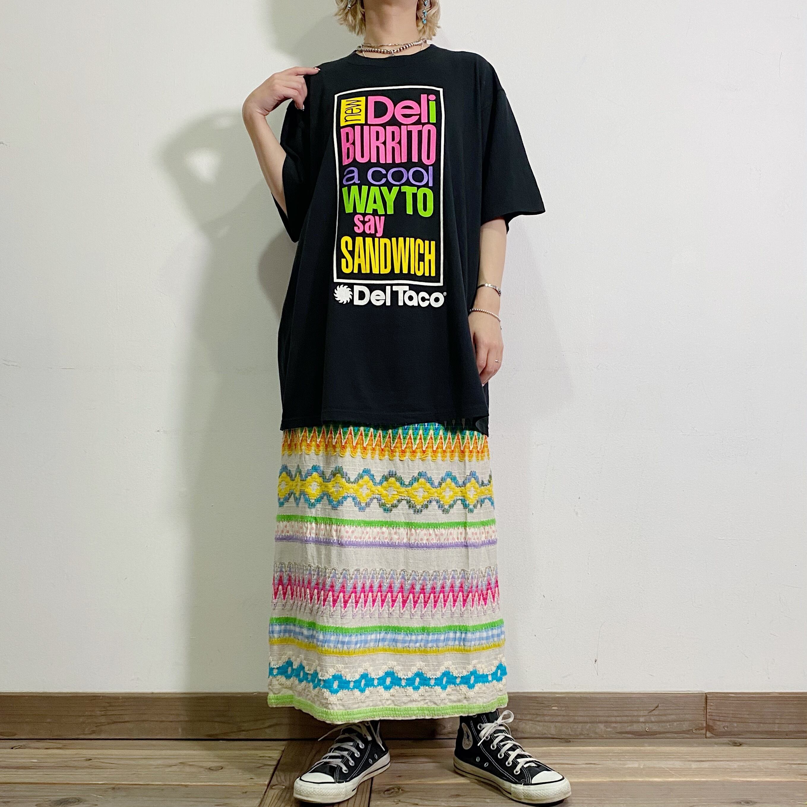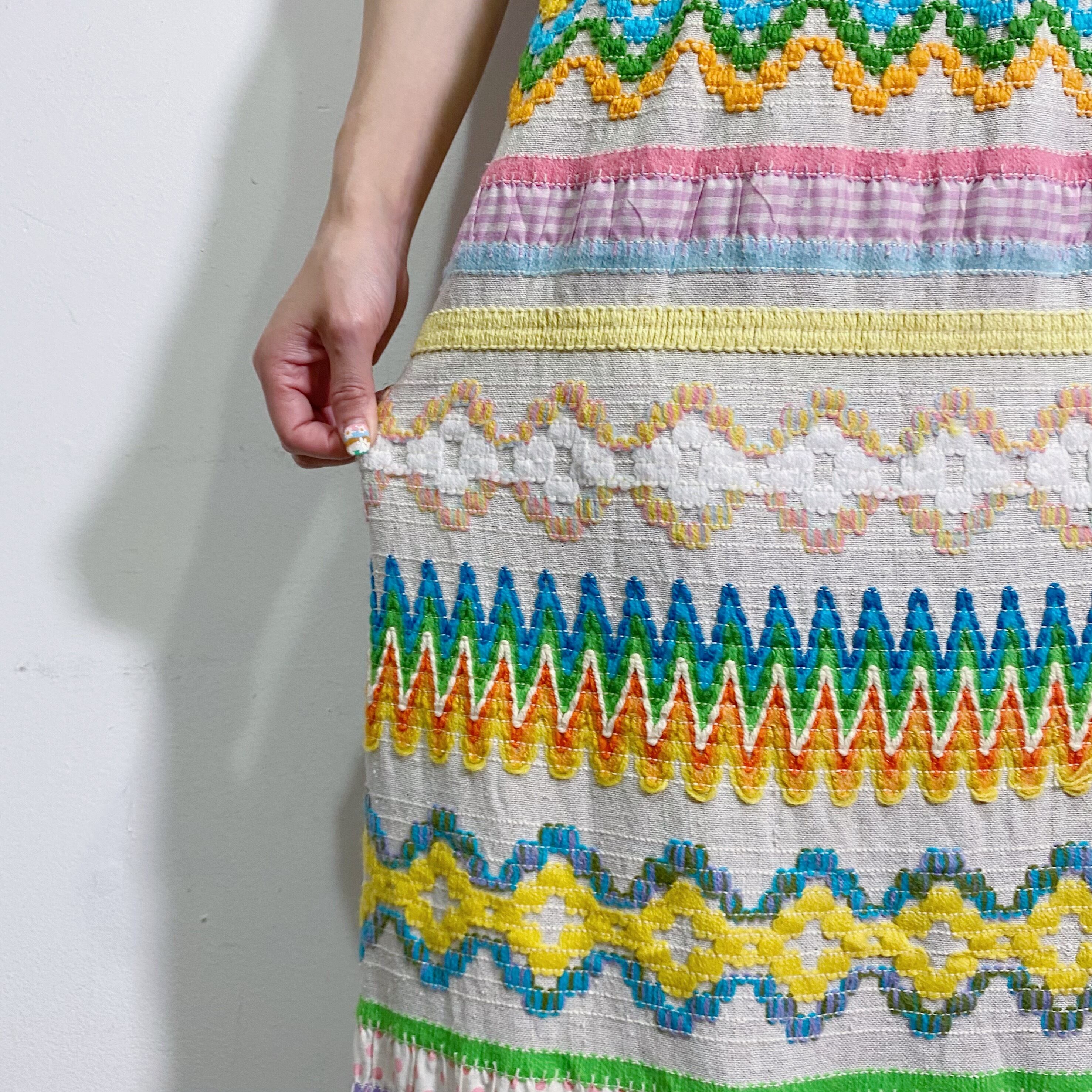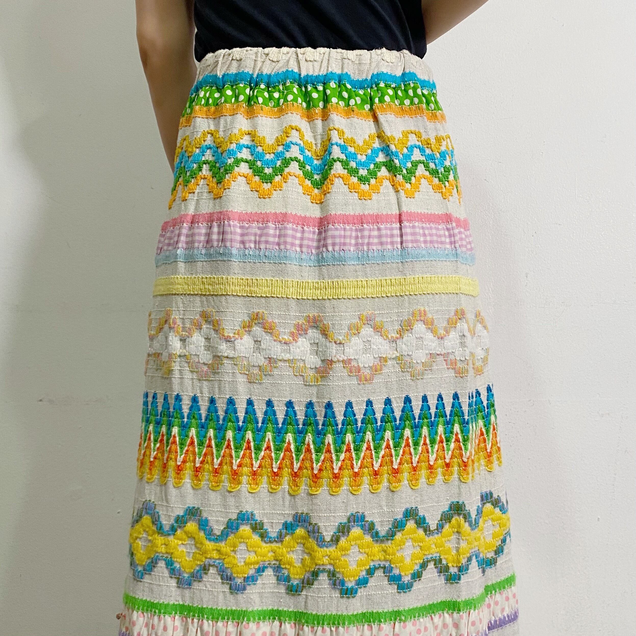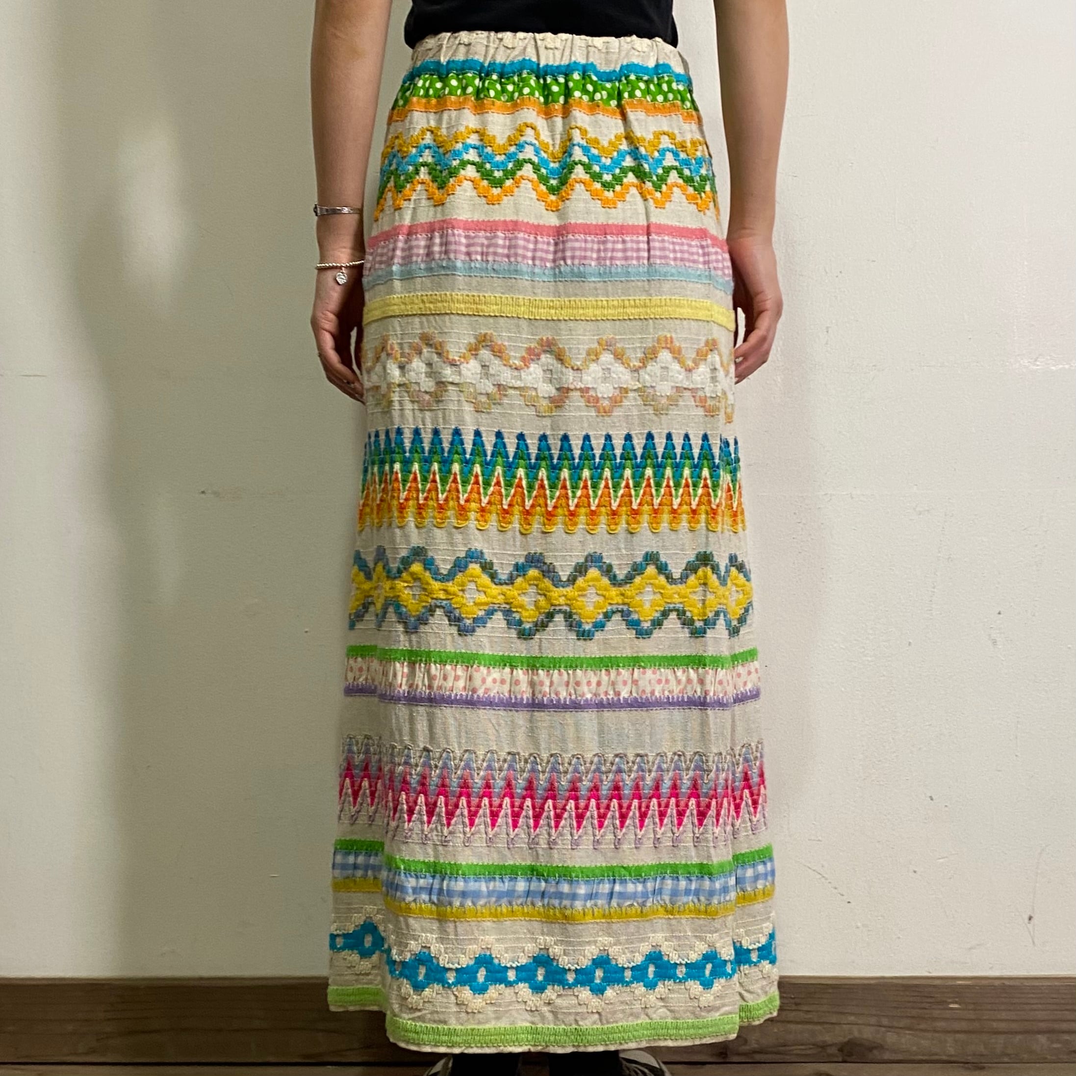 カラフルで色んな刺繍デザインがハッピーでとっても可愛い、70年代のロングスカートです。