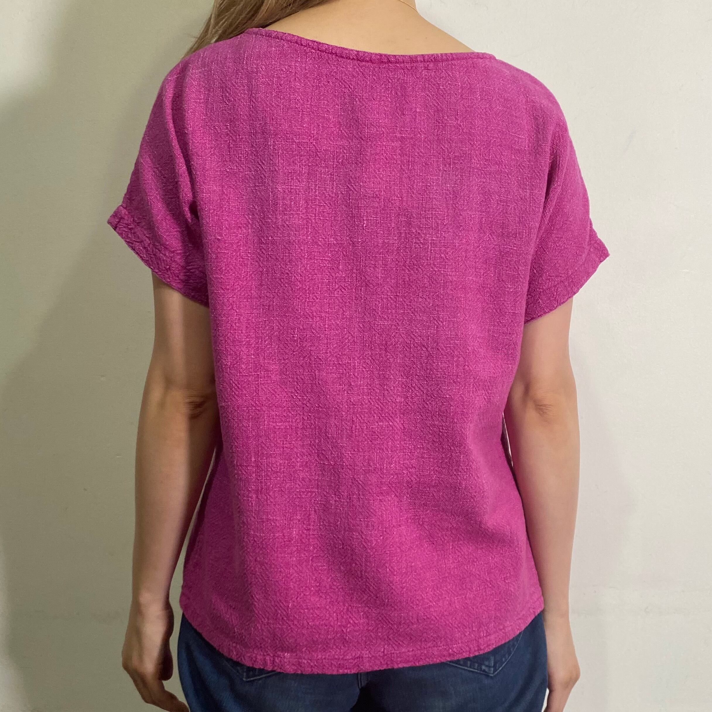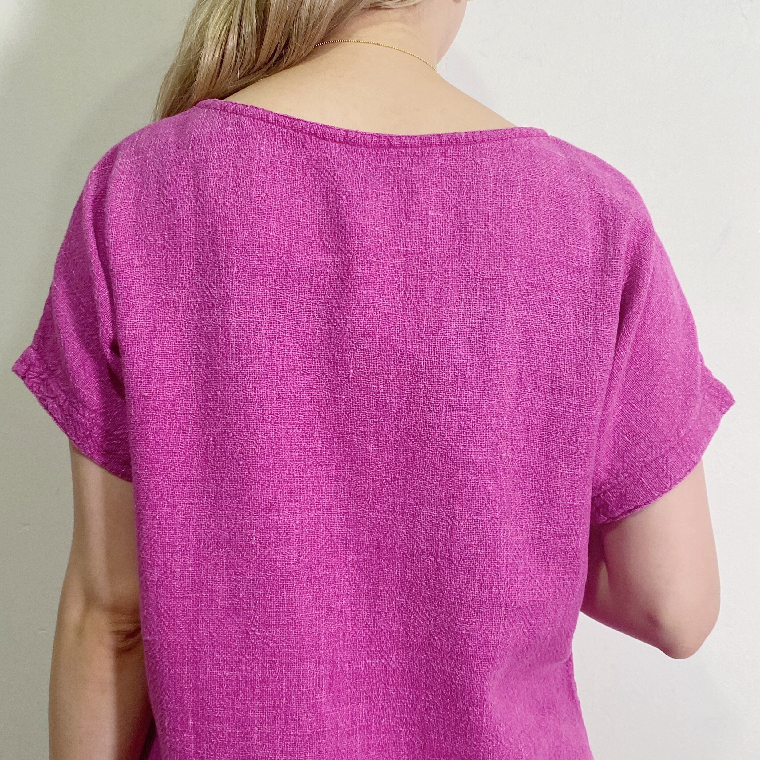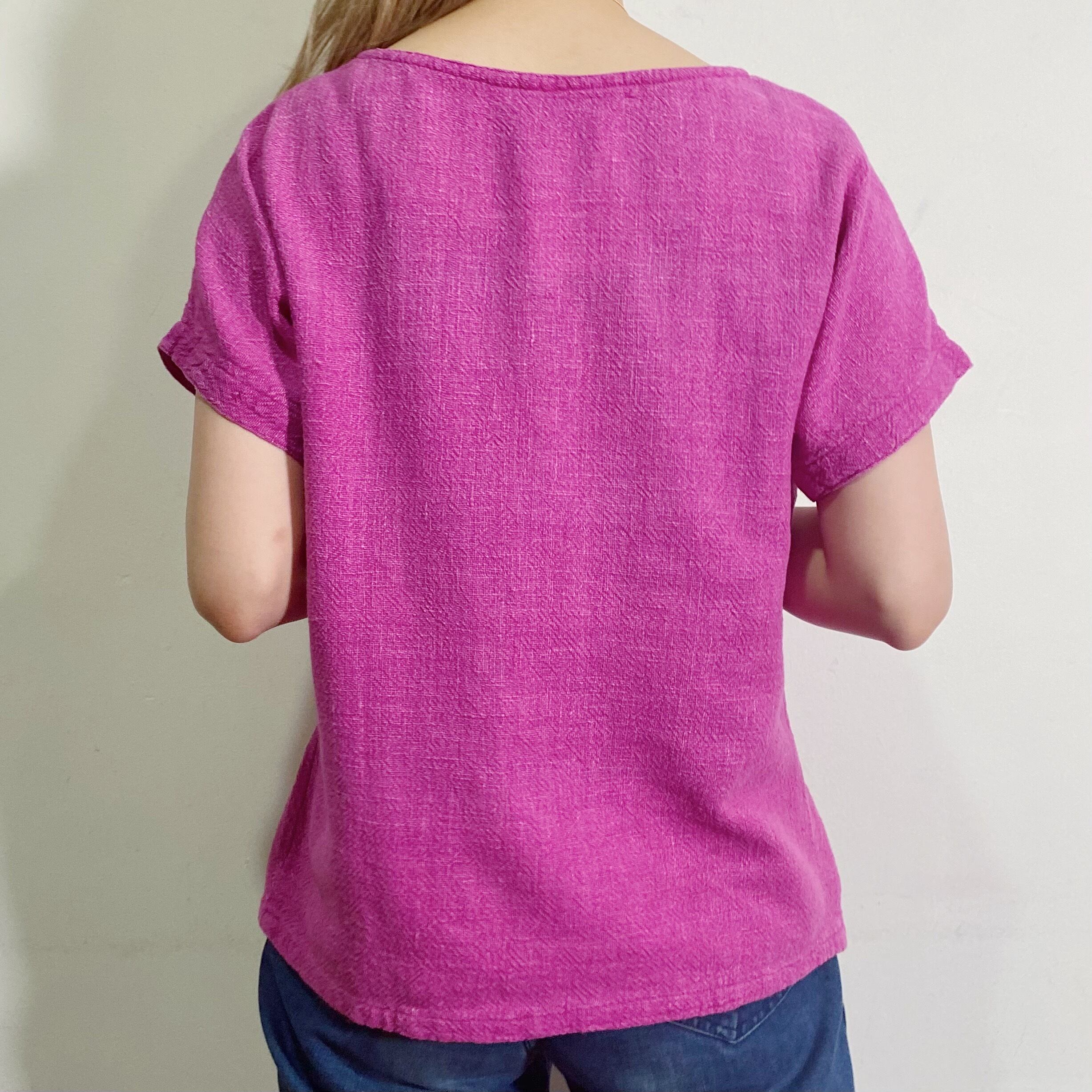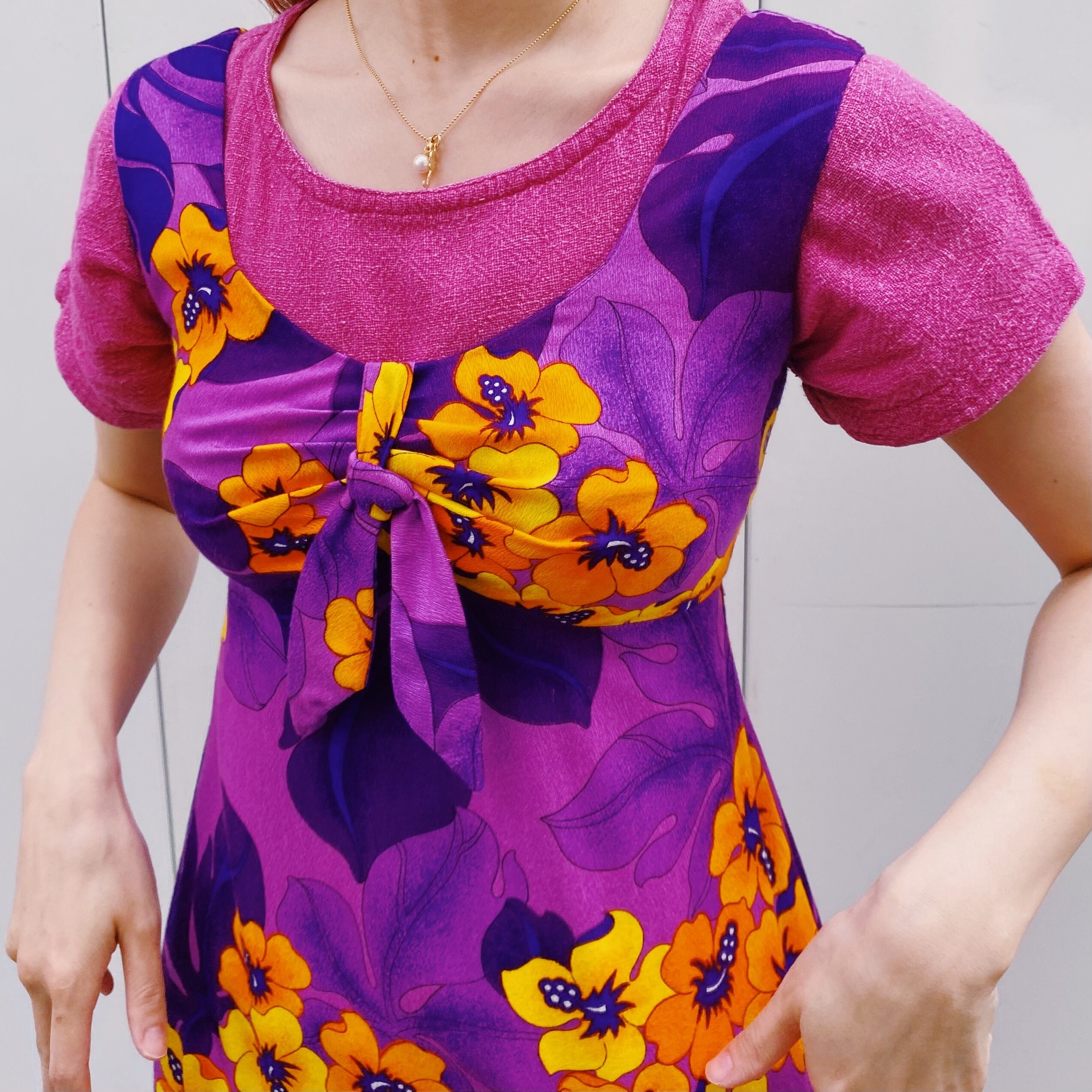 パープルとピンクの中間のような絶妙な色合いが可愛い、70年代の半袖トップスです。