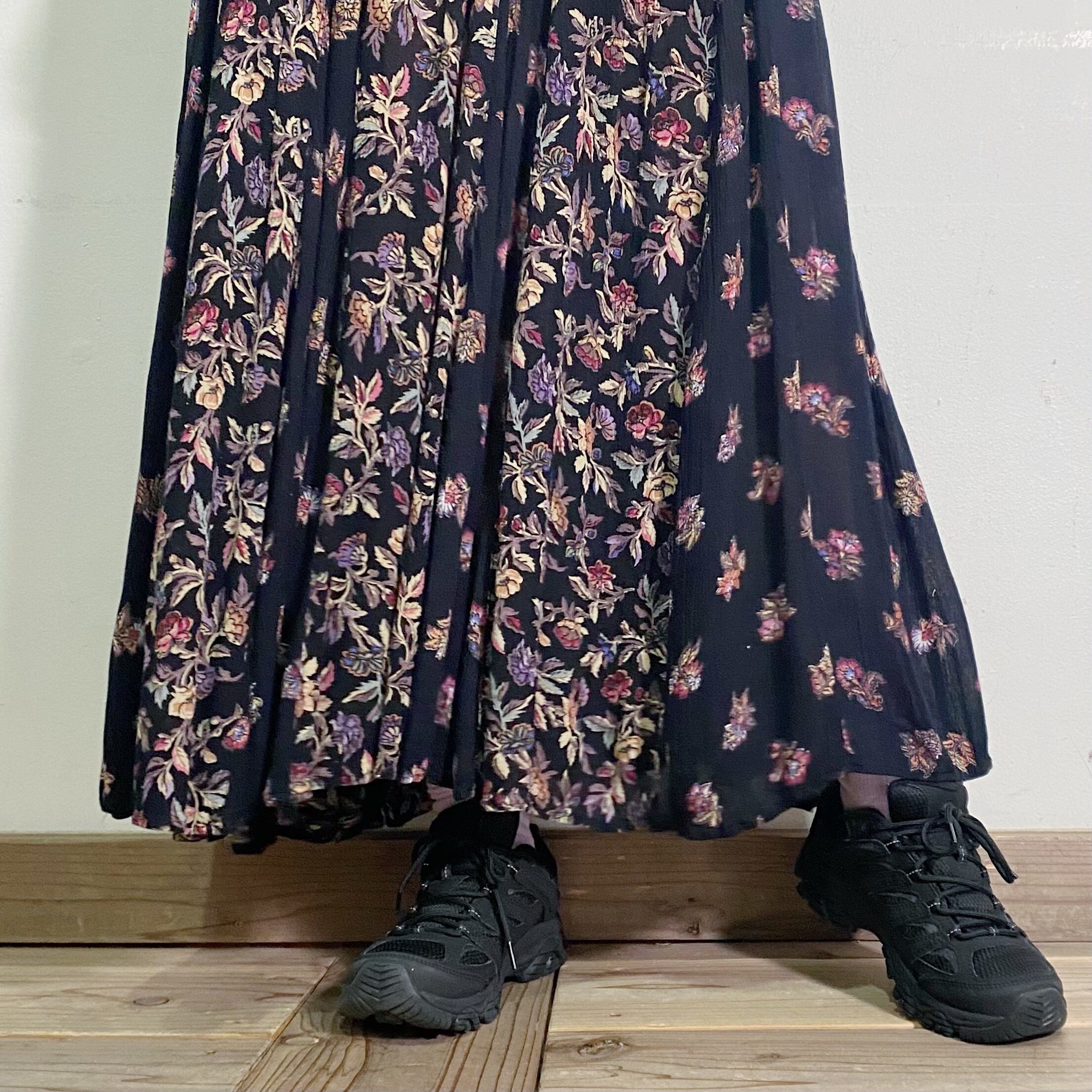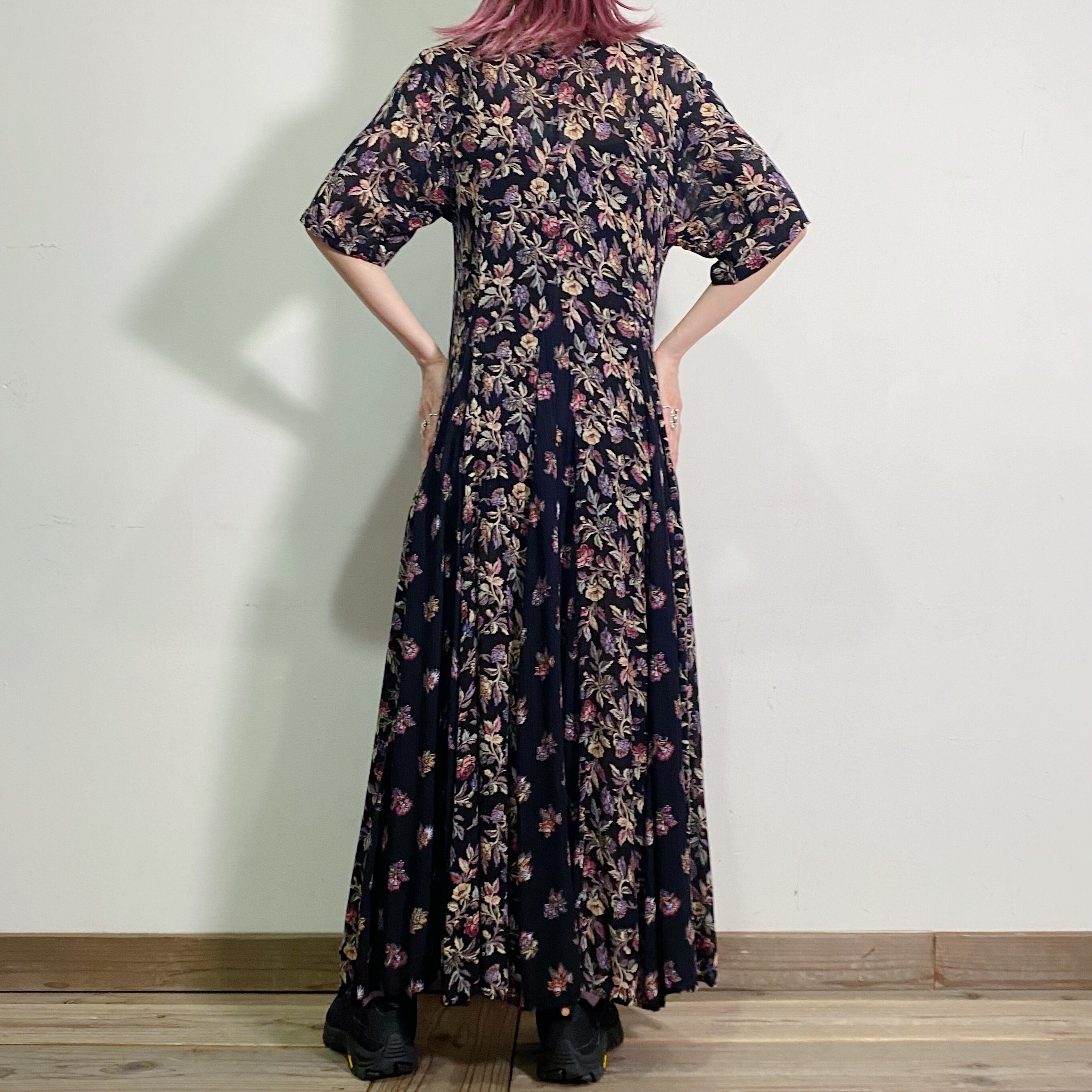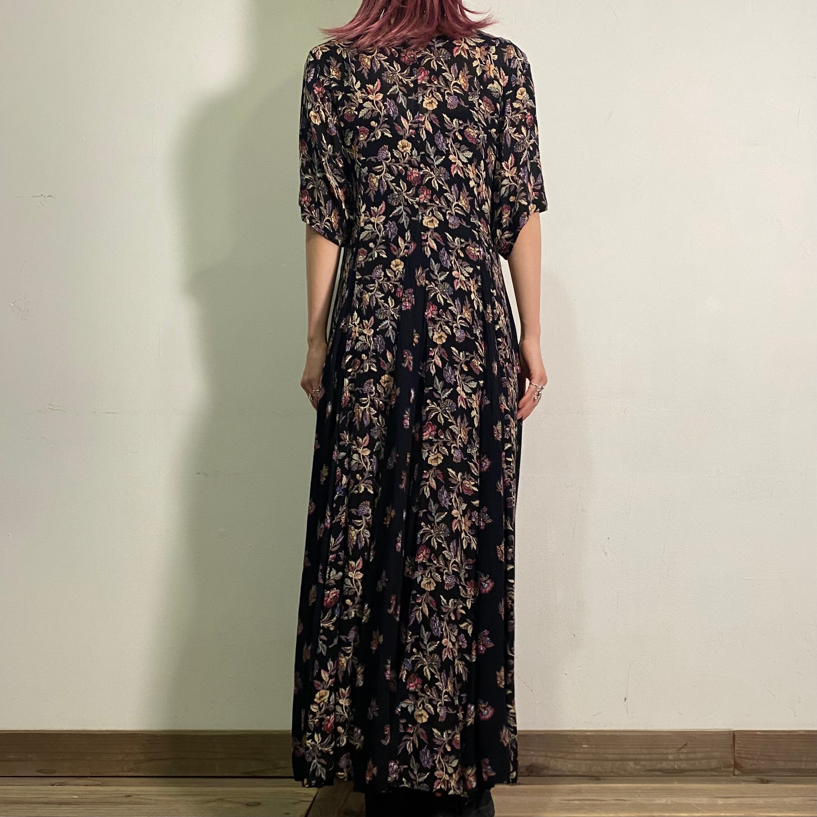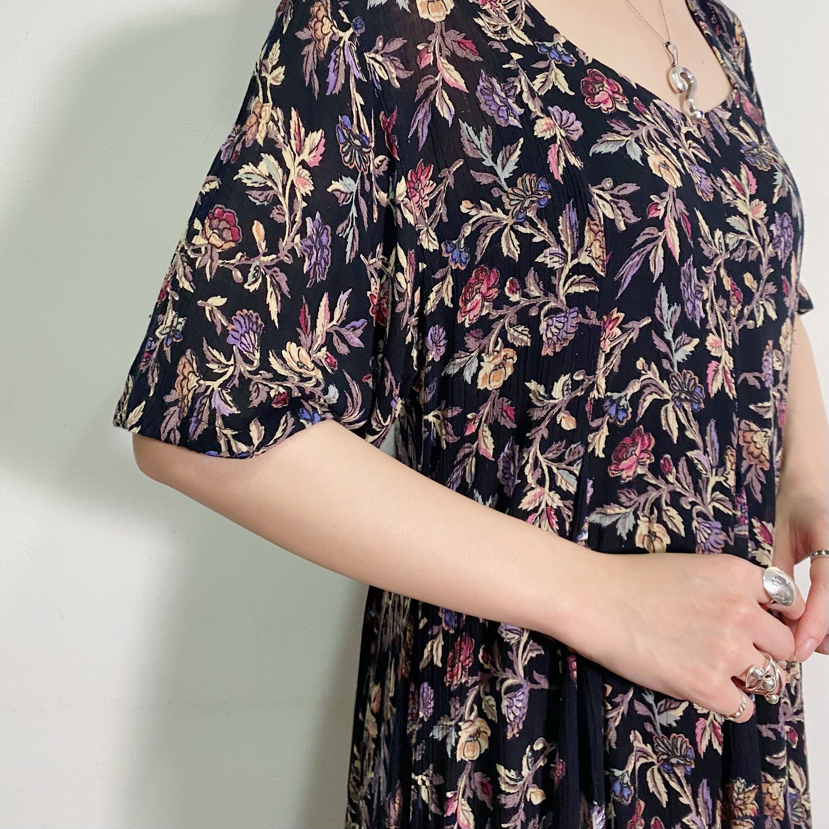 ブラックベースに花柄が大人可愛い、レーヨンワンピースです。