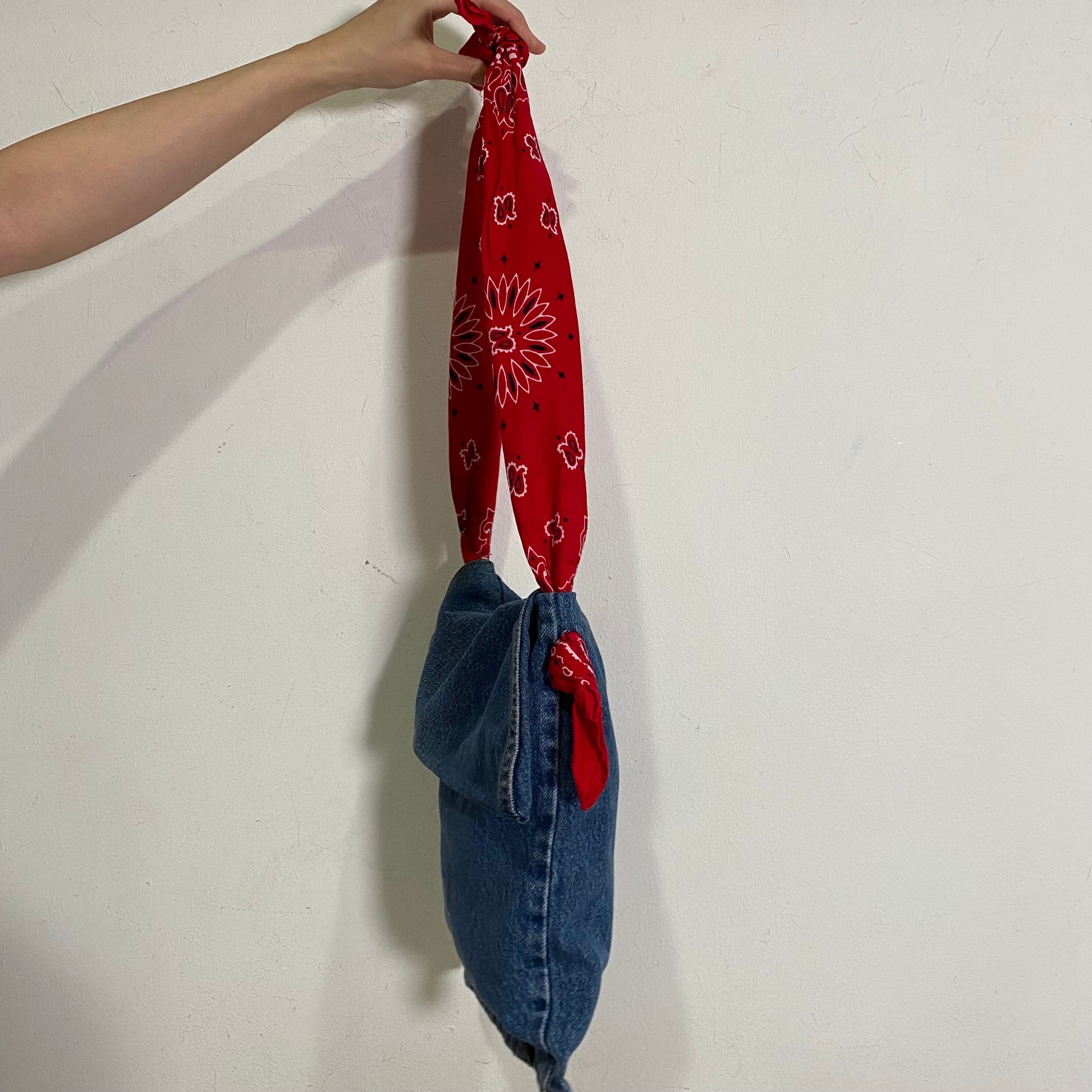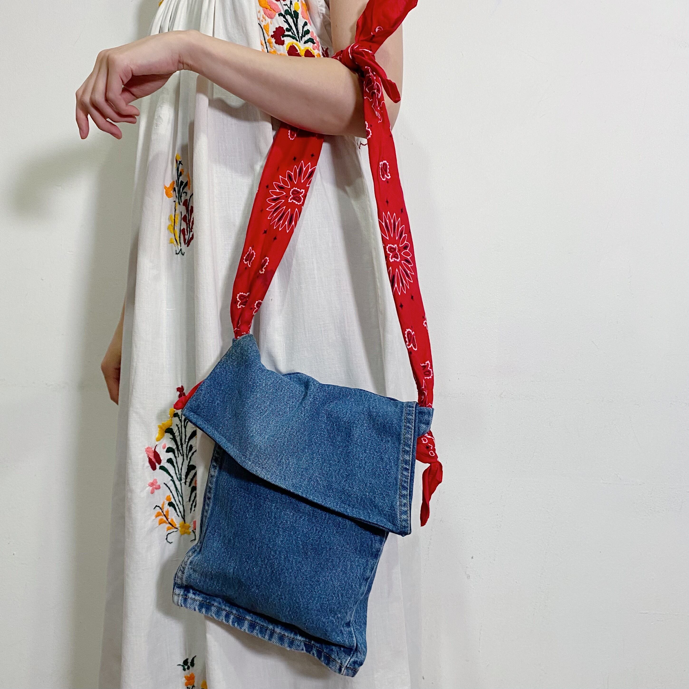 デニムと赤バンダナの組み合わせが可愛い、ショルダーバッグです。