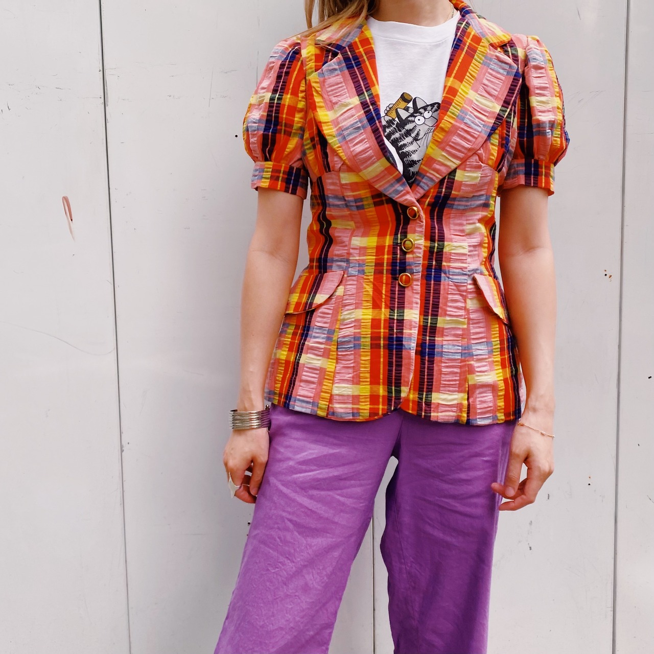シンプルにデニムに合わせるだけでも可愛いですが、柄ボトムスなどとも相性良く着ていただけます。