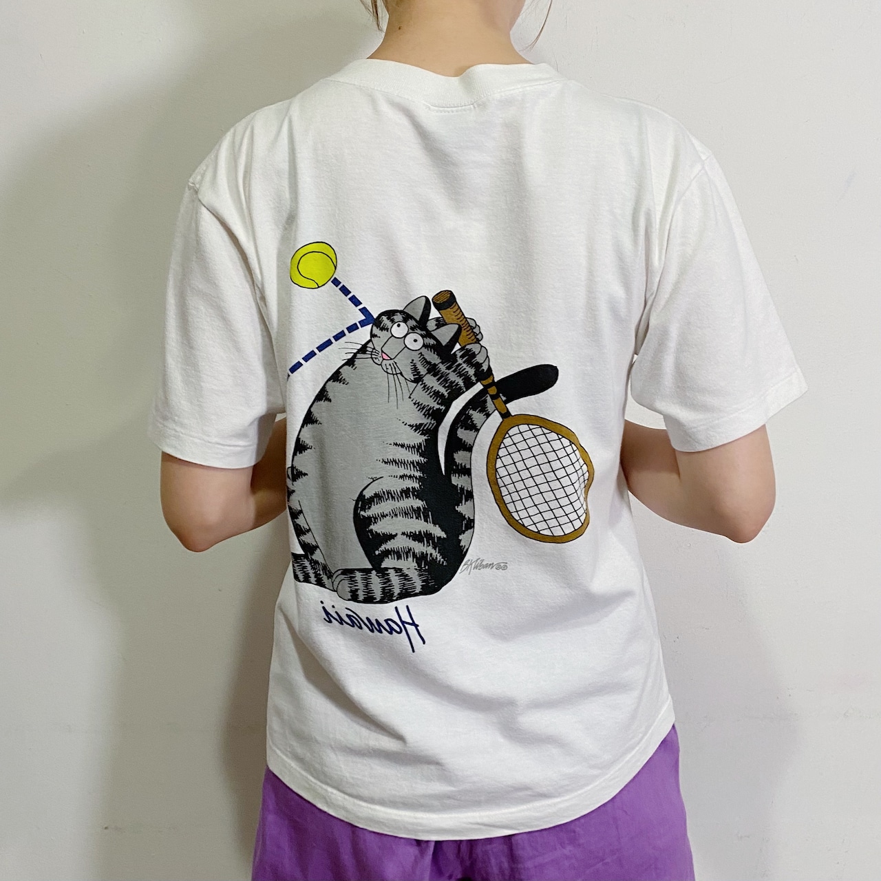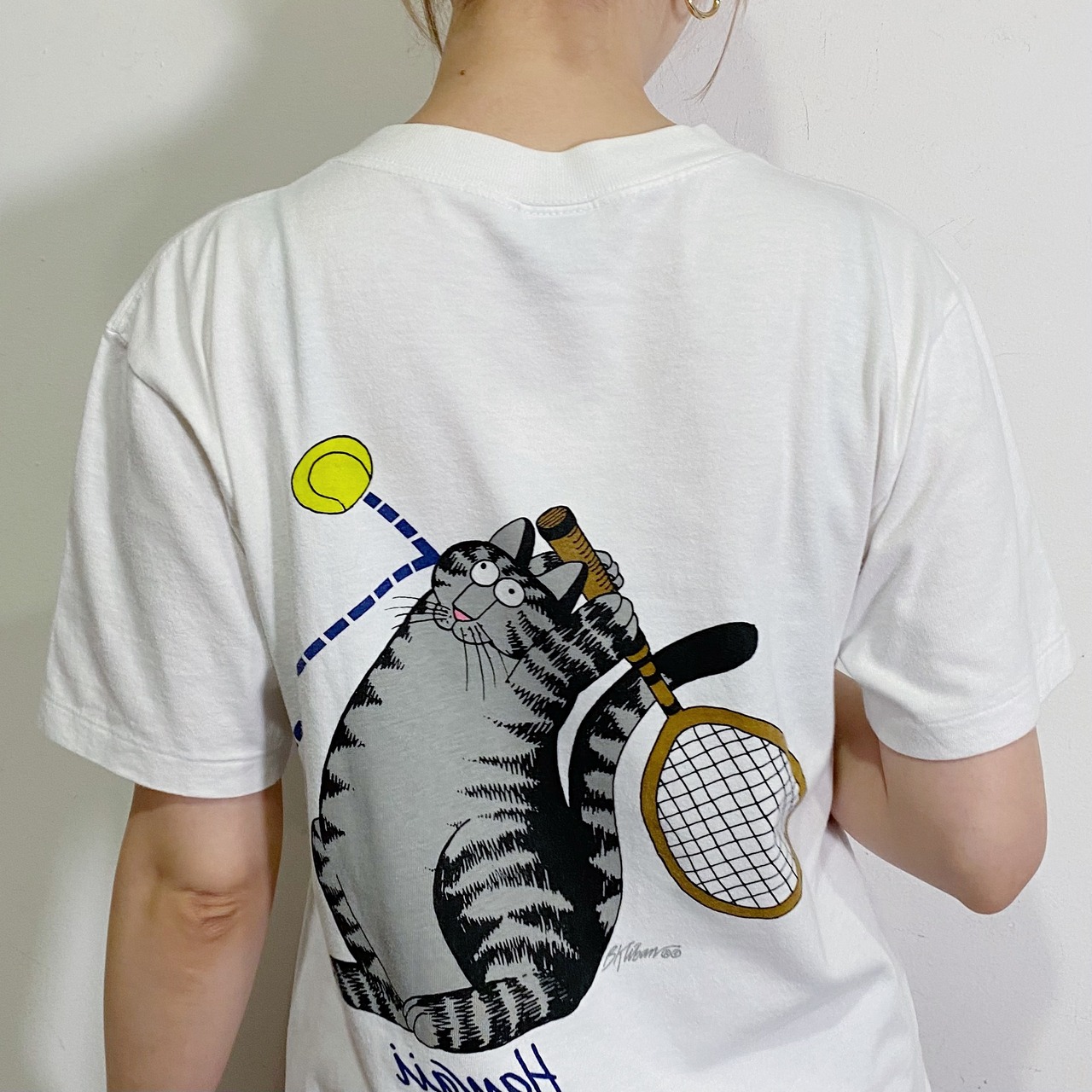 フロントとバックの猫がテニスボールを打ち合っている、なんとも愛らしいデザイン。