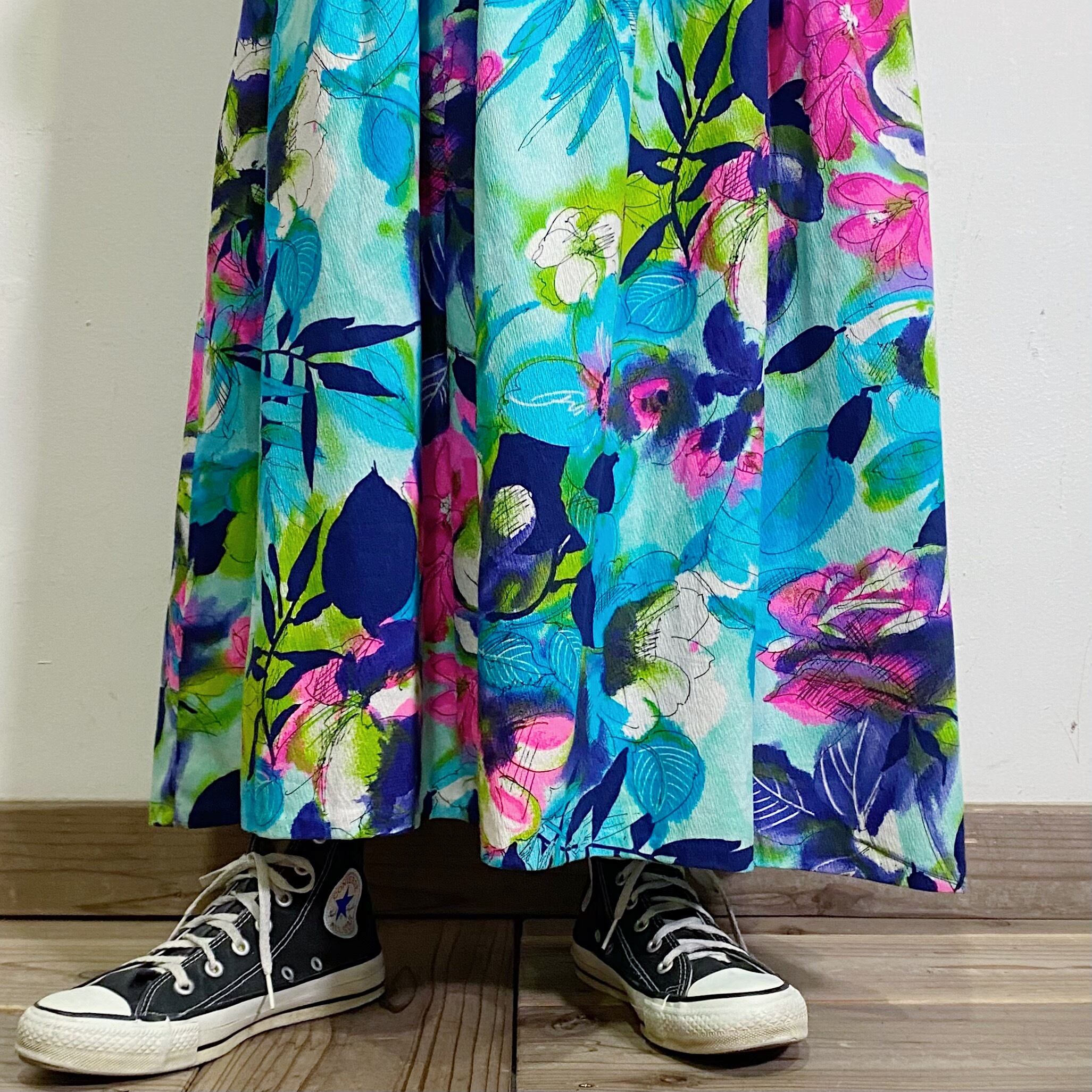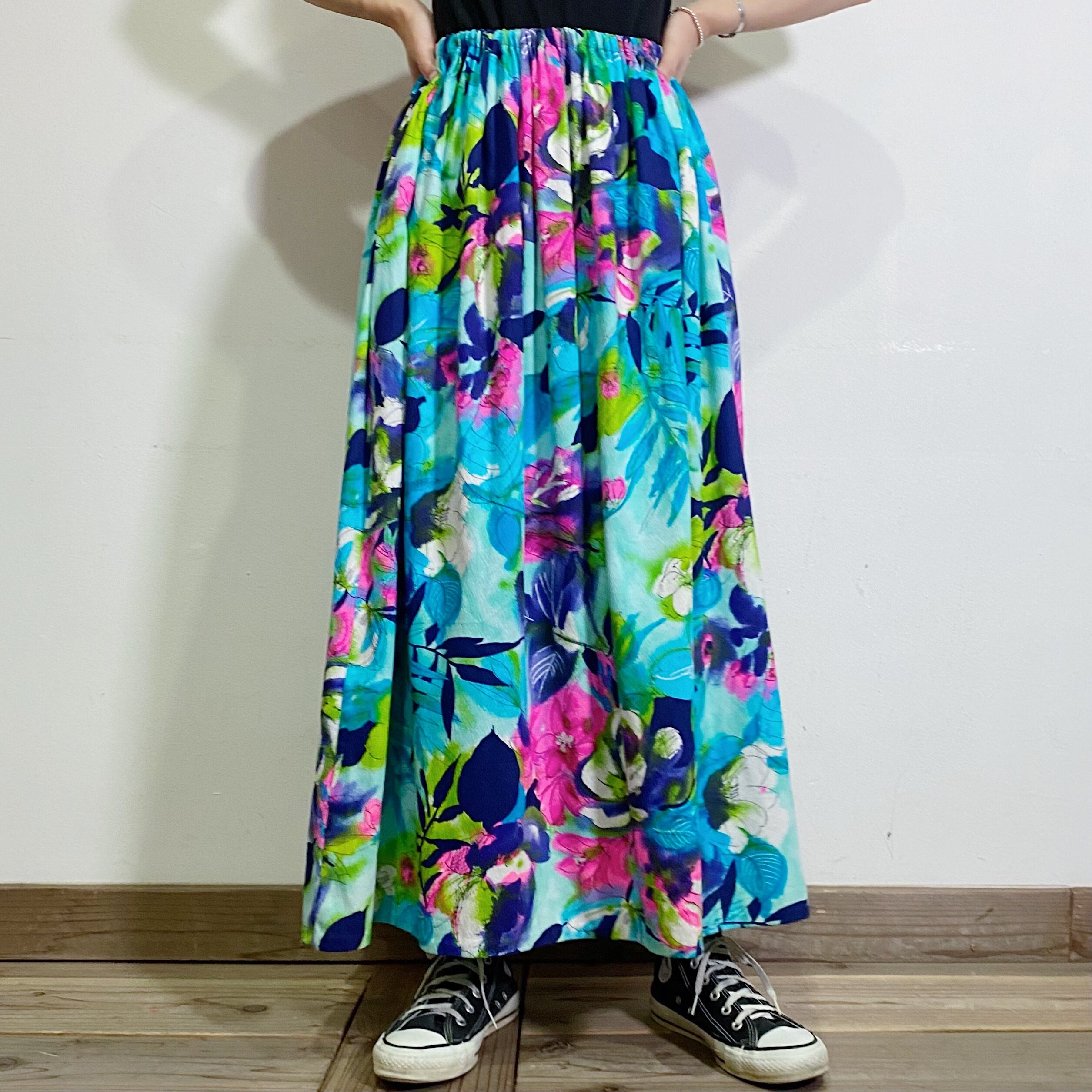 70s blue flower printed long skirt